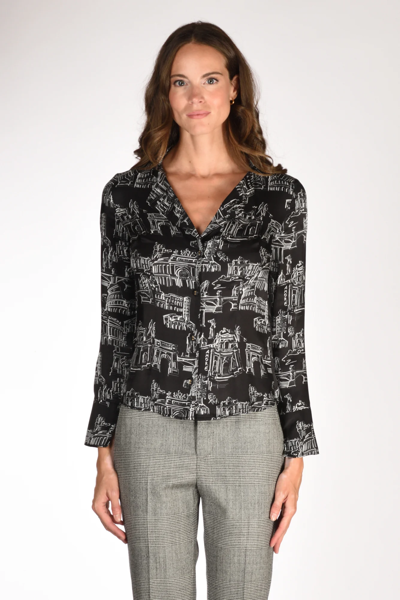 Camicia Stampata, Scollo Profondo A Rever, Manica Lunga, Polso Alto Con Spacchetto, Chiusura Bottoni A Vista Ricoperti, Slim Fit, Vestibilita’ Ridotta, Made In Italy, Composizione 75 Viscosa 25 Seta
