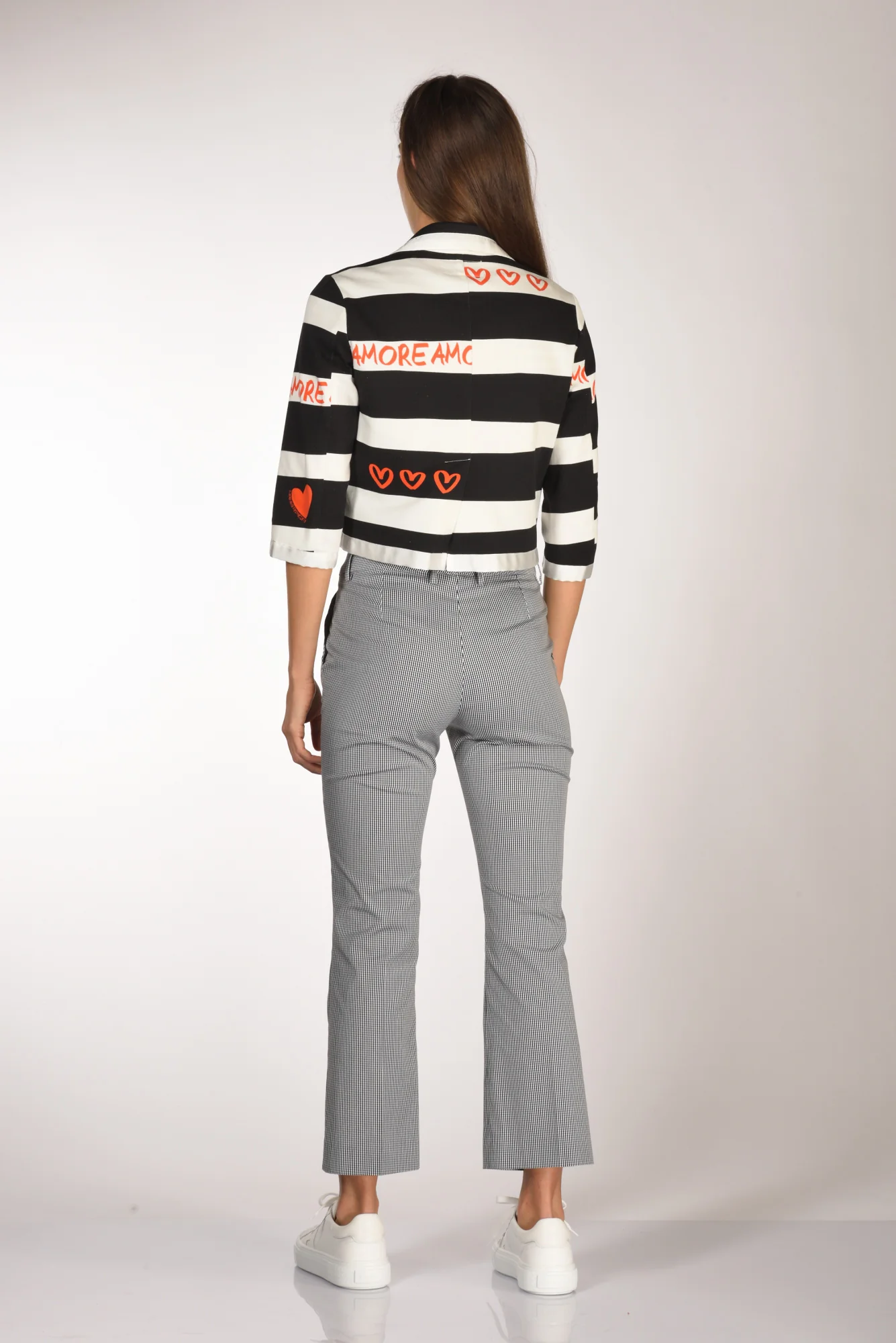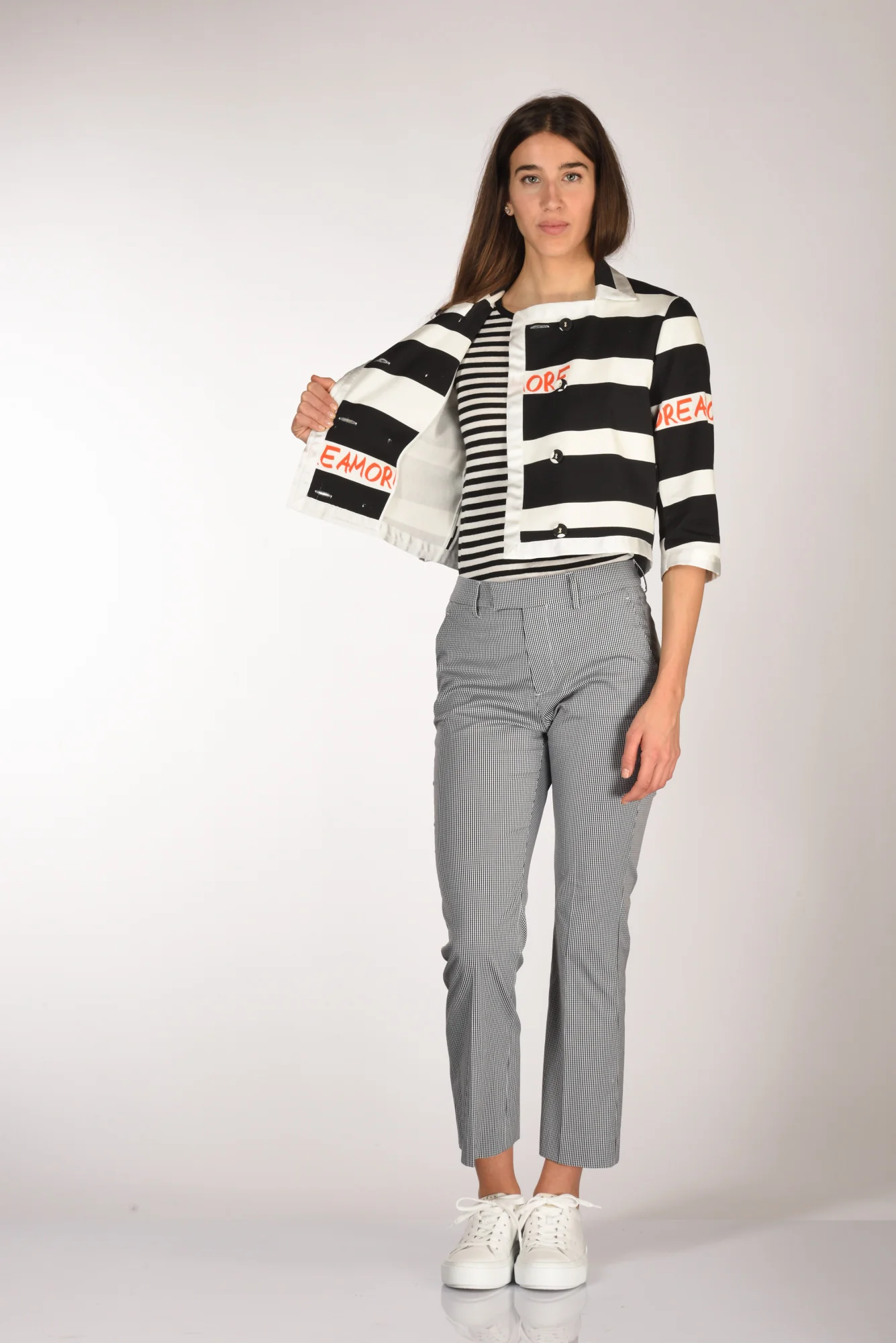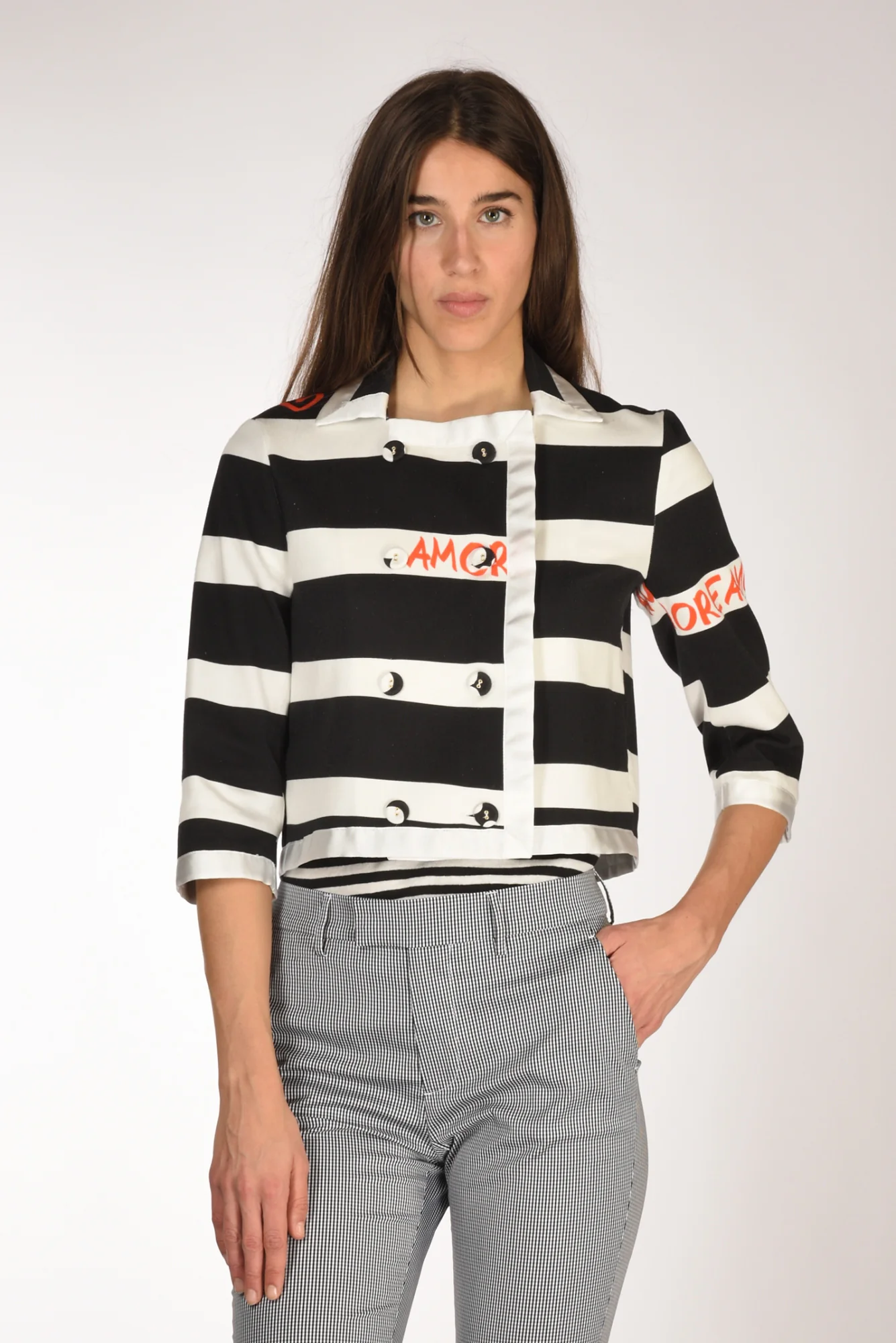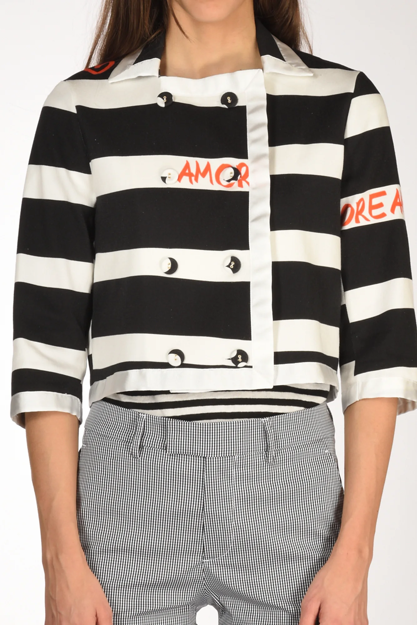 Giacca Crop Doppio Petto A Righe, Chiusura Bottoni Rcoperti A Vista, Manica 3/4, Spacco Posteriore Centrale, Profilo In Raso, Scritte A Contrasto Colore, Vestibilita’ Regular, Made In Italy, Composizione 98 Cotone, 2 Elastan