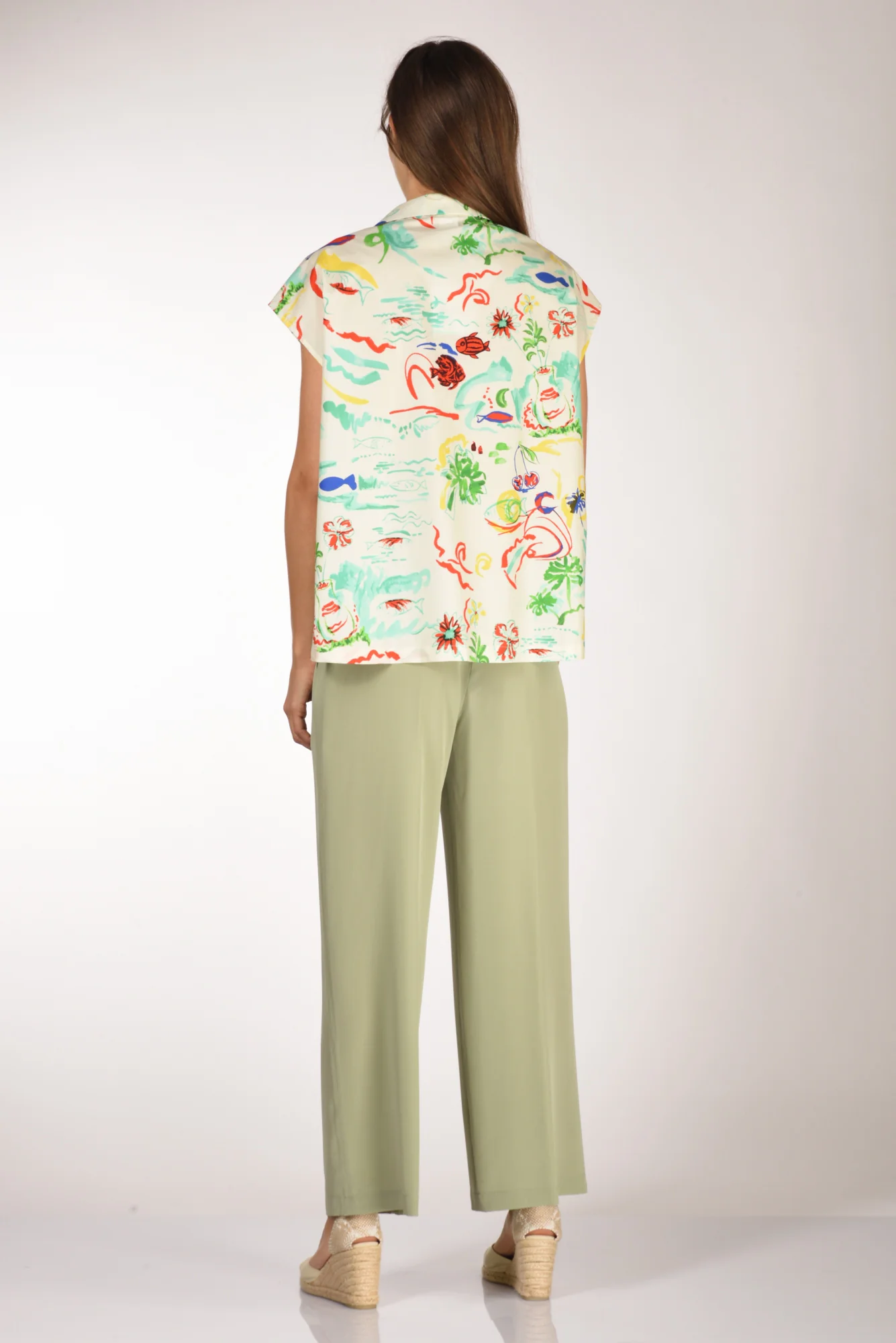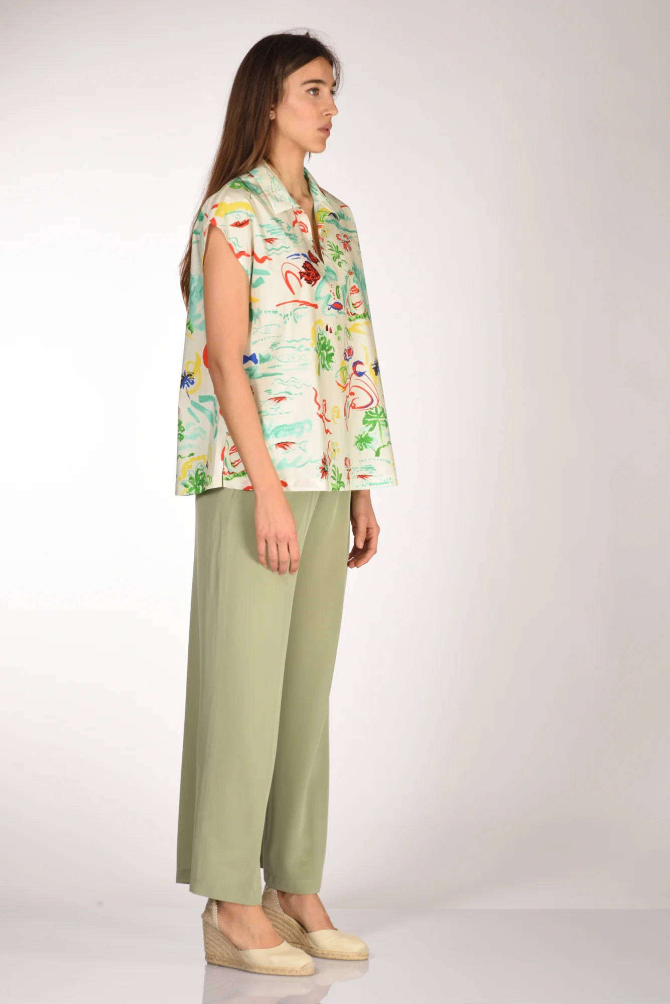 Camicia Over Stampata Realizzata In Popeline Di Cotone, Colletto Classico Con Scollo A V, Spalla Scesa Senza Maniche, Fondo Con Spacchetti, Linea Diritta, Vestibilita’ Over, Made In Romania, Composizione 100 Cotone