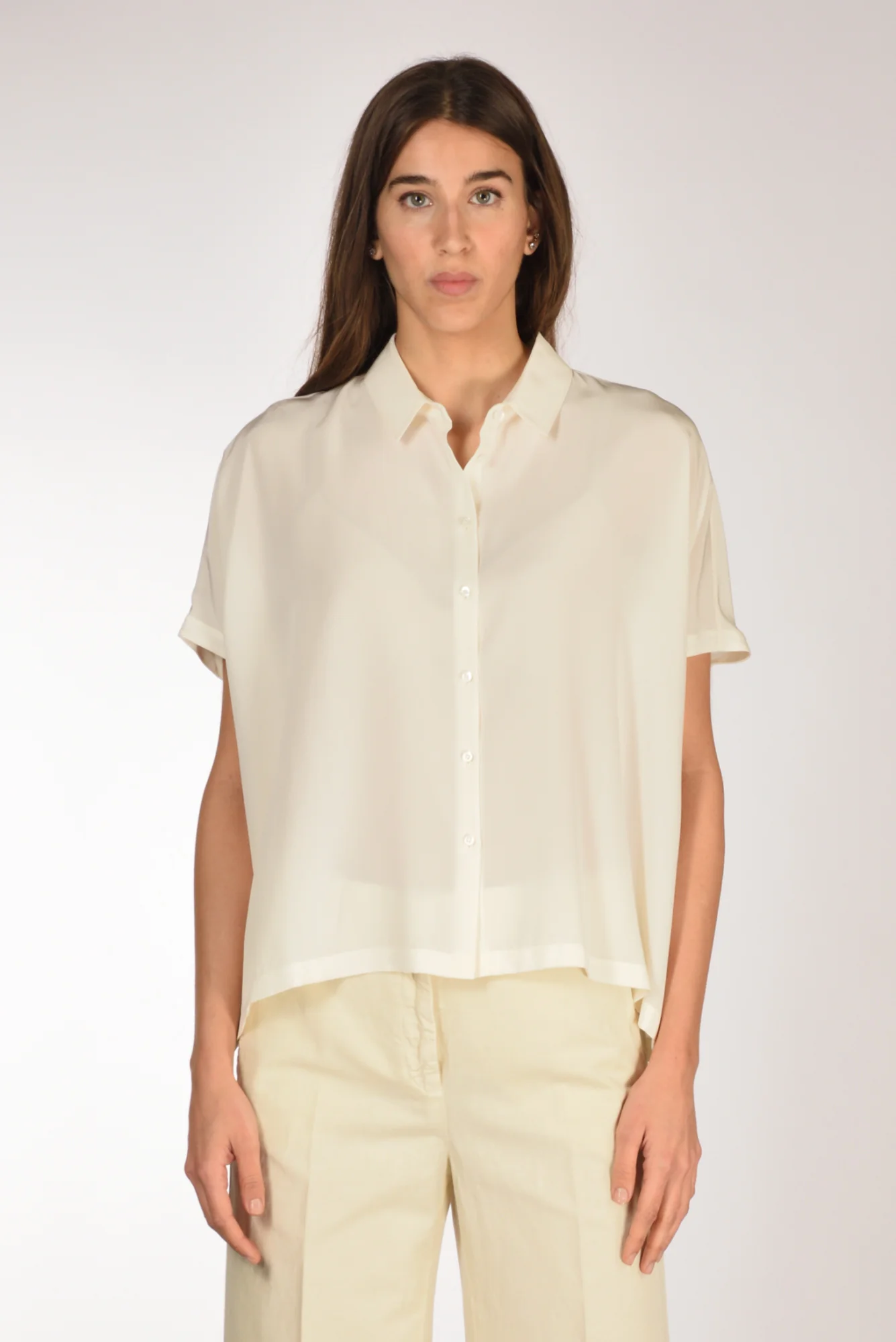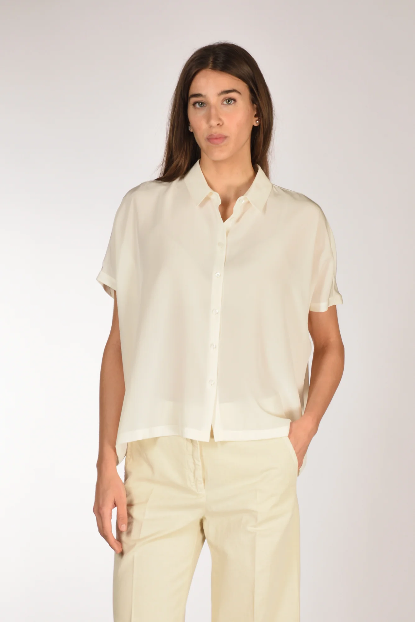 Camicia Over Realizzata In Crepe De Chine, Chiusura Bottoni A Vista, Spalla Scesa Senza Manica, Corpo Dalla Forma Rettangolare, Vestibilita’ Comoda, Made In Cina, Composizione 100 Seta