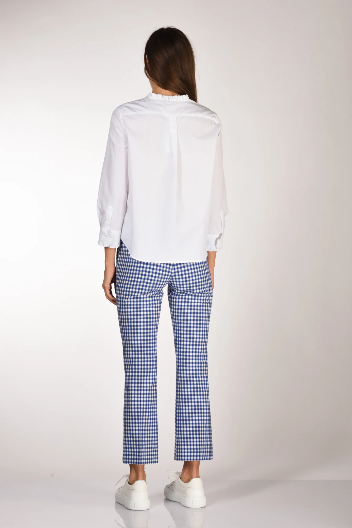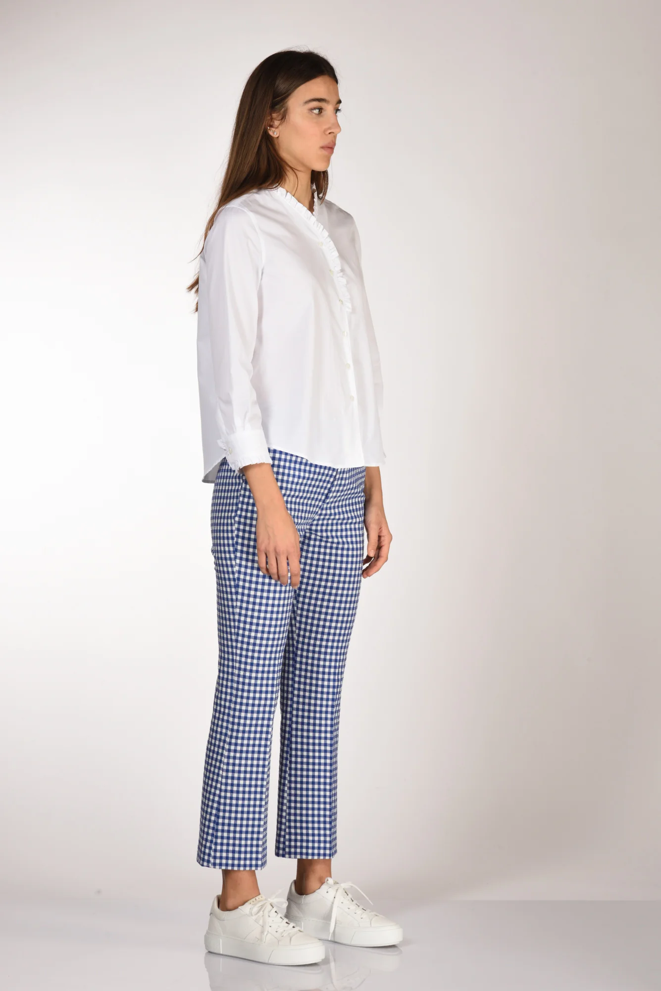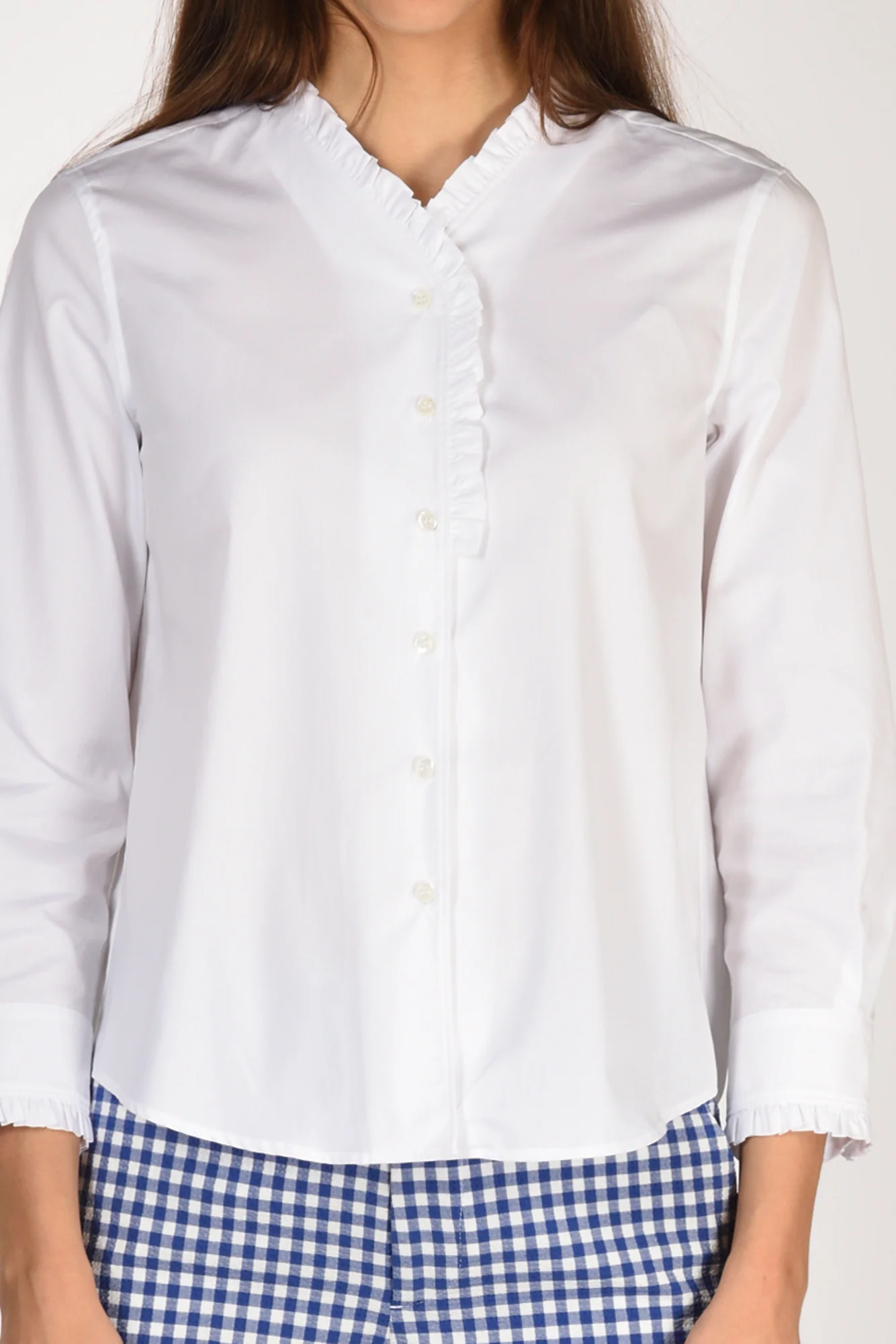 Camicia Scollo A V Profilato Con Rouches, Manica 3/4, Polso Tondo Chiuso Da Bottobe E Profilato Da Rouches, Chiusura Bottoni A Vista, Line Diritta, Cannoncino Centrale Posteriore, Fondo Stondato, Vestibilita’ Regular, Made In Romania, Composizione 100 Cotone