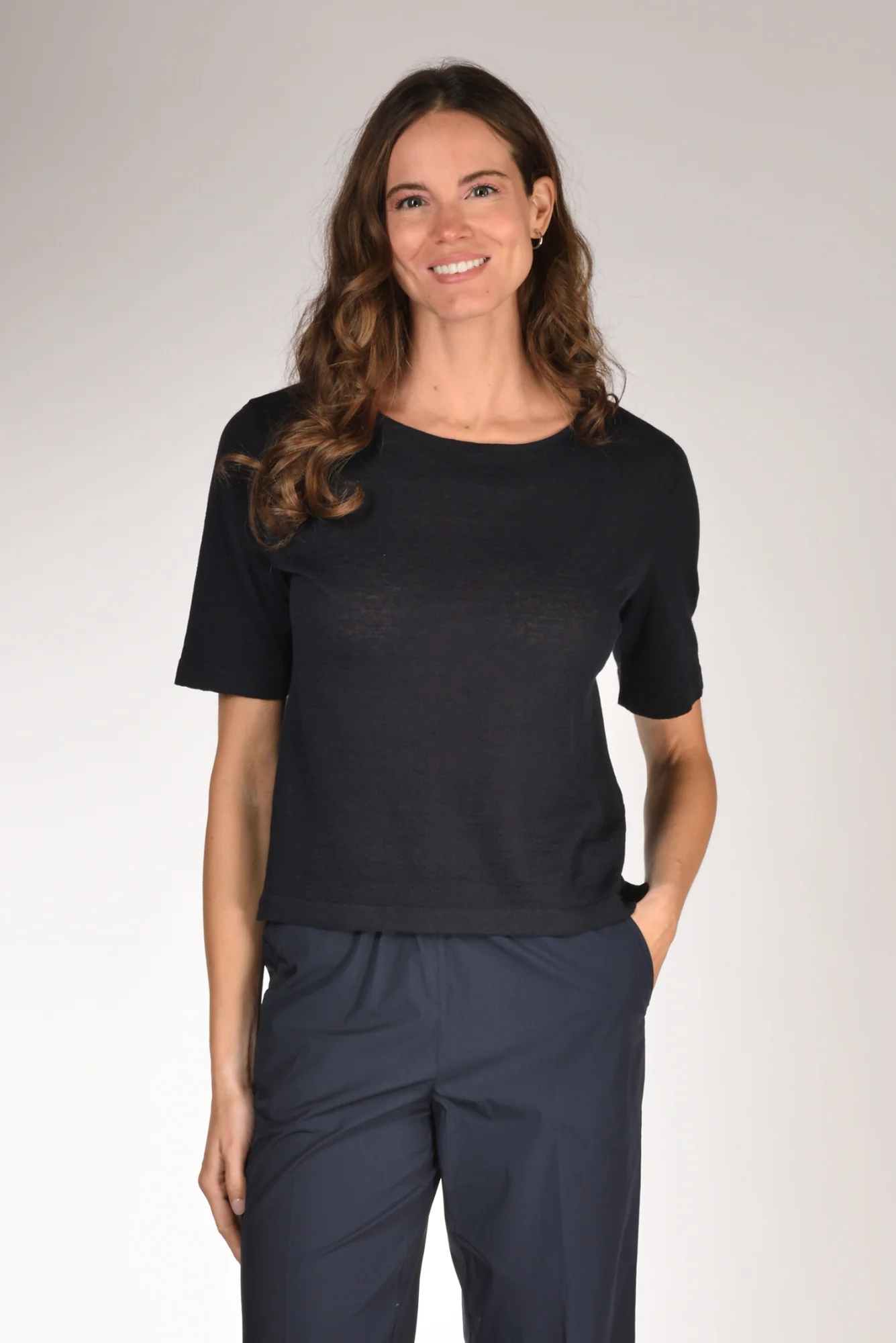 Maglia Manica Al Gomito, Scollo A Barchetta, Linea Boxy, Vestibilita’ Morbida, Made In Italy, Composizione 64 Lino, 36 Cotone