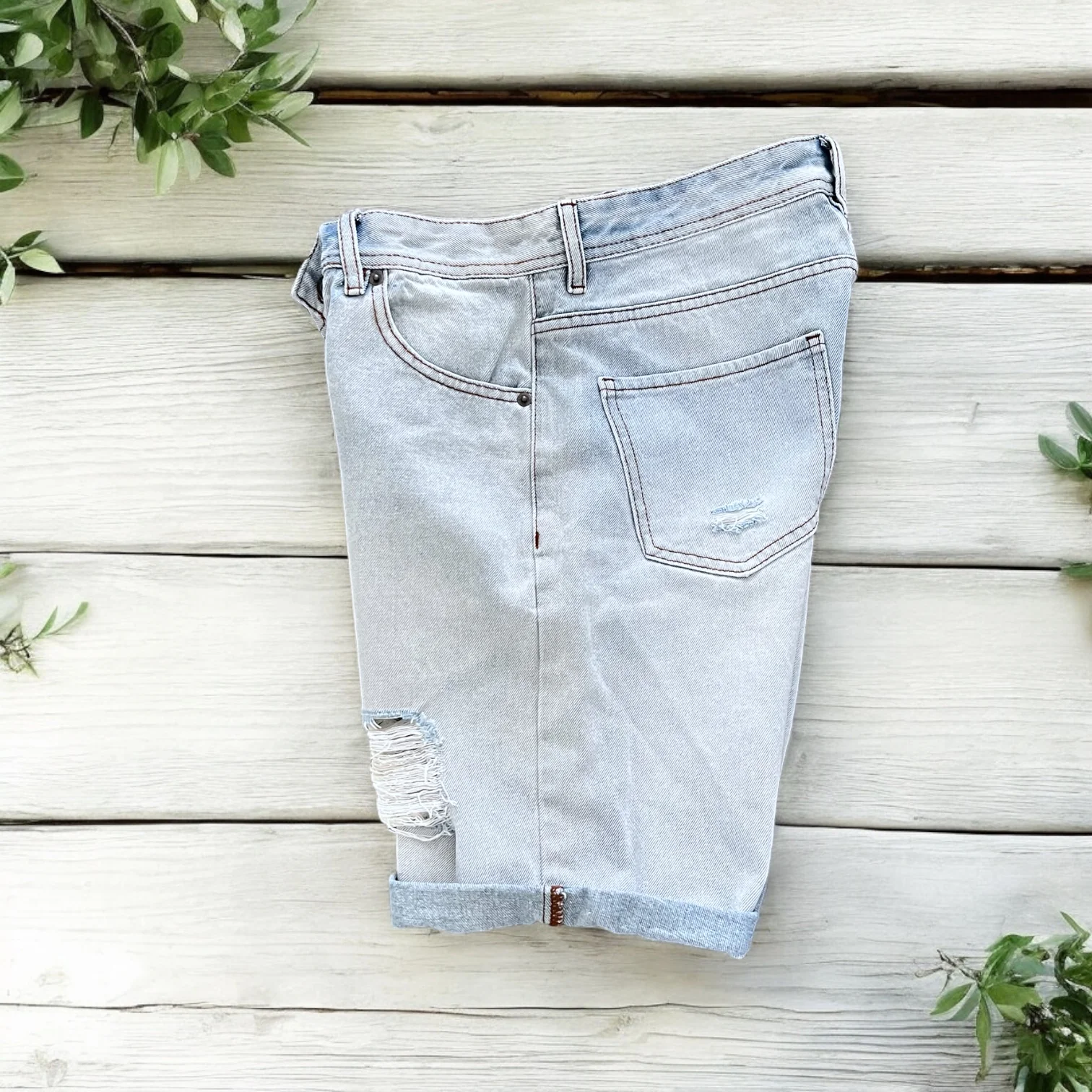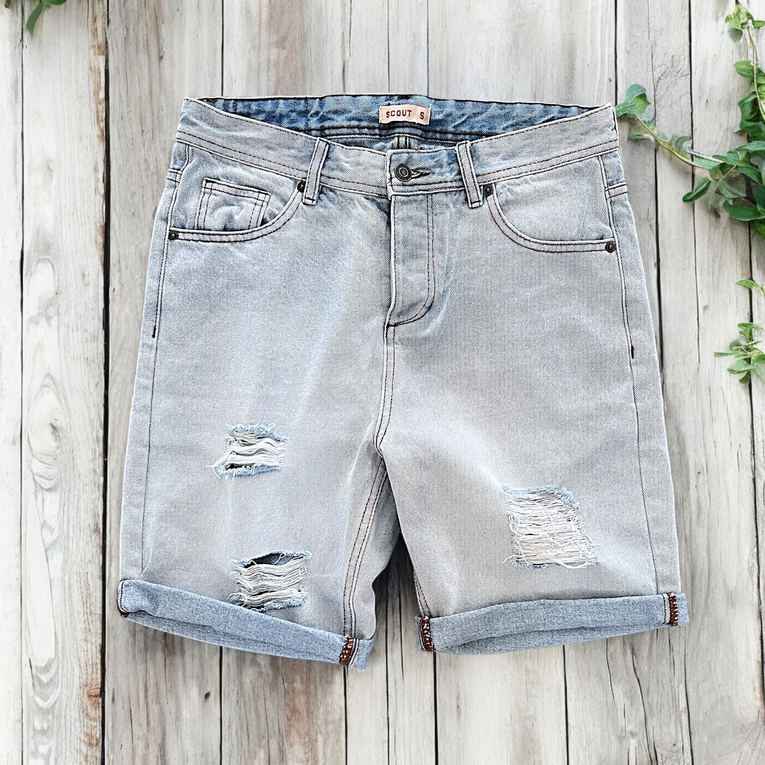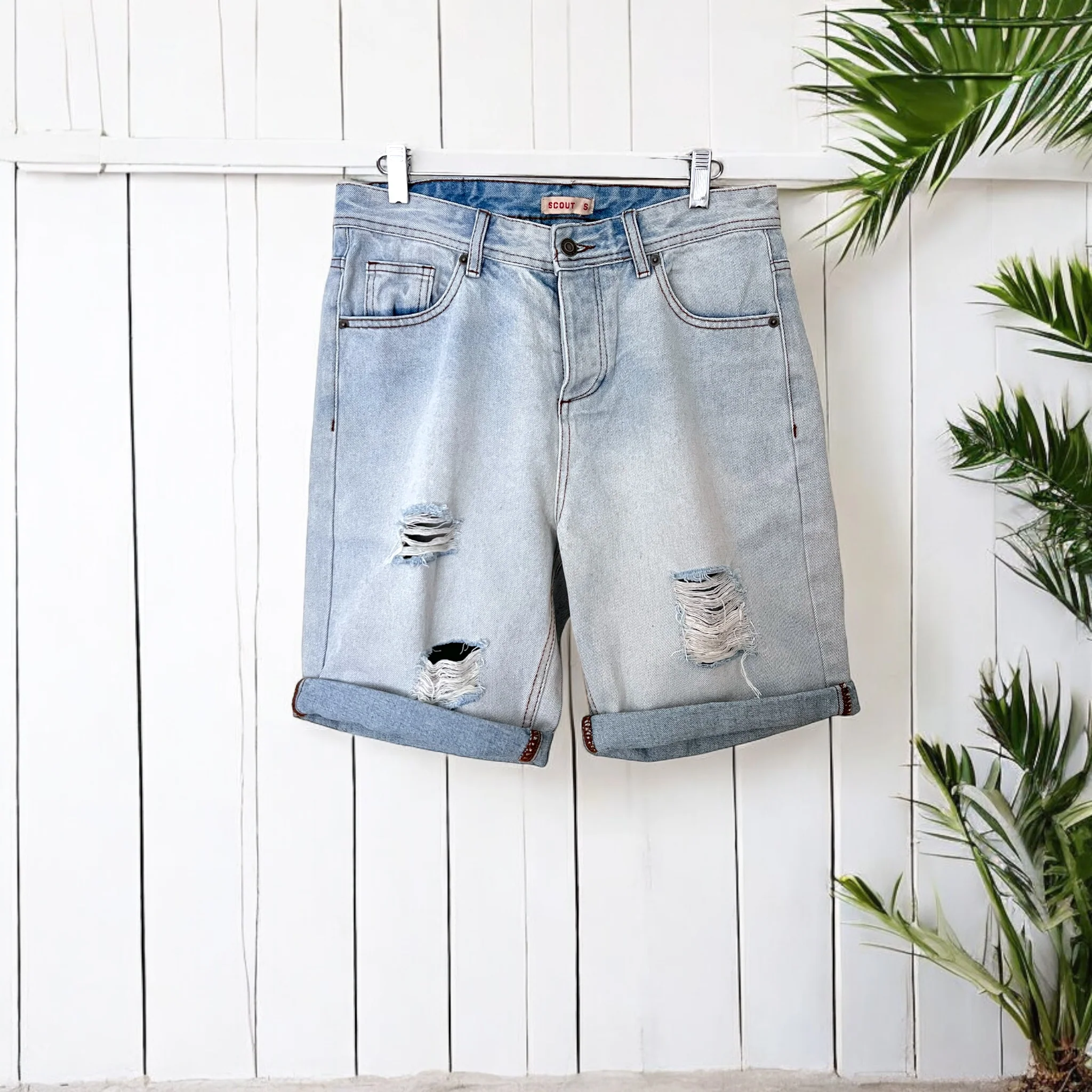 Bermuda Jeans, lavaggio chiaro bleached , five pocket con rotture. Vestibilità Regolare Composizione 100% Cotone