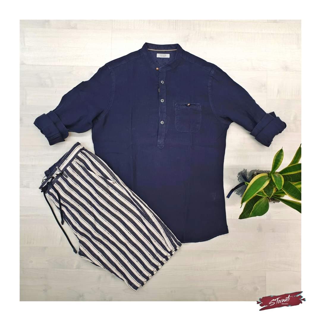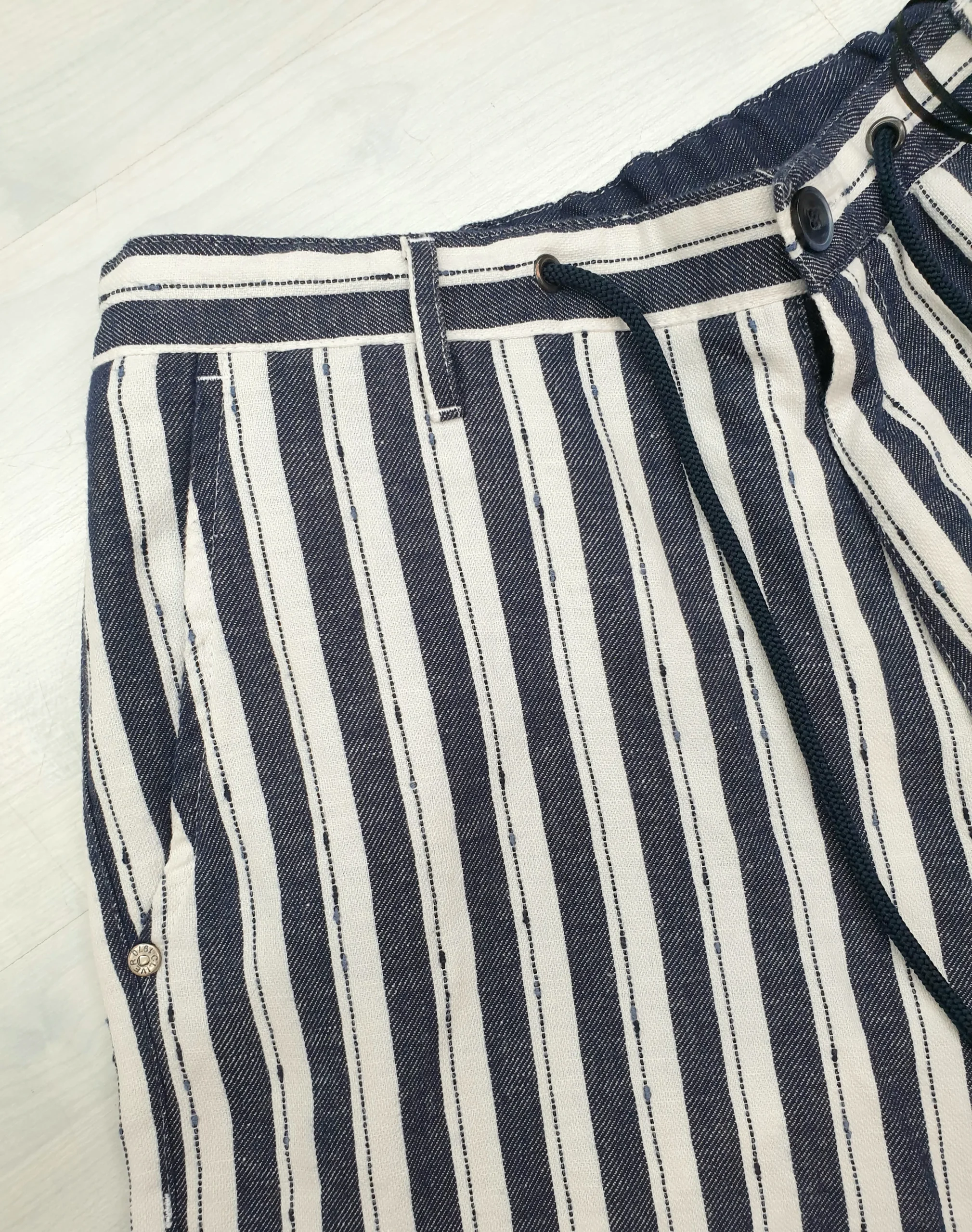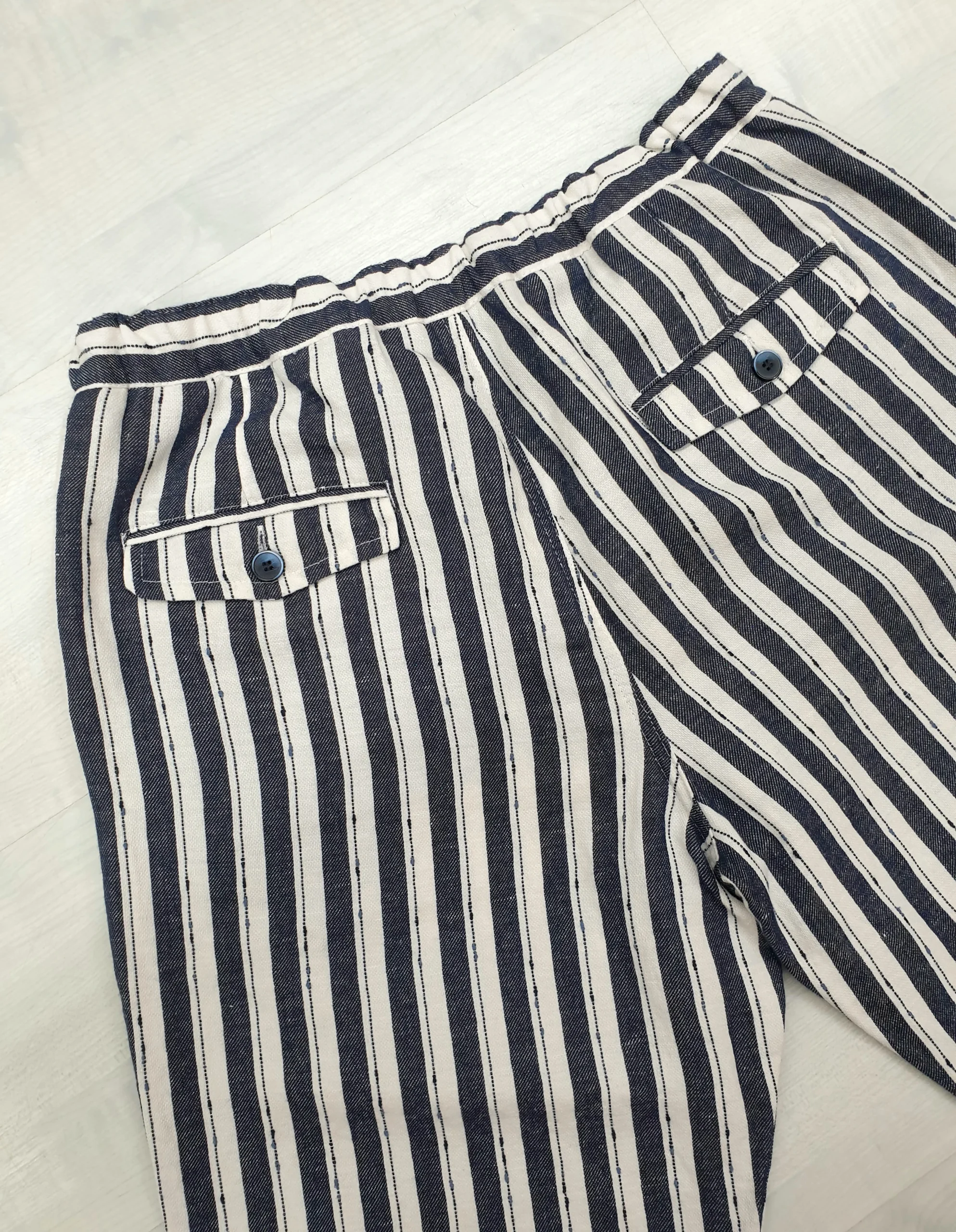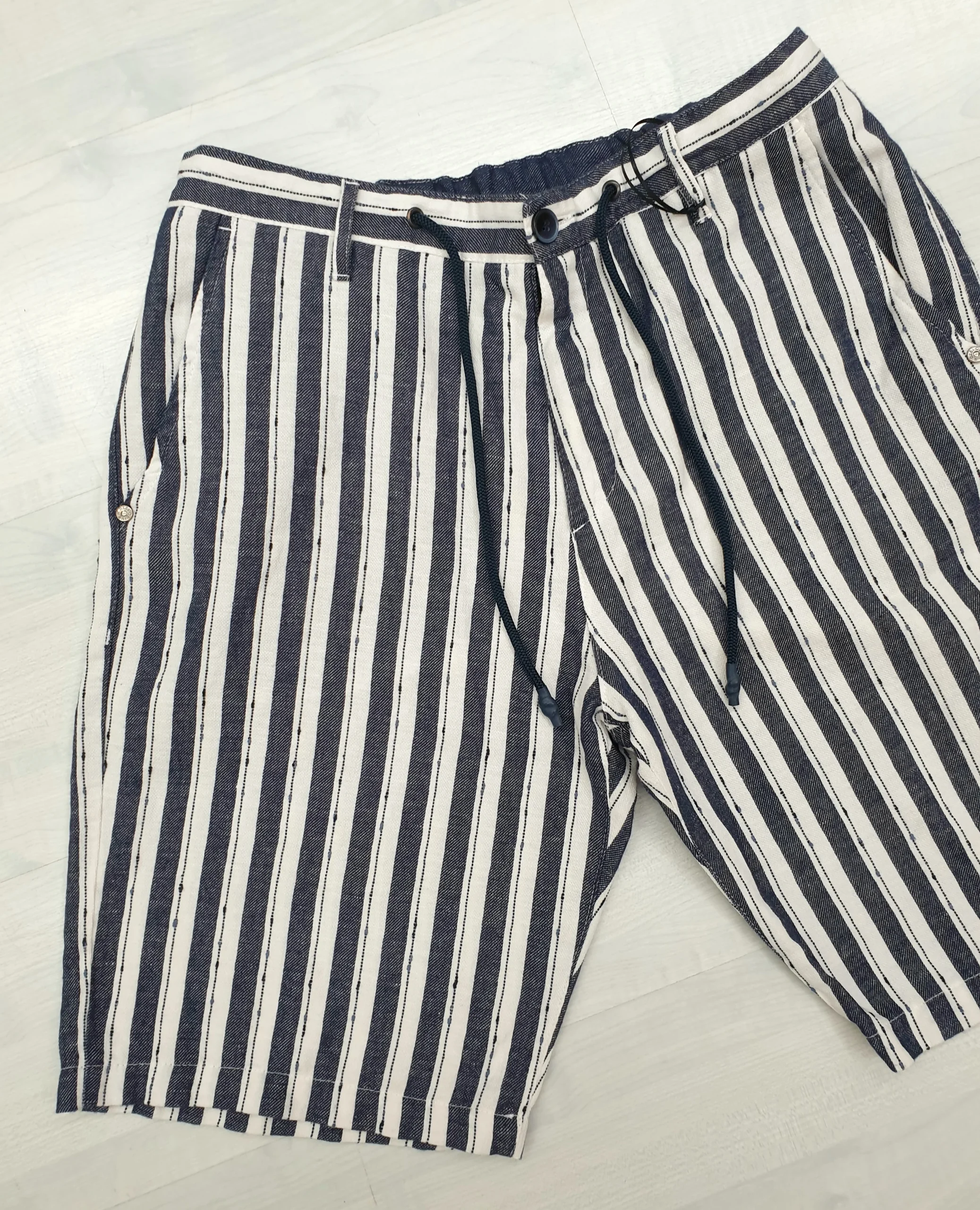 Bermuda a righe latte e blu con coulisse. >> Vestibilità morbida Composizione: 50% Lino 40% Cotone 10% Poliestere MADE IN ITALY