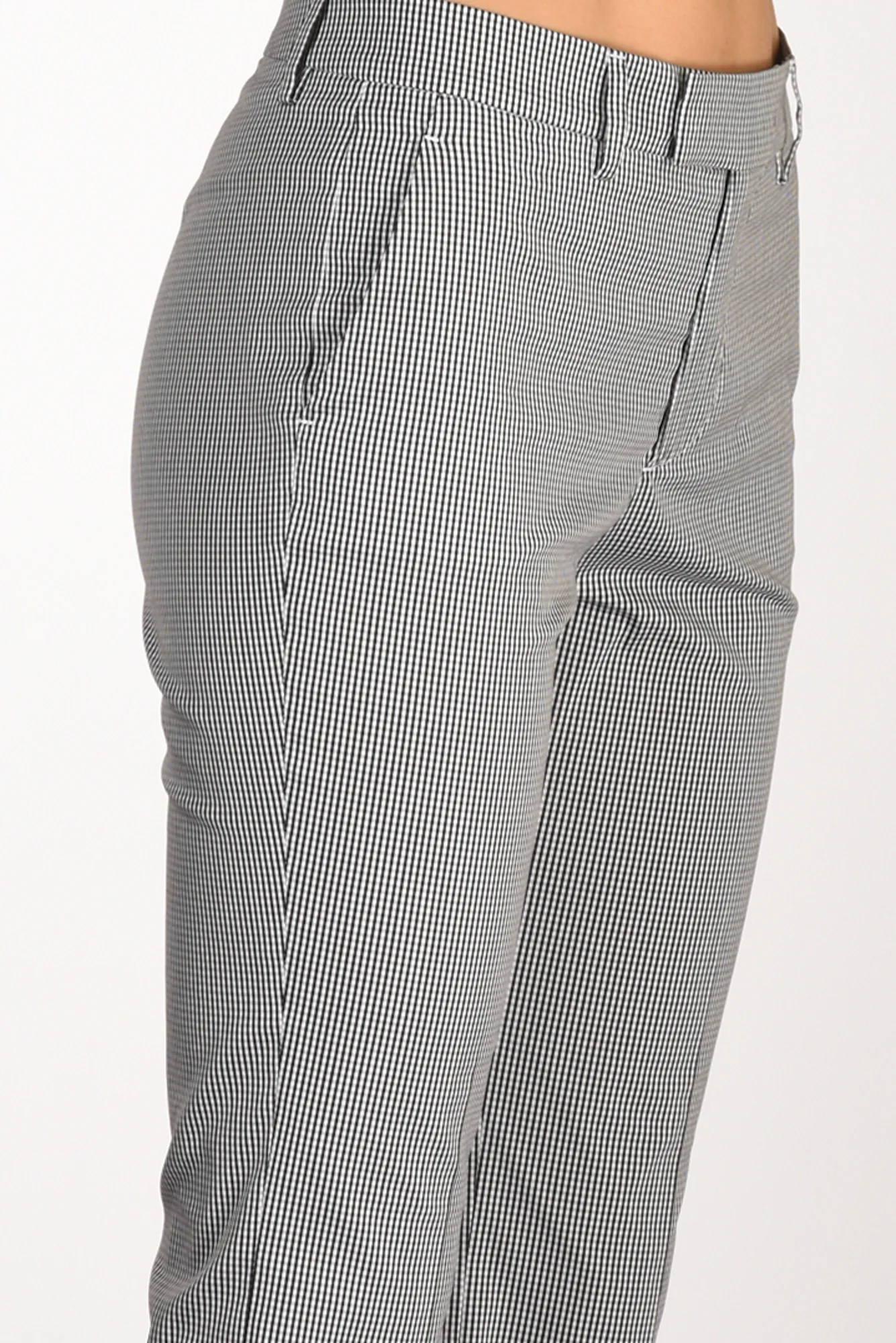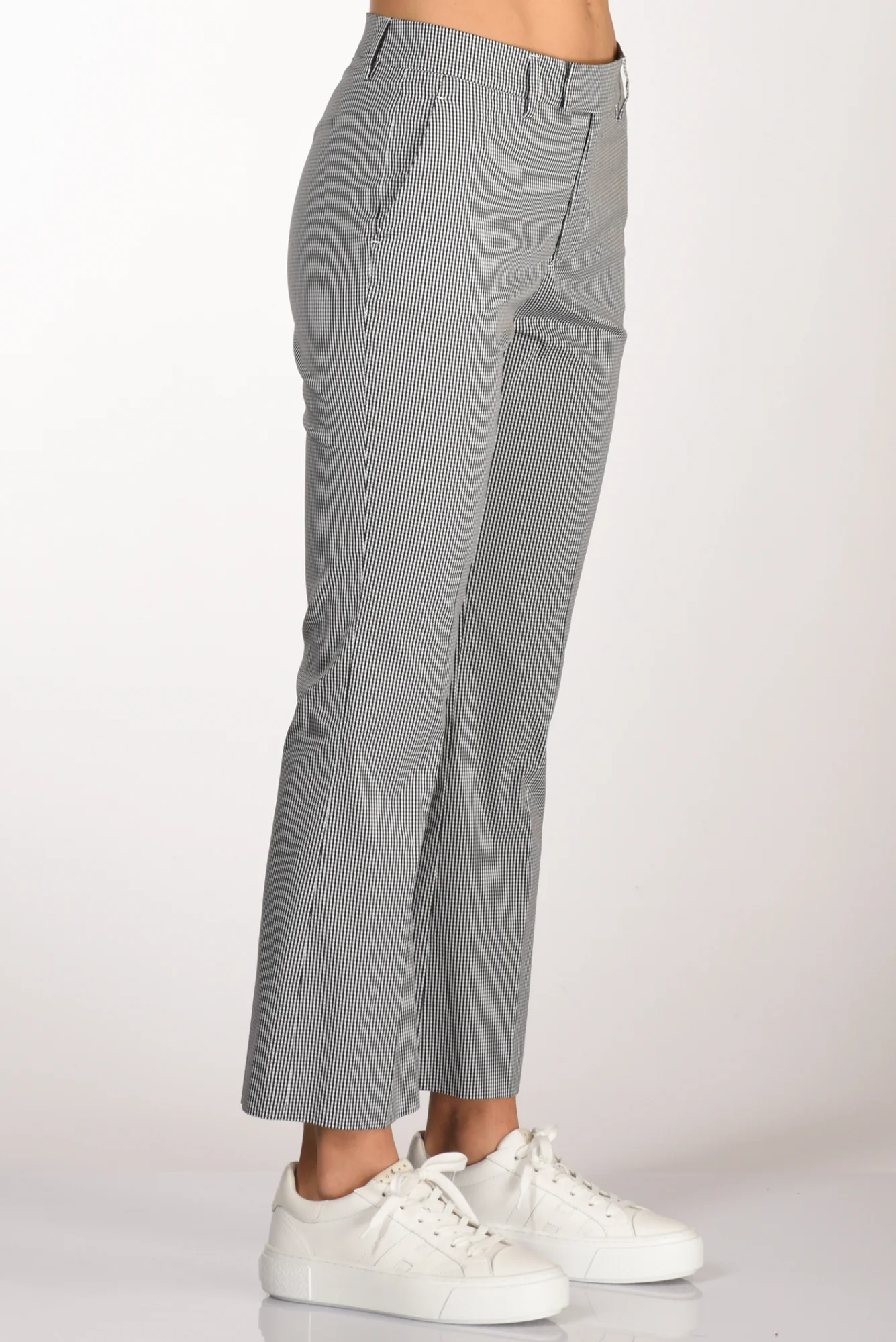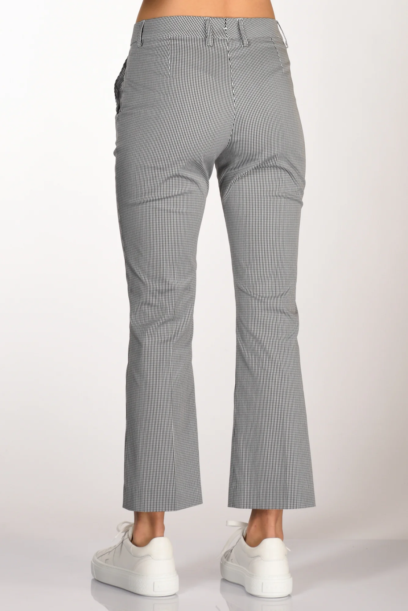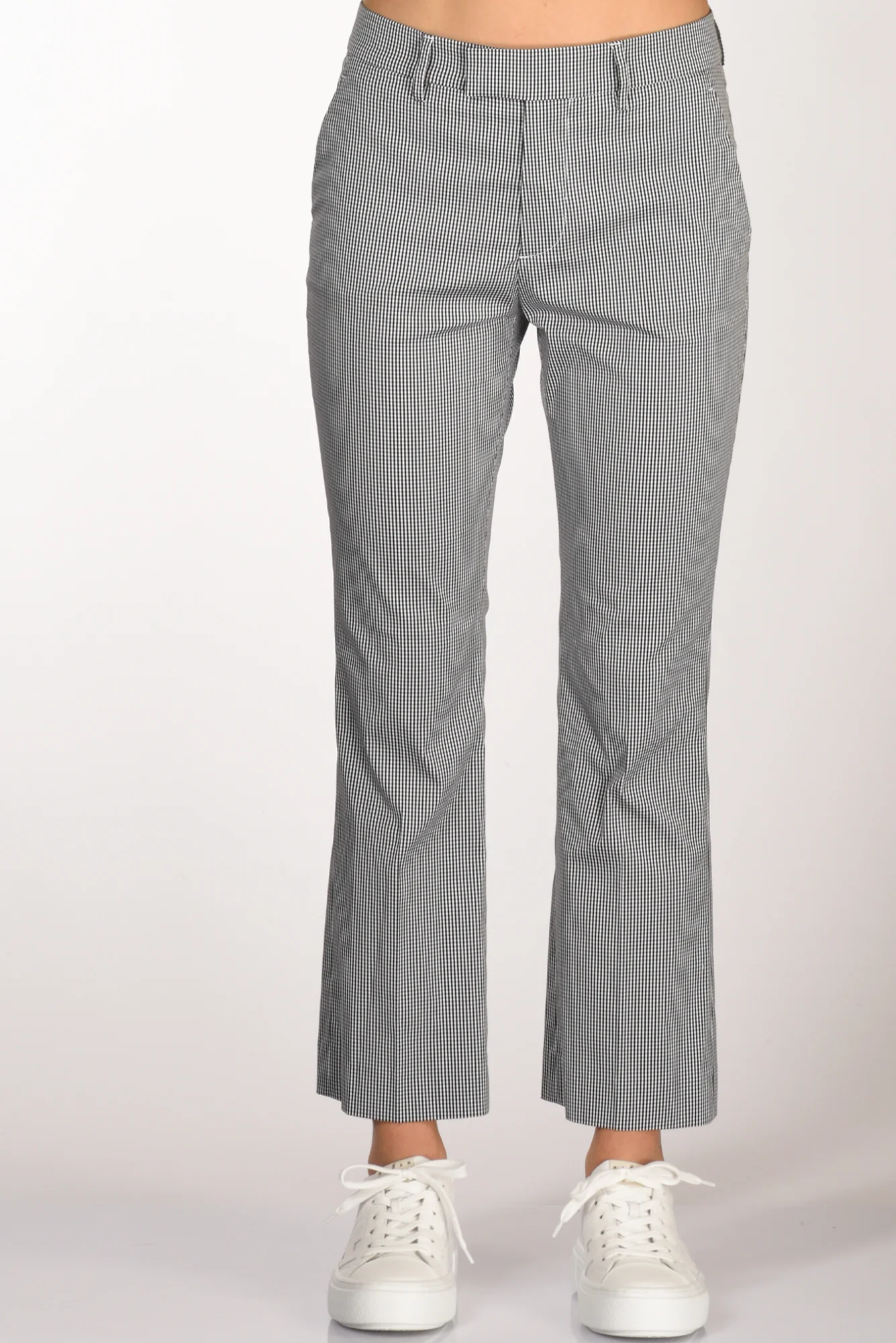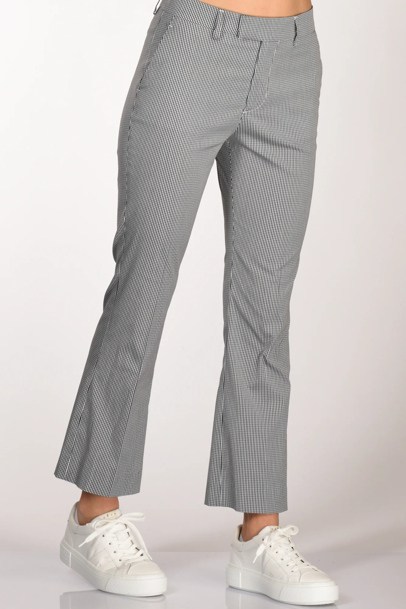 Pantaloni Fondo Trombetta, Stampa Micro Check, Passanti In Vita, Tasche Laterali Inserite, Chiusi Da Zip, Bottone E Gancio Nascosti, Vestibilita’ Regular, Composizione 78 Cotone, 17 Poliammide, 5 Elastan, Made In Italy