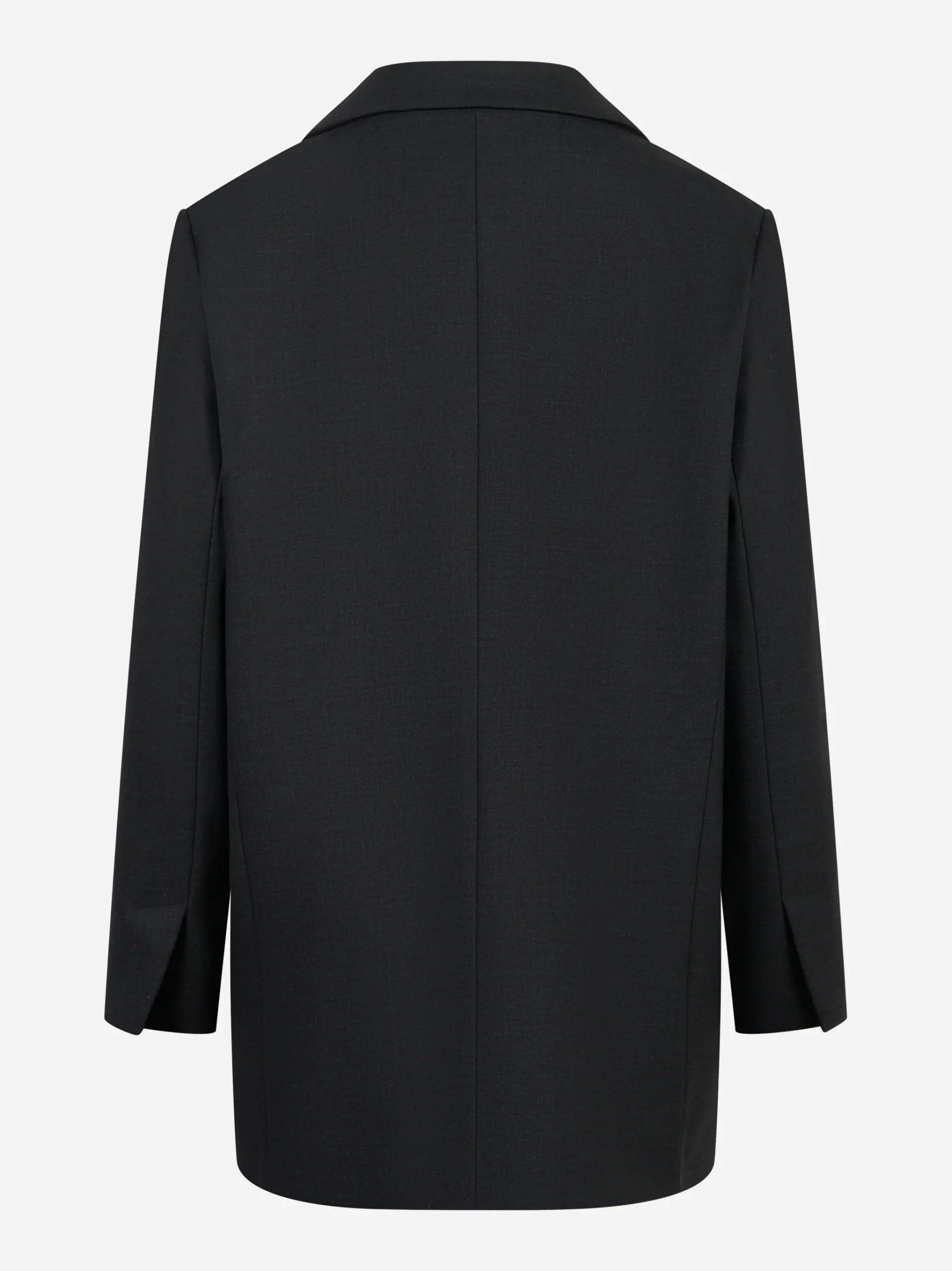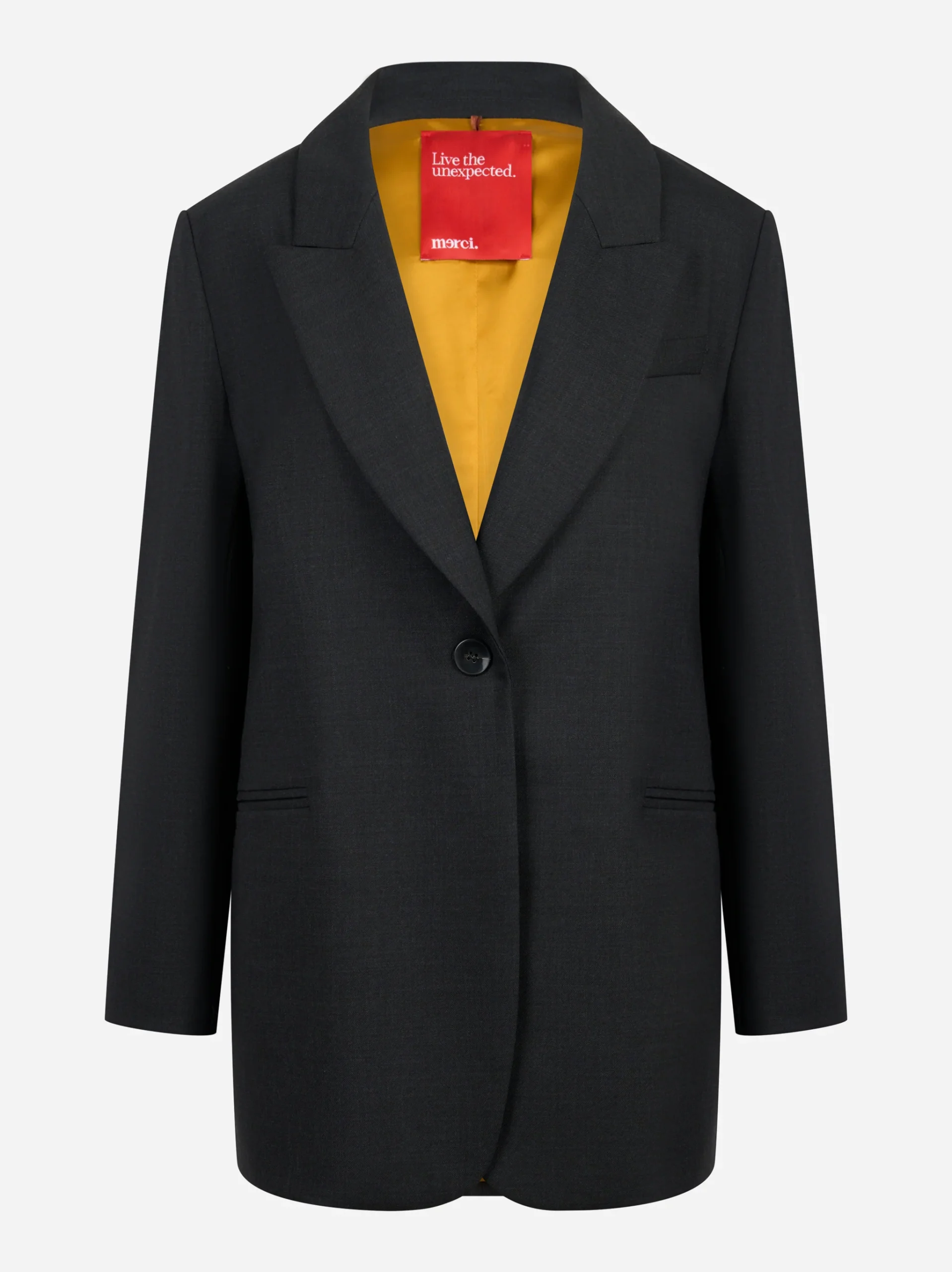 ITEM INFO Blazer over in fresco lana stretch colore grigio Revers classici e spalle leggermente strutturate Chiusura monopetto con un bottone Due tasche a filetto con patta Vestibilità over, lunghezza sotto fianco Fodera interna a contrasto Composizione: 54% poliestere, 44% lana, 2% elastan