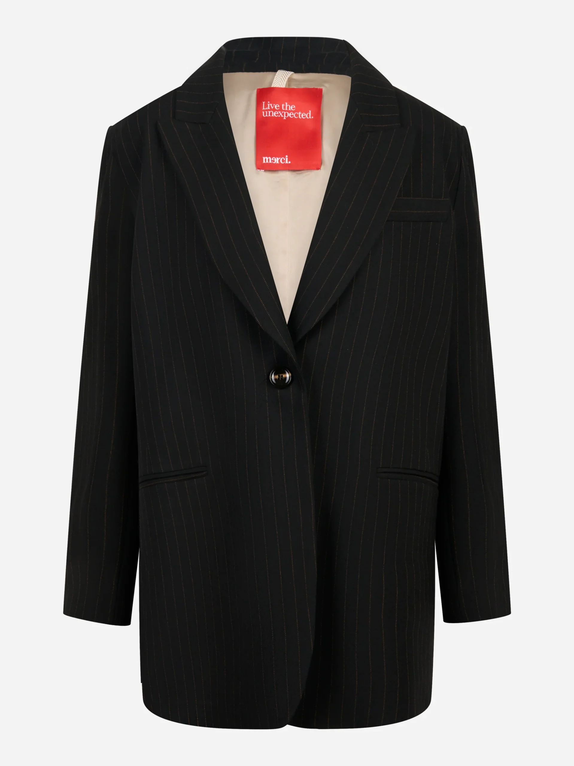 ITEM INFO Blazer over nero con sottile motivo gessato Revers classici e chiusura frontale a un bottone Tasche laterali a filetto Spalle leggermente strutturate Linea dritta e moderna Tessuto con leggera elasticità per comfort quotidiano Composizione: 38% viscosa, 36% poliestere, 24% lana, 02% elastan
