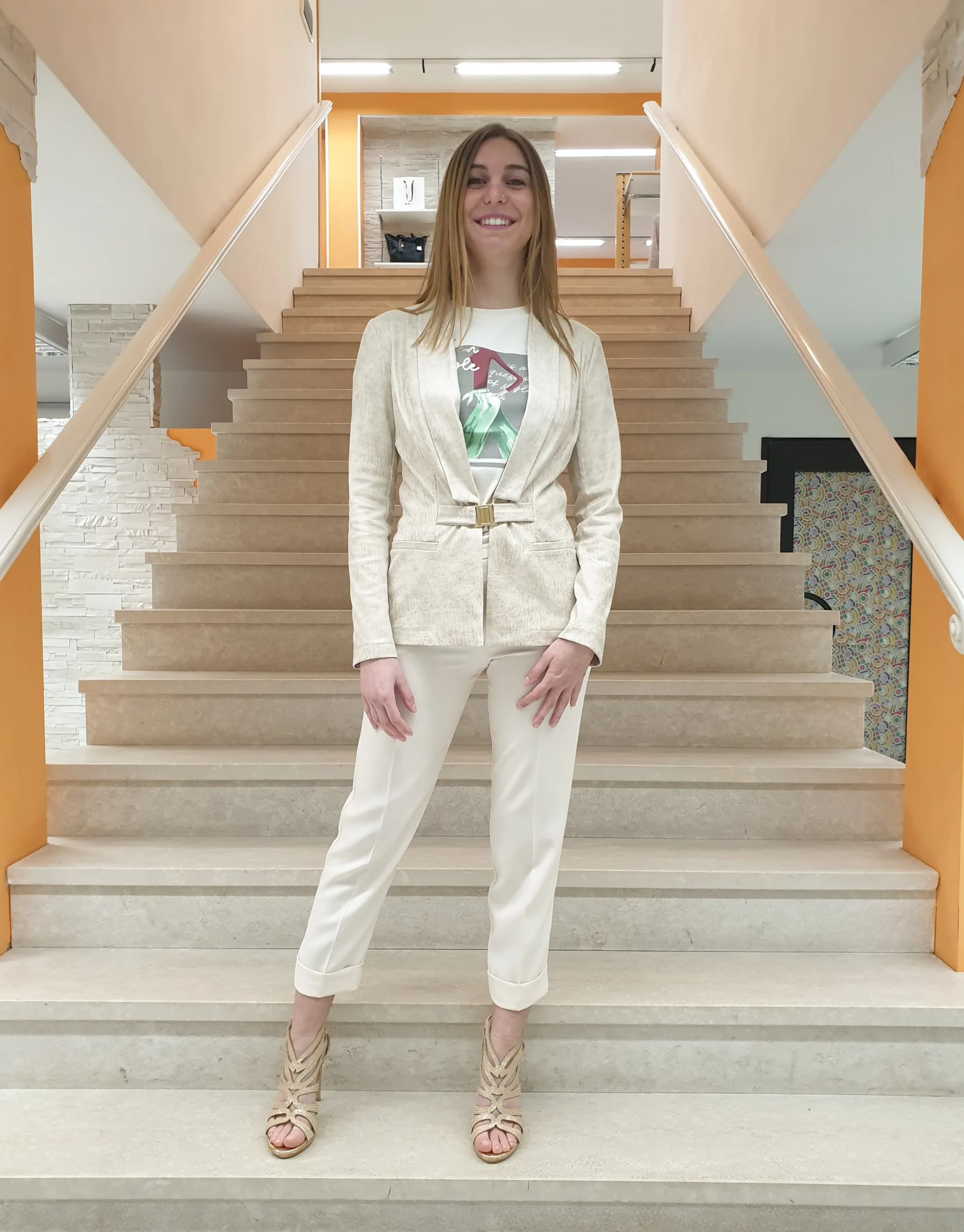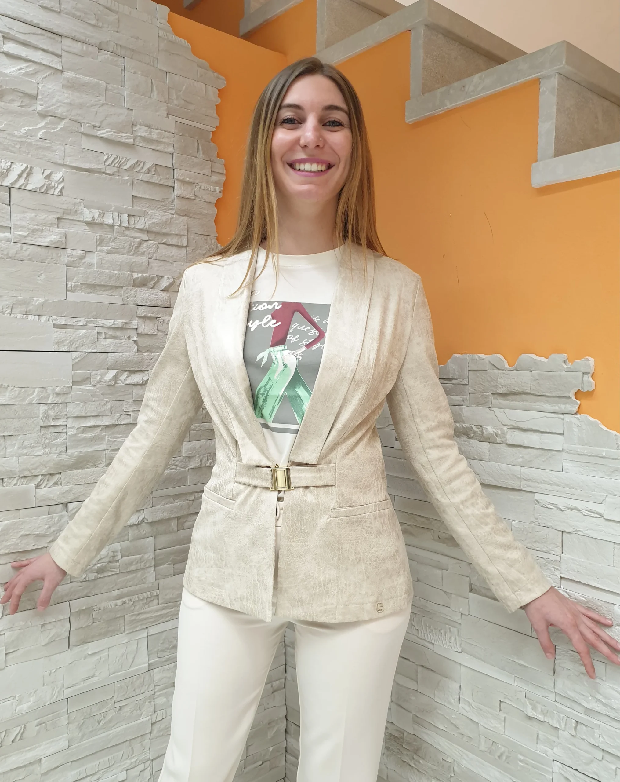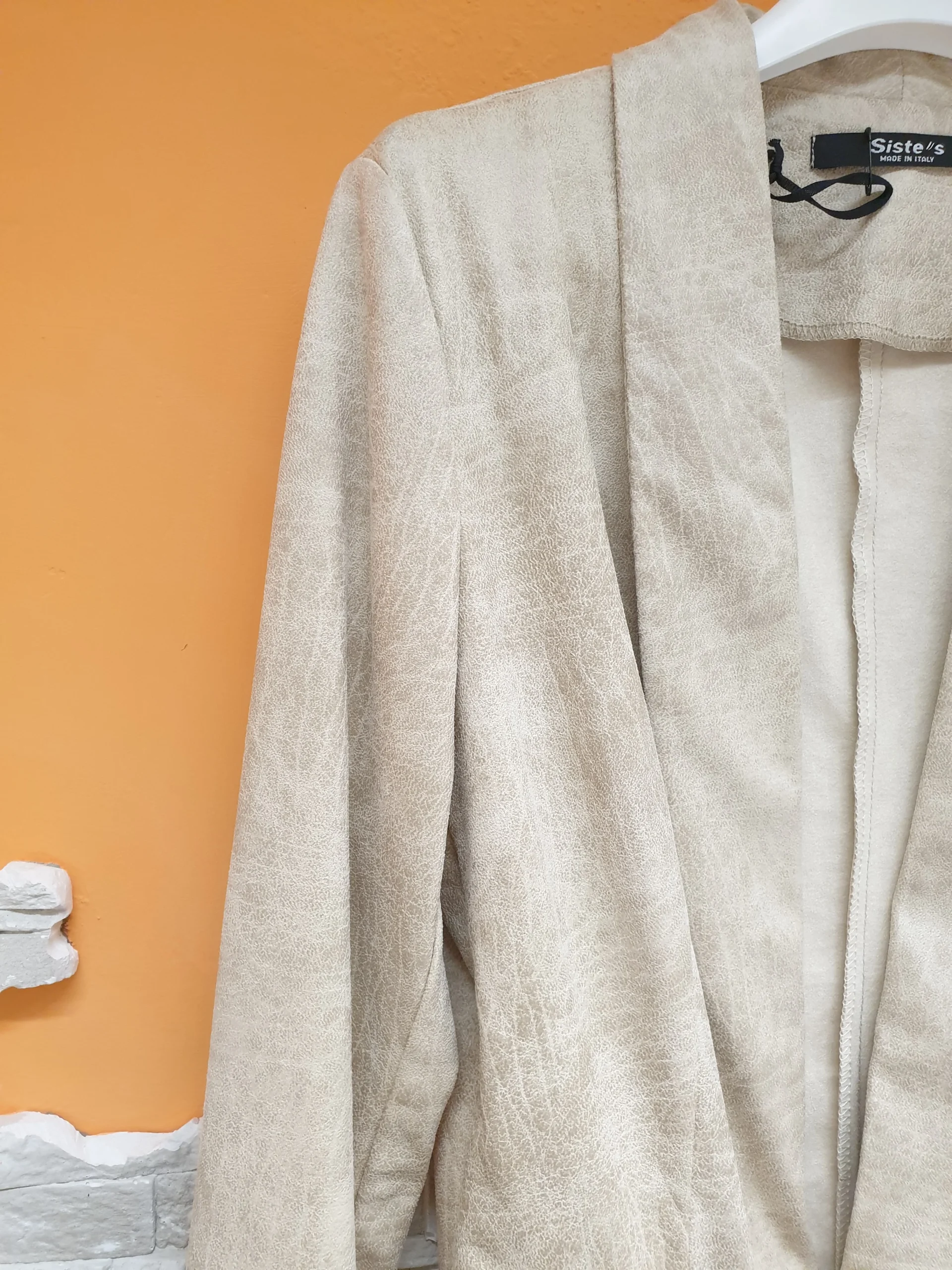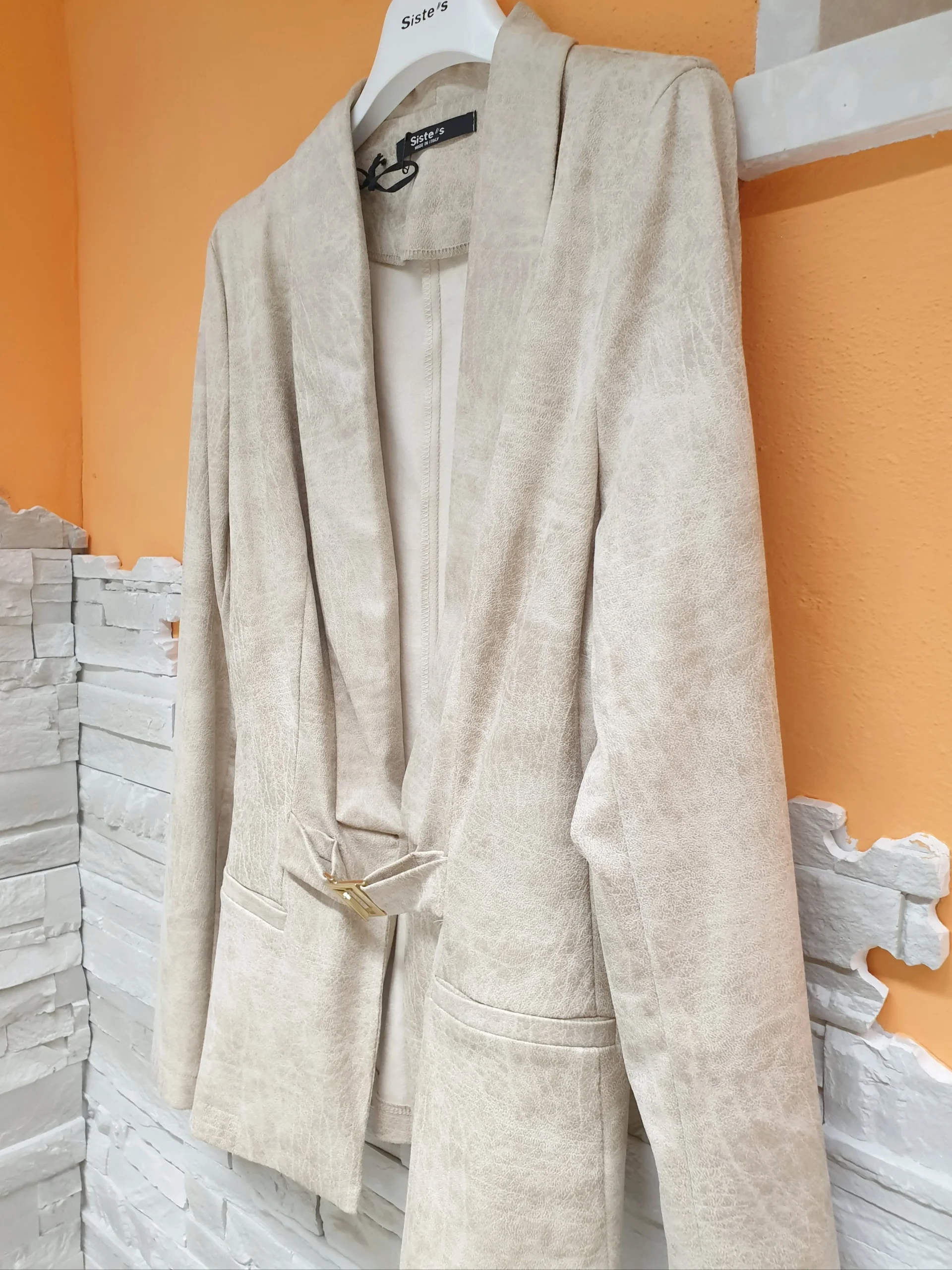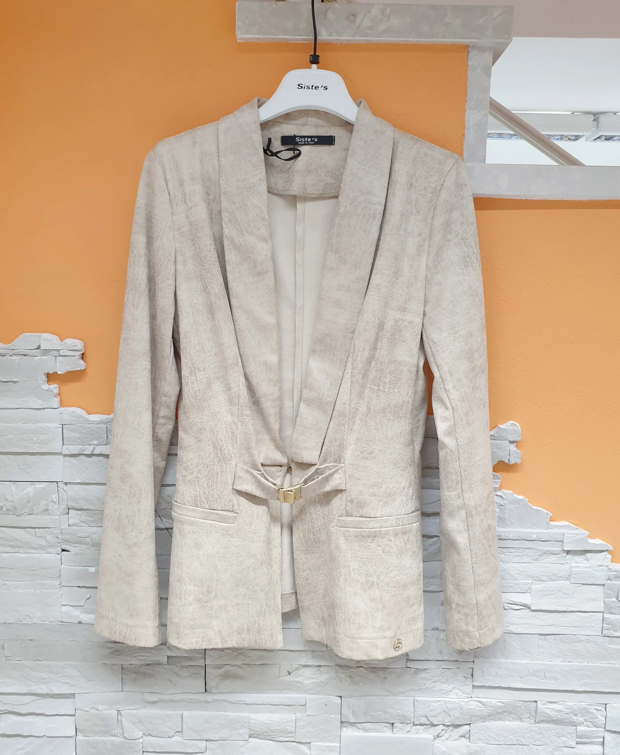 Giacca slim sabbia effetto marmorizzato con chiusura fibbietta e scollatura profonda. Composizione: 90% Poliestere 10% Elastan MADE IN ITALY