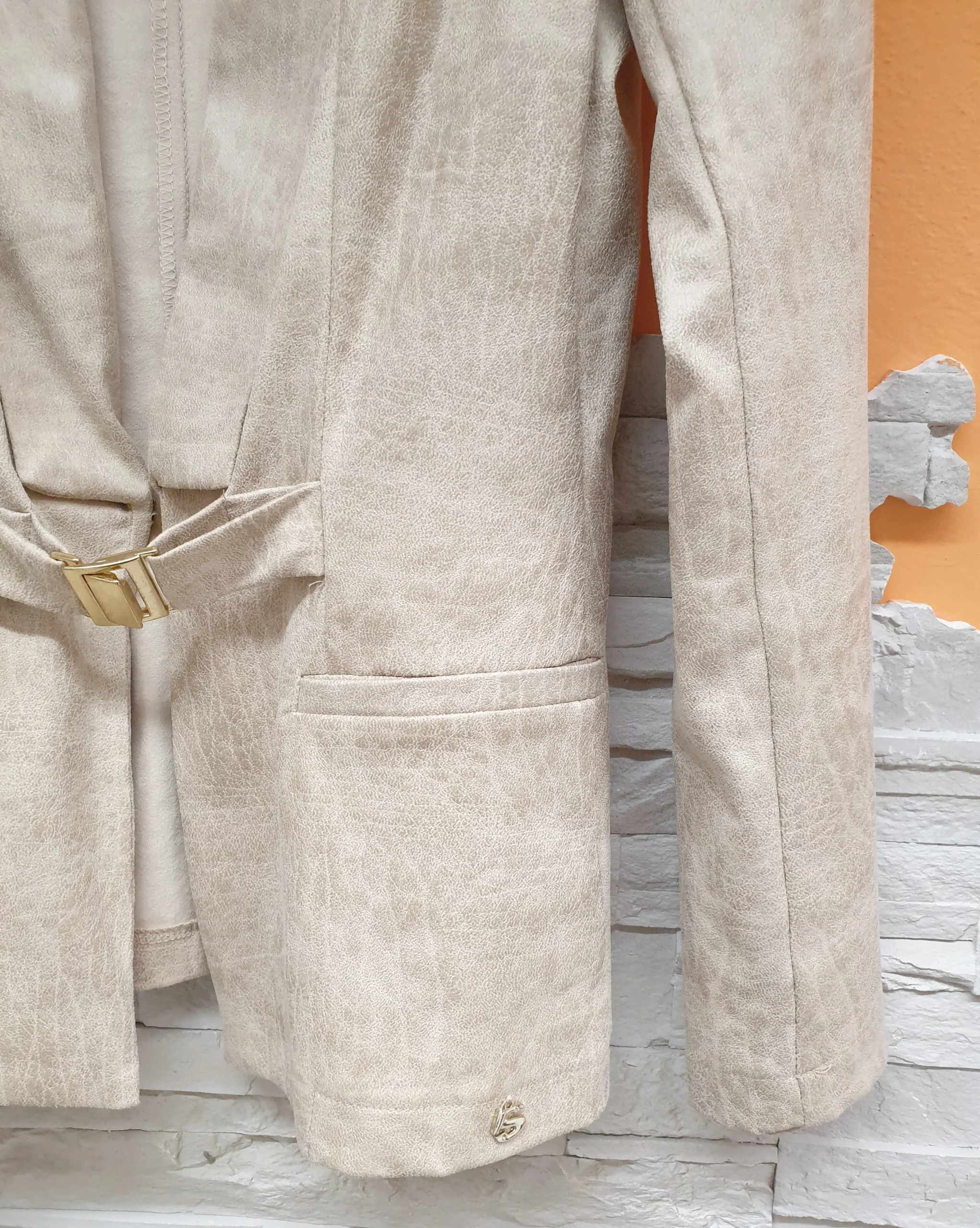 Giacca slim sabbia effetto marmorizzato con chiusura fibbietta e scollatura profonda.