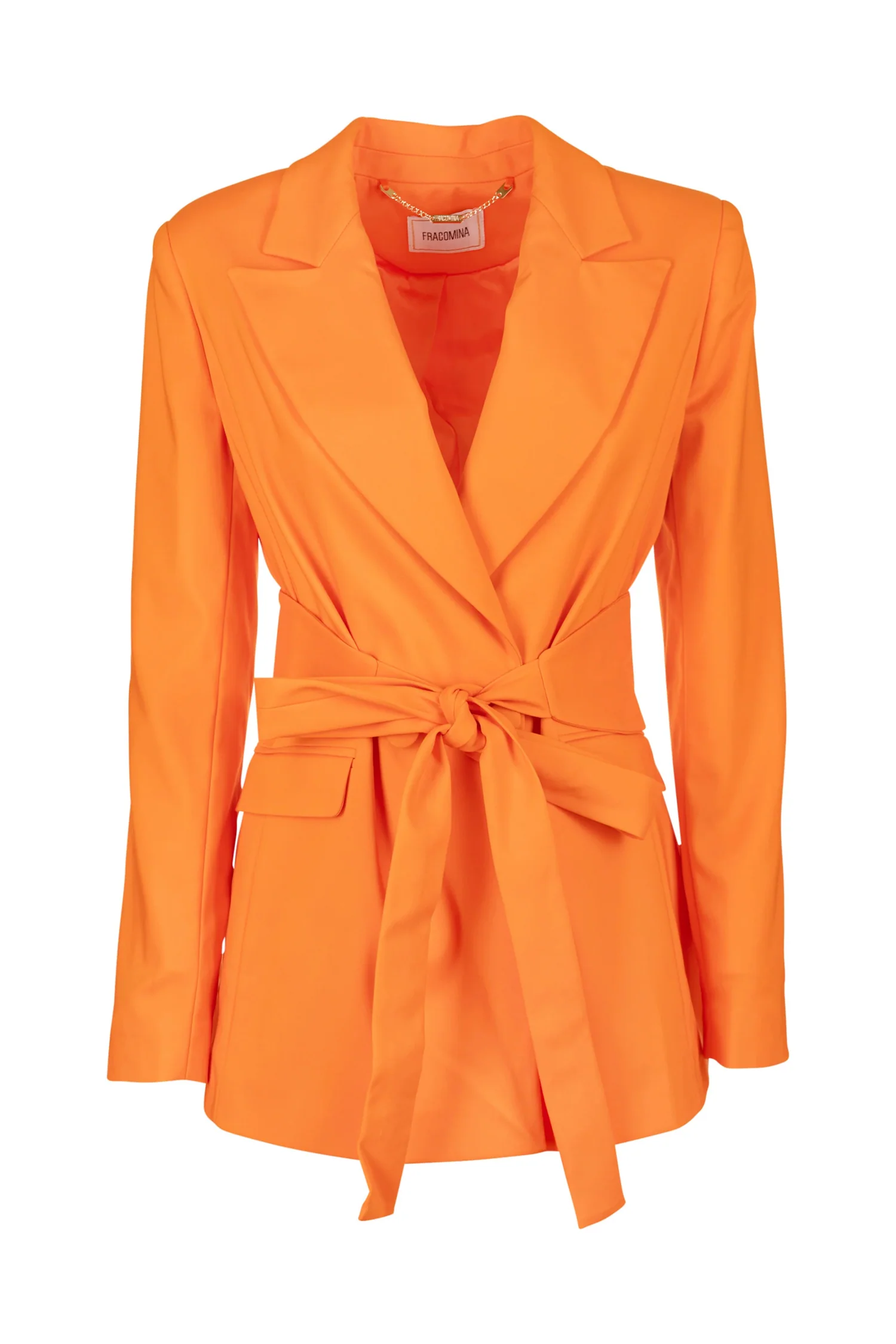 Blazer regular lungo in tessuto tecnico, revers a lancia, fusciacca in vita, tasche laterali, e con maniche lunghe.