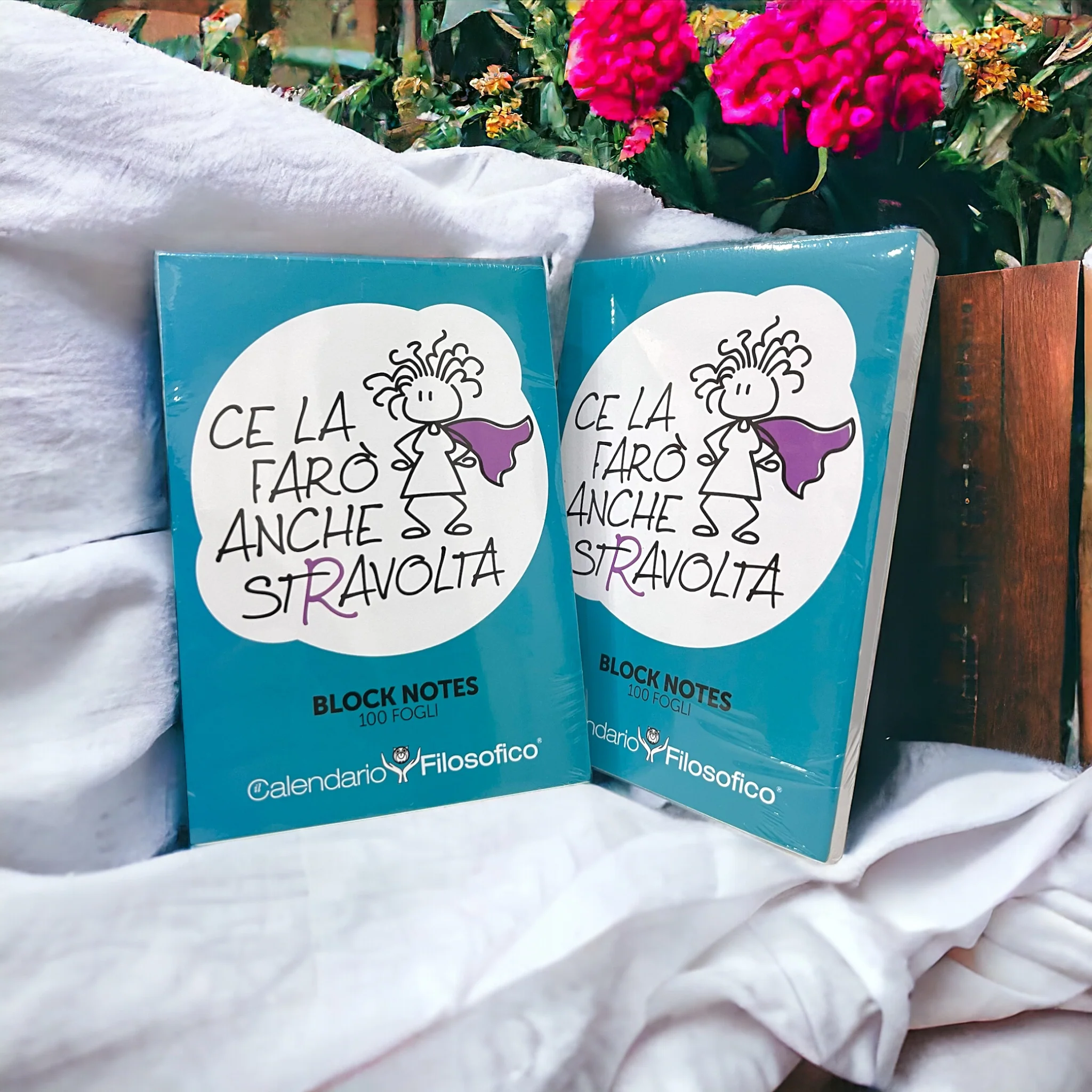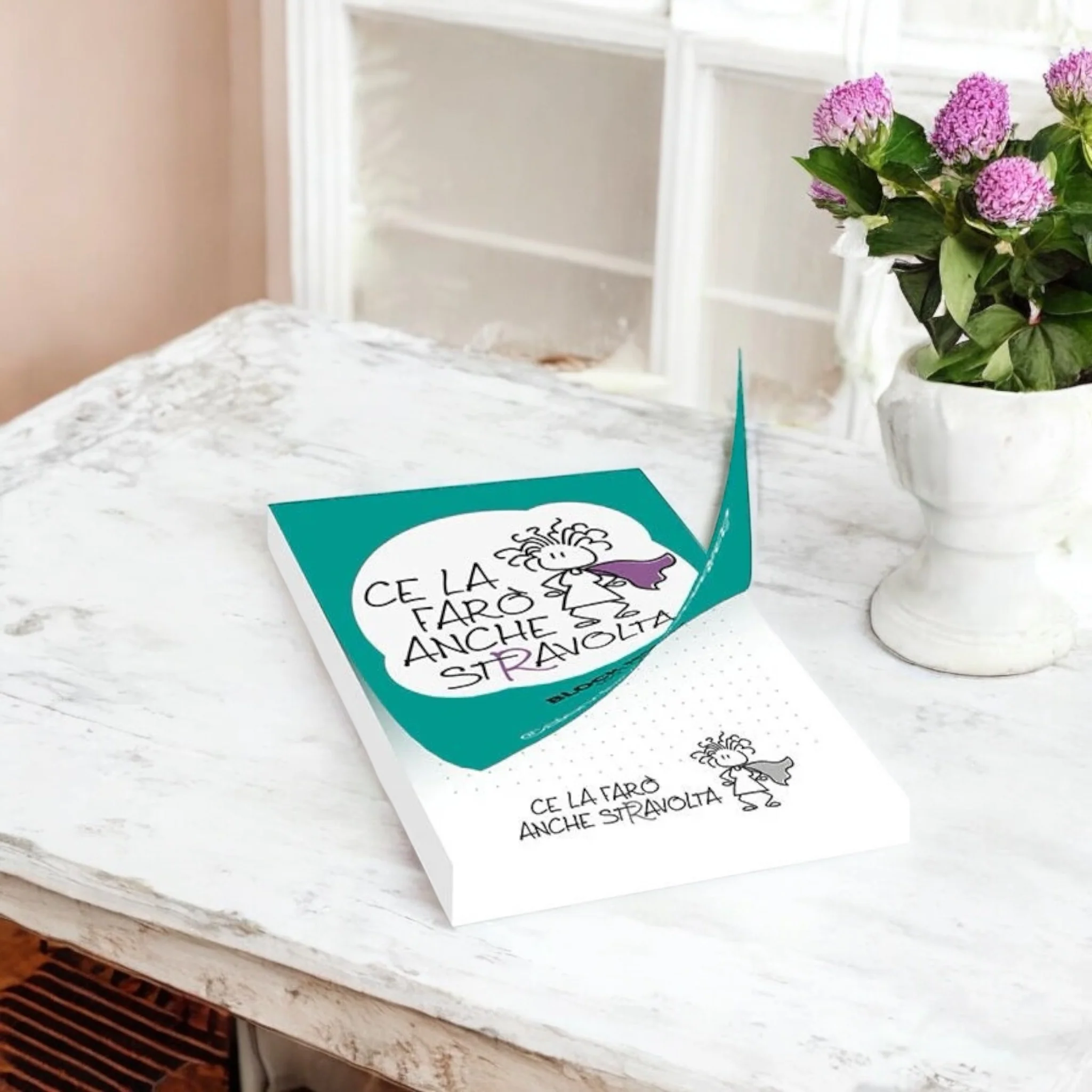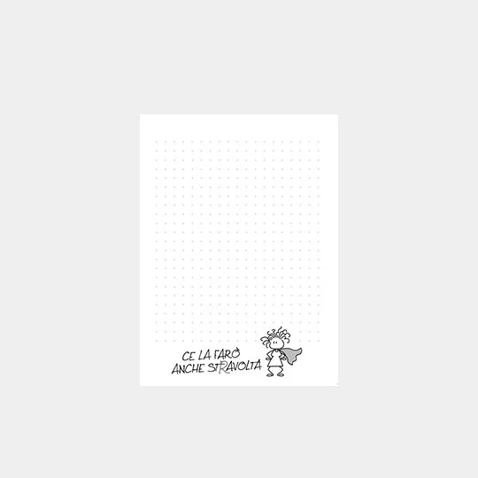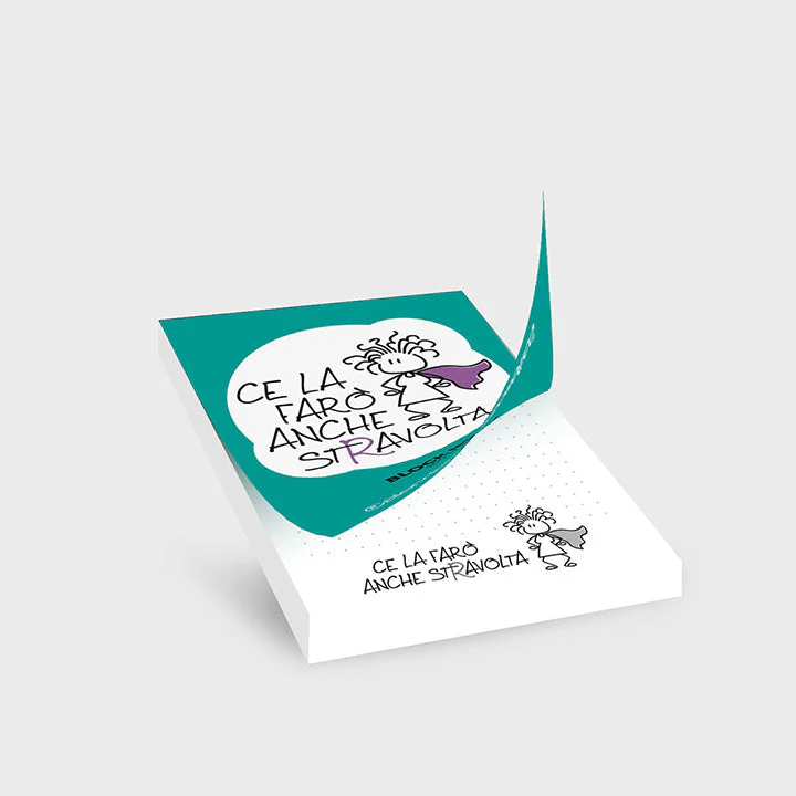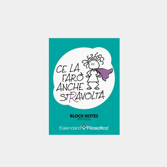 I tuoi appunti meritano un block notes speciale! Su ogni pagina dei nostri blocchetti c’è la frase “Ce la farò anche stravolta” abbinata all’immagine femminile che si vede in copertina.