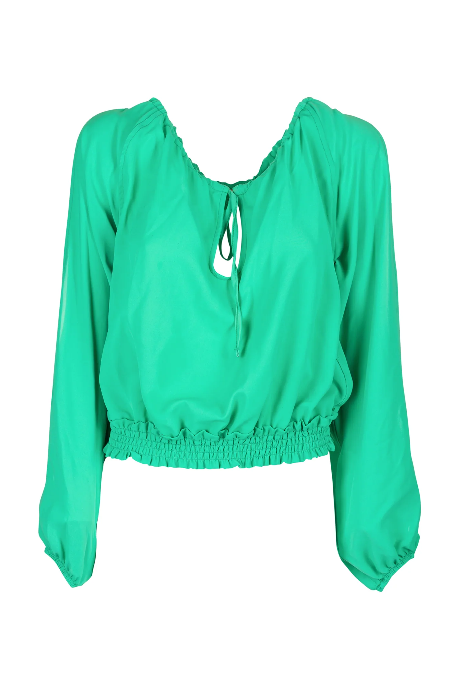 Blusa ampia in crèpe de chine, scollo ampio con goccia ed allacciatura sul davanti, punto smock sul fondo, e con maniche lunghe con apertura sul lato.