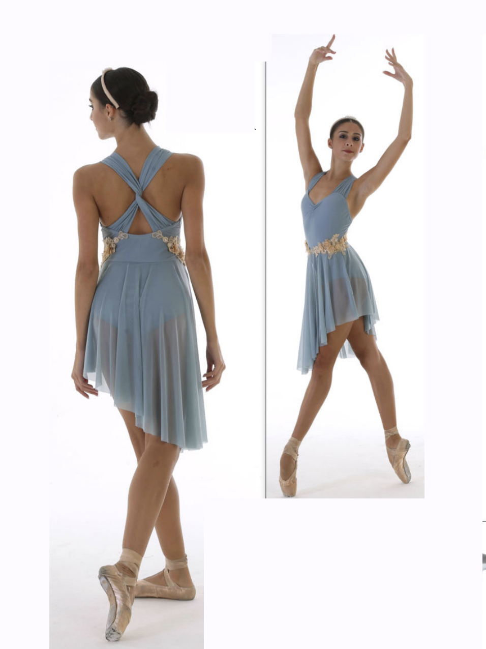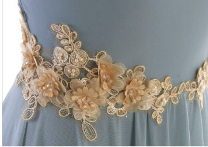Abito montato su body in lycra con bretelle drappeggiate ad incrocio dietro, gonna in retina a ruota asimmetrica, coppia di decori floreali in vita applicati.