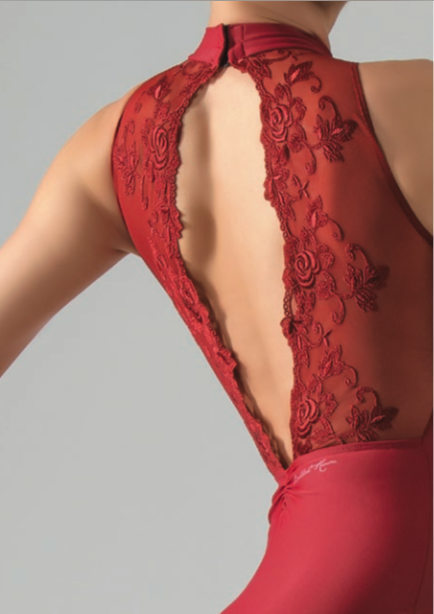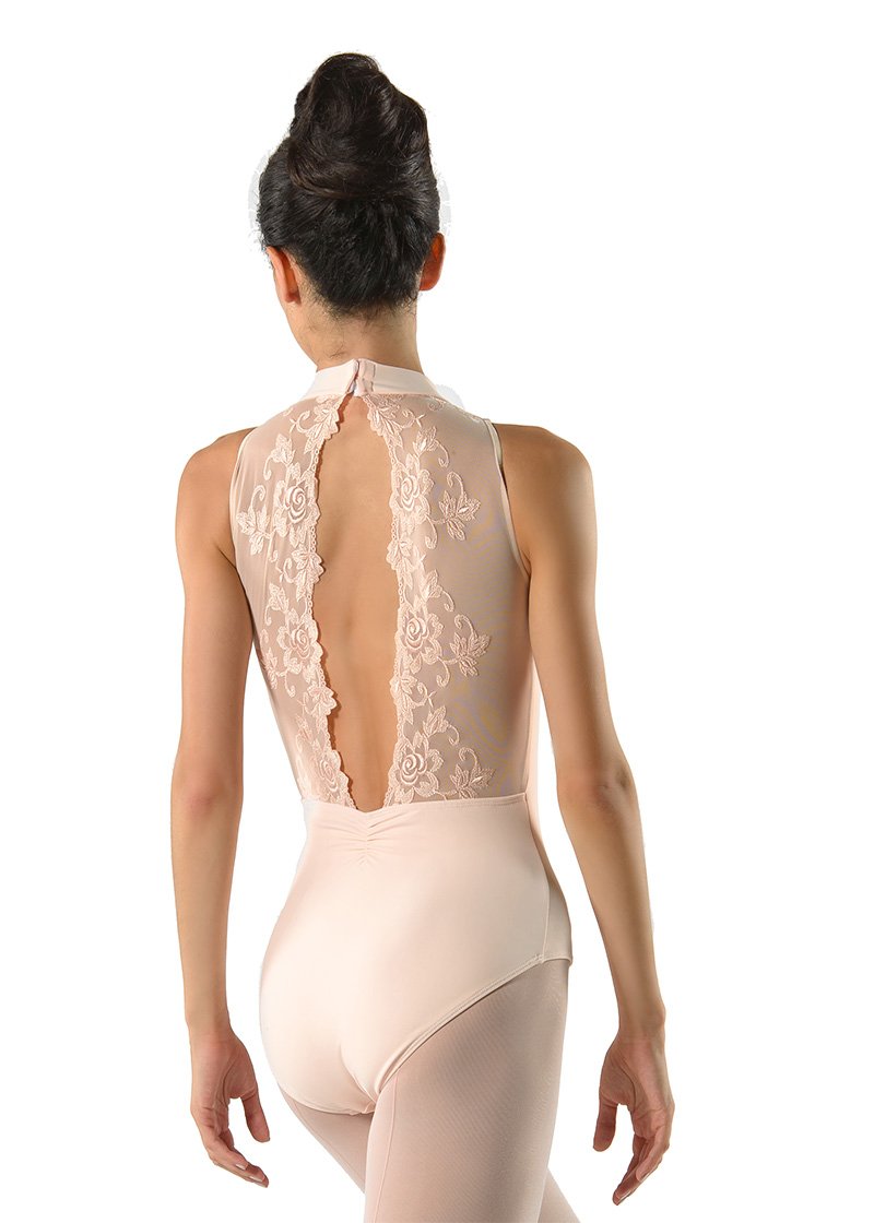 Elegante body da danza con incredibili motivi floreali in pizzo sulla schiena, modello a lupetto, foderato anteriormente.