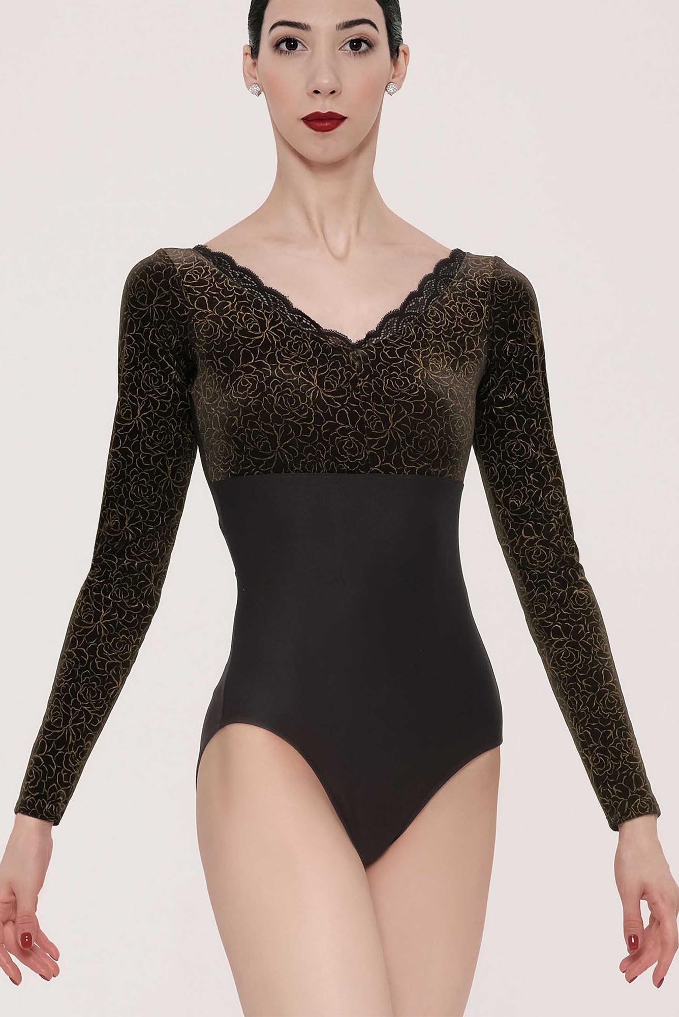 Bellissimo body danza a manica lunga in velluto, mod. Borgia.