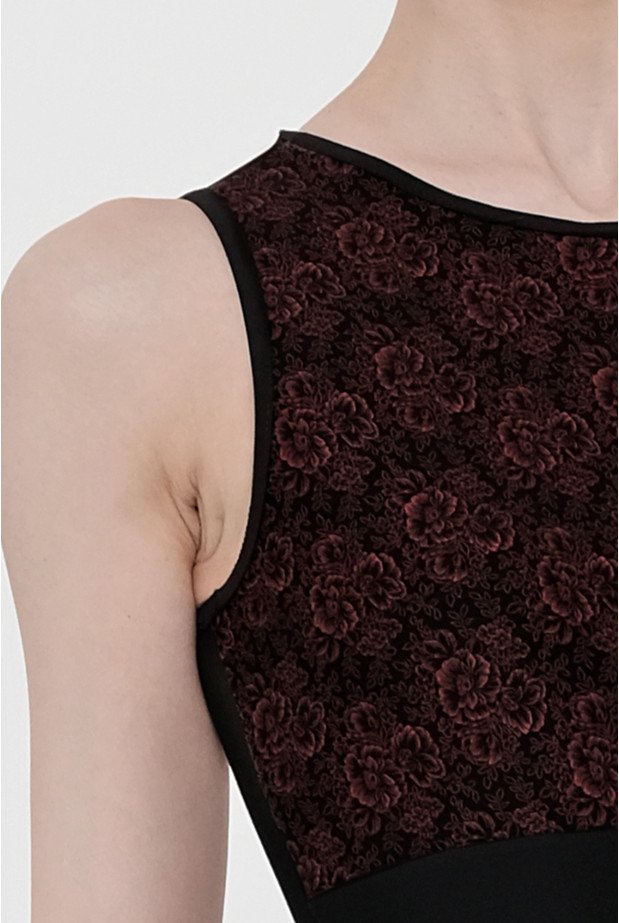 Un body dal classico stile Wear Moi, con una stampa a piccole rose discrete, e una bellissima schiena in microrete valorizzata da una zip contornata dal tessuto stampato.. Smanicato, dal taglio moderno.