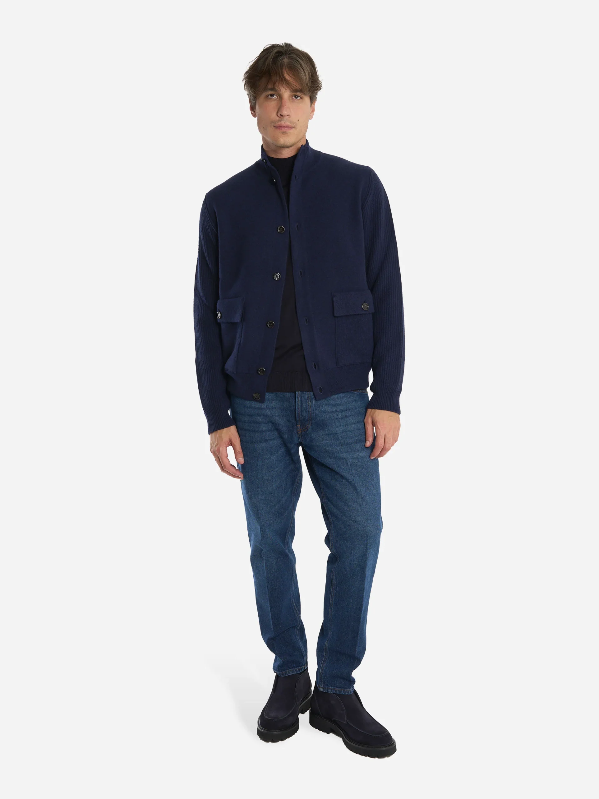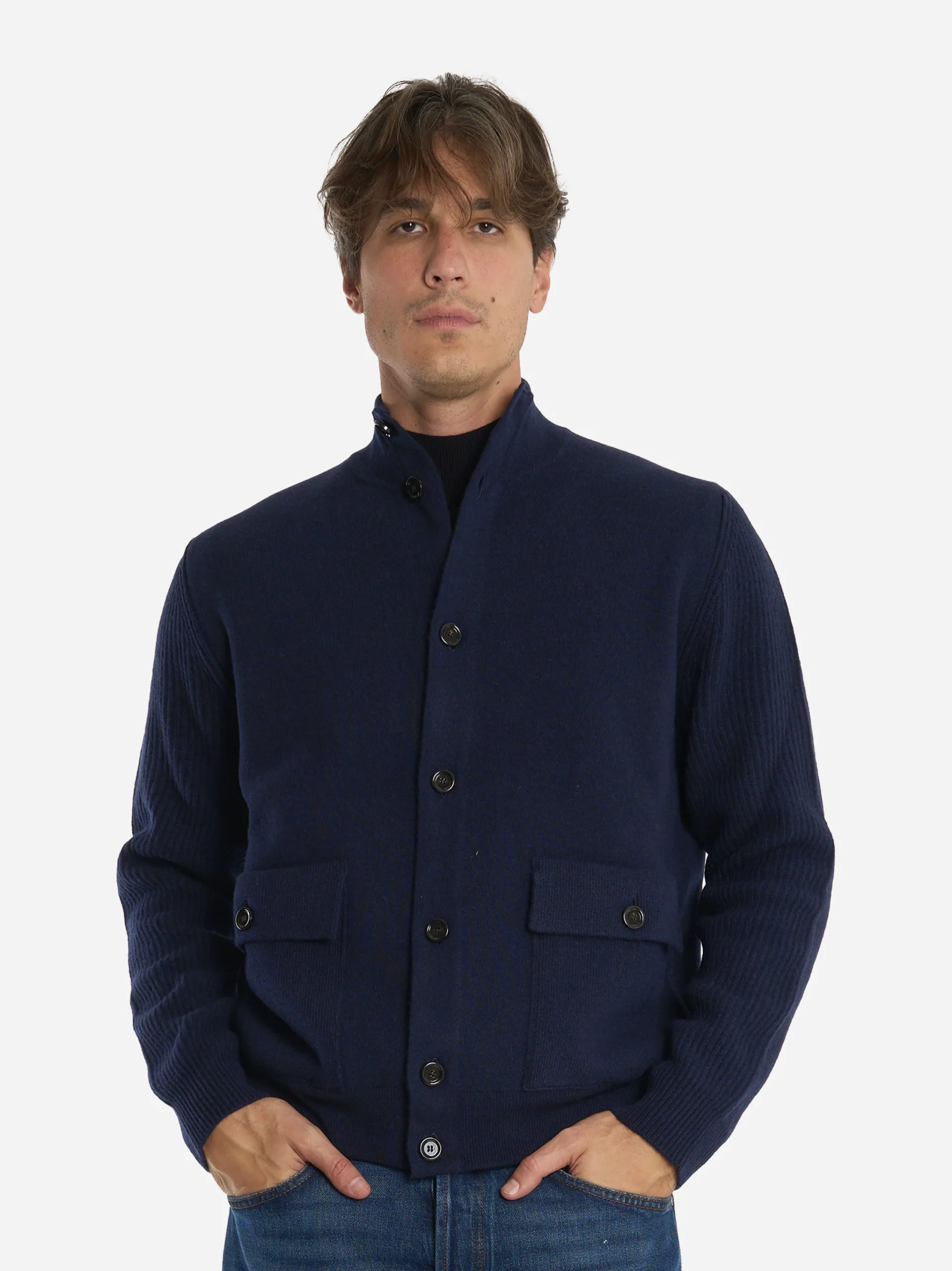 ITEM INFO Bomber in lana double blu Colletto alto con bottoni frontali Chiusura con bottoni in corno Tasche applicate con patta frontali Finiture a costine su polsi e orlo Linea essenziale con vestibilità regolare Dettagli sartoriali tipici Lardini Composizione: 96% Lana, 4% Poliammide Made in Italy TAGLIA E VESTIBILITÀ ▾ Model wears size L Model […]