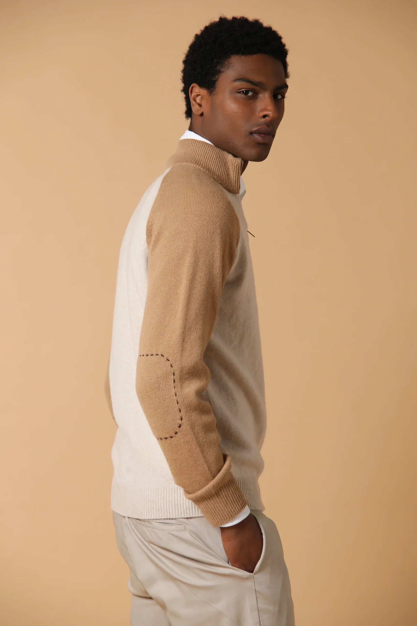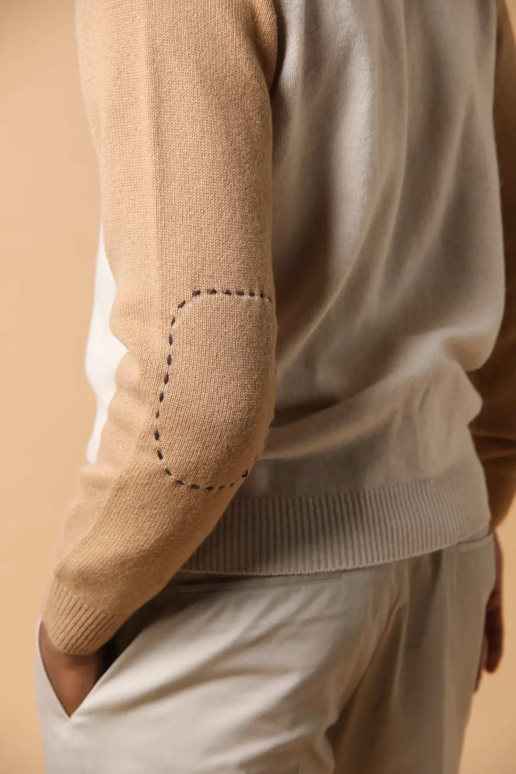 Il nostro bomber bicolore con maniche raglan รจ dotato di toppe ricamate a mano sui gomiti. Realizzata con una composizione di lana vergine al 70% e cashmere al 30%, questo bomber รจ un capo di lusso che offre comfort e stile.