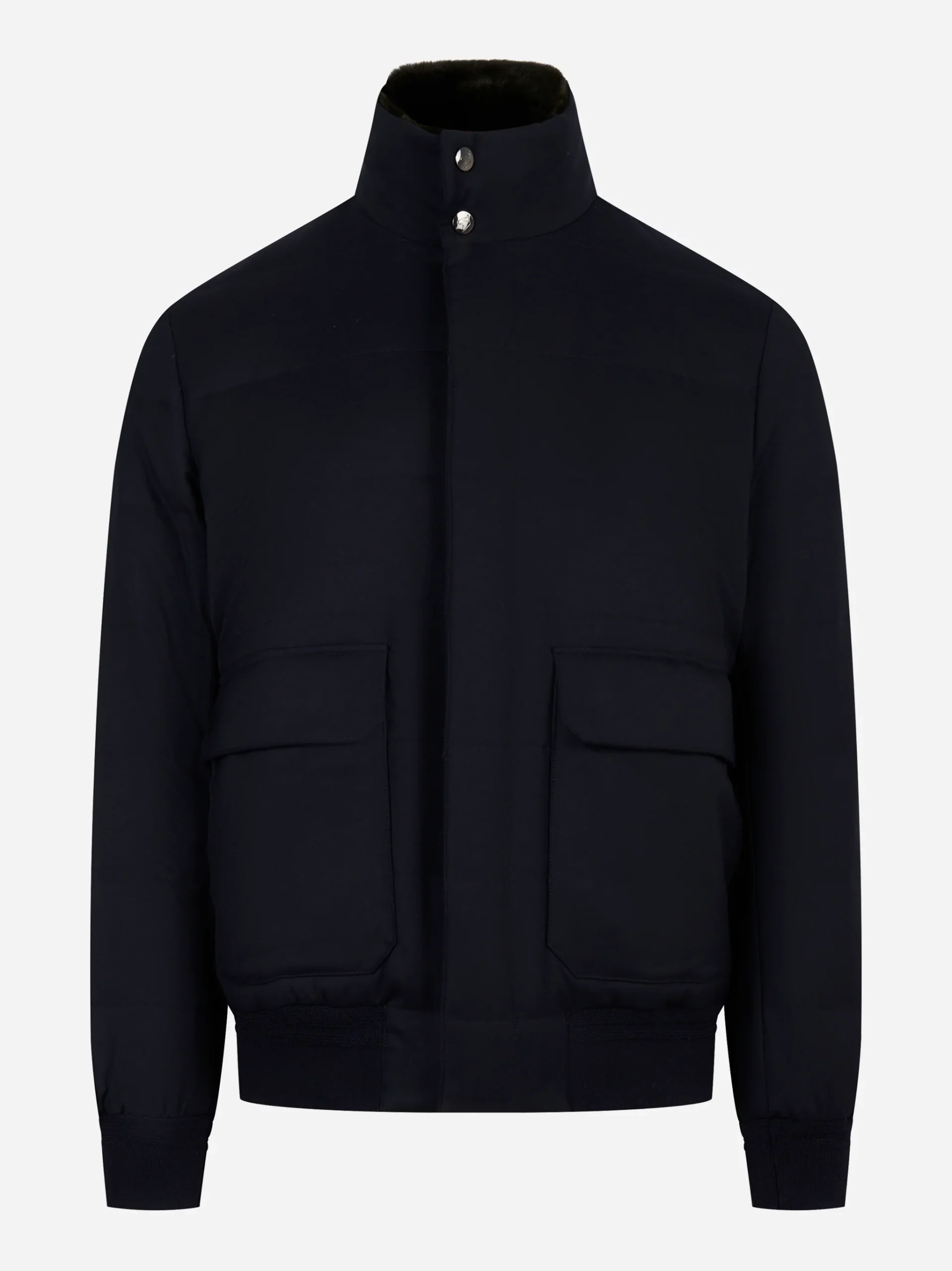 - Bomber in lana color blu con collo in pelliccia removibile