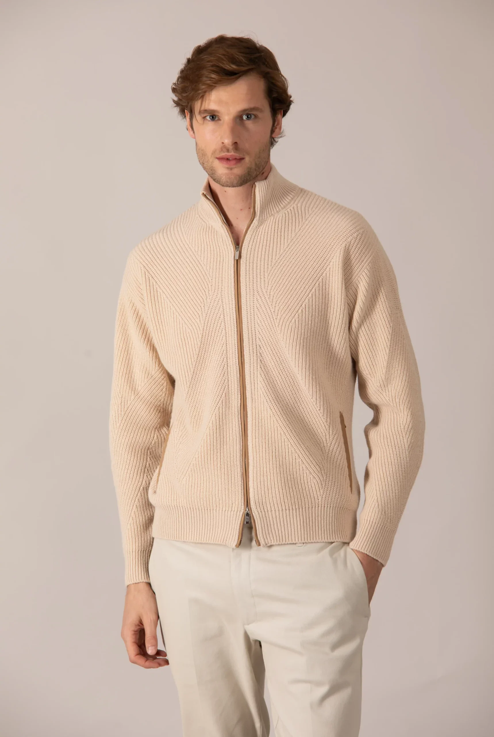 Bomber in cashmere realizzata in maglia inglese con dettagli in suede, contiene un doppio cursore e delle tasche.
