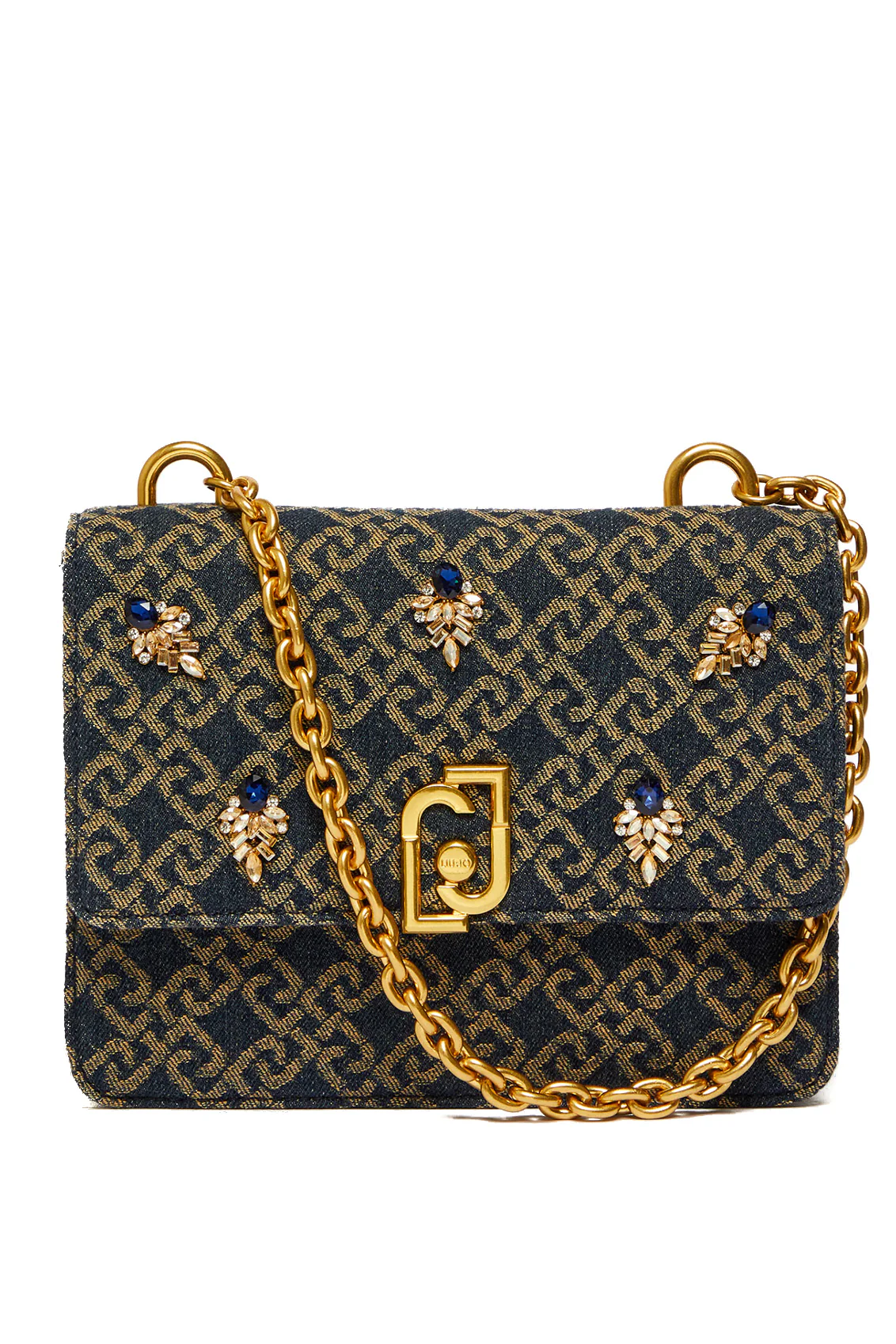 Borsa a mano in tessuto effetto denim con logo jacquard e strass