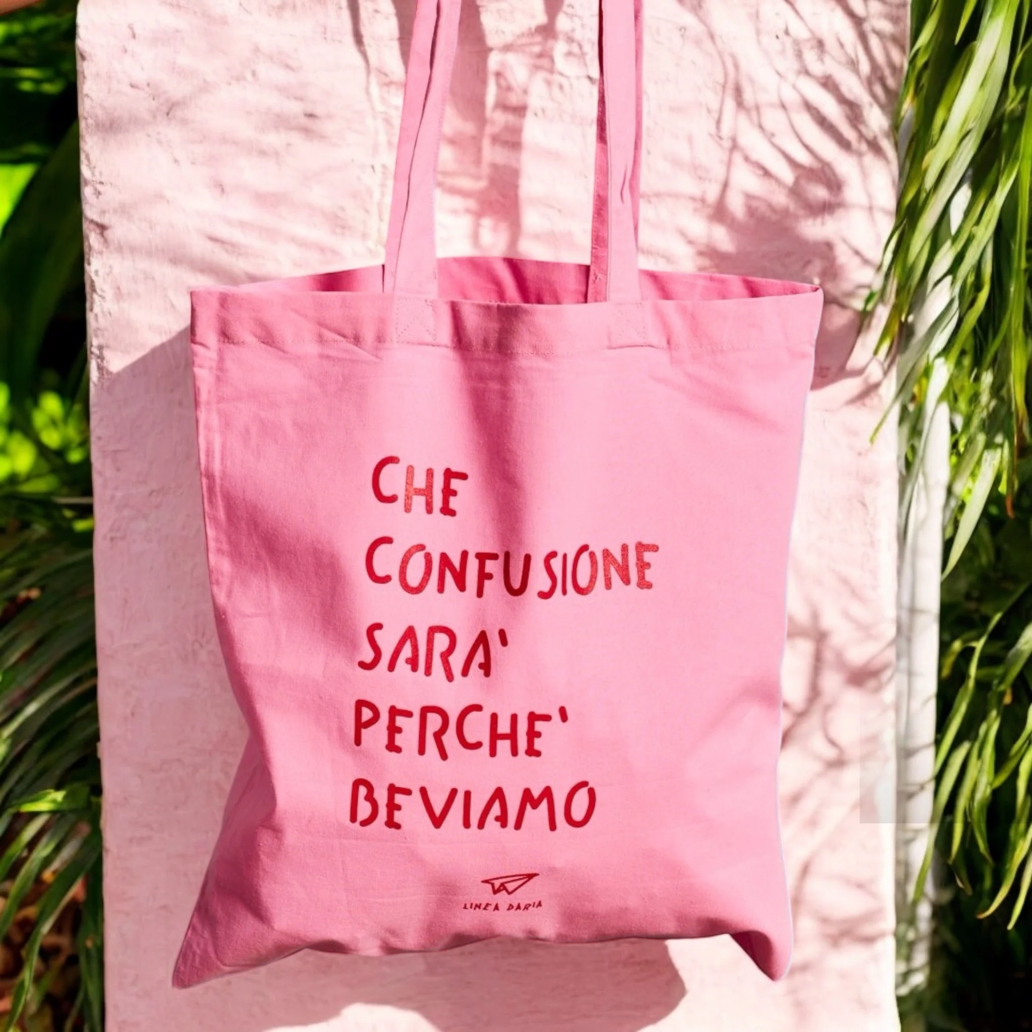 Shopper Bag in EDIZIONE LIMITATA creata da Linea Daria Shopper bag in cotone decorata con grafica “Che Confusione sará perché Beviamo” 100% cotone organico, 400 g/m2 Misura tasca 50 x 50 cm, misura manici 70 cm