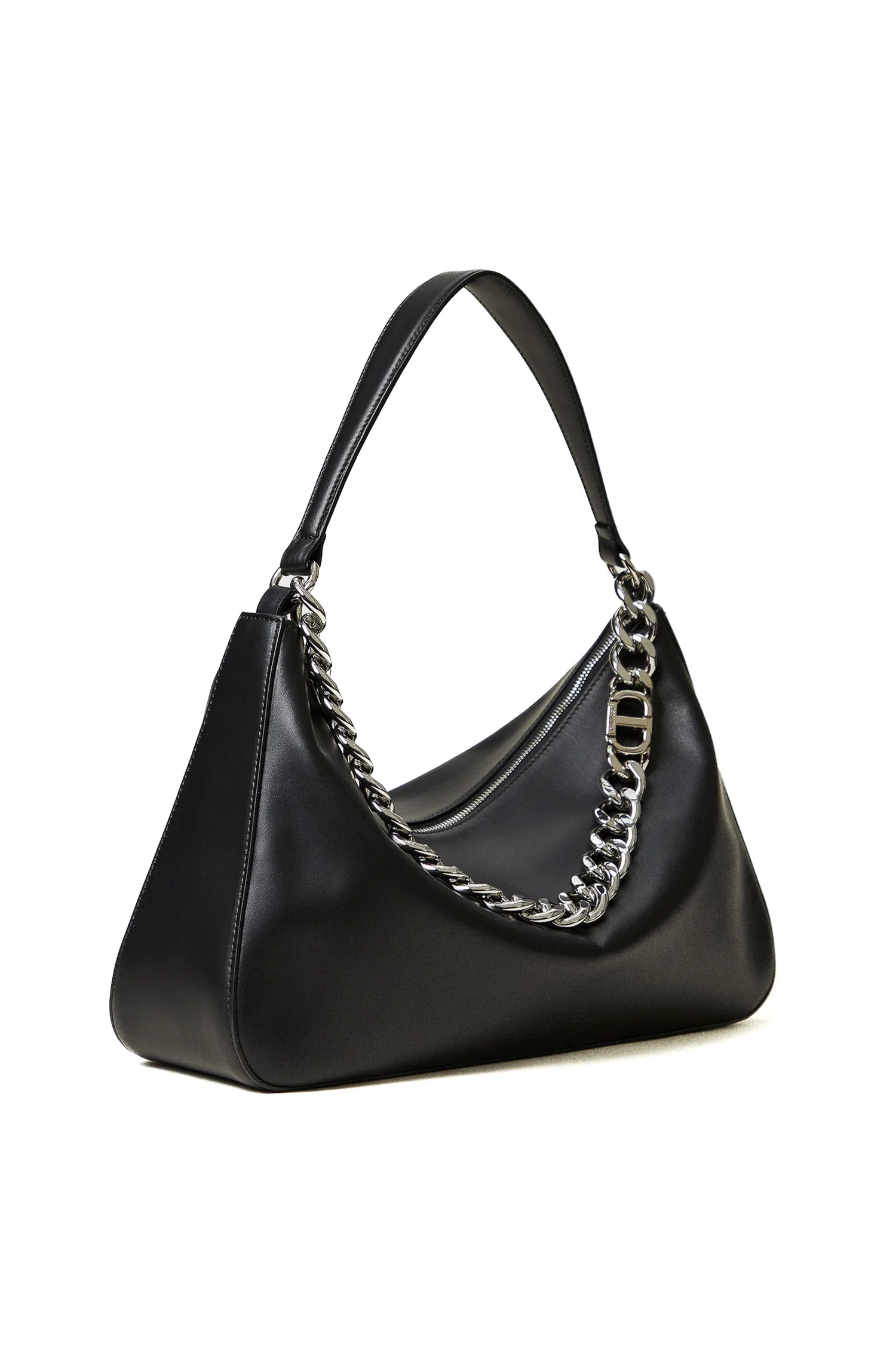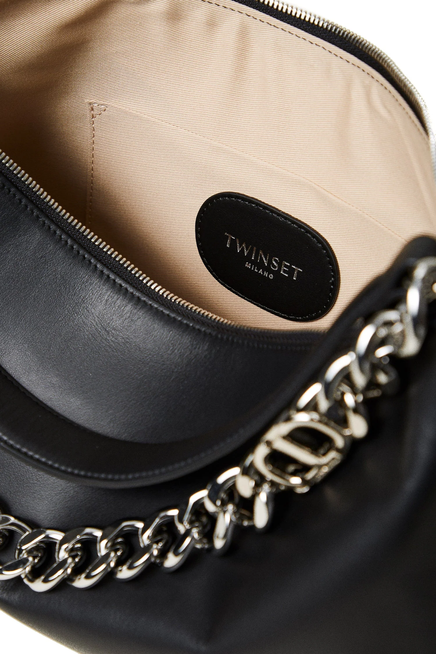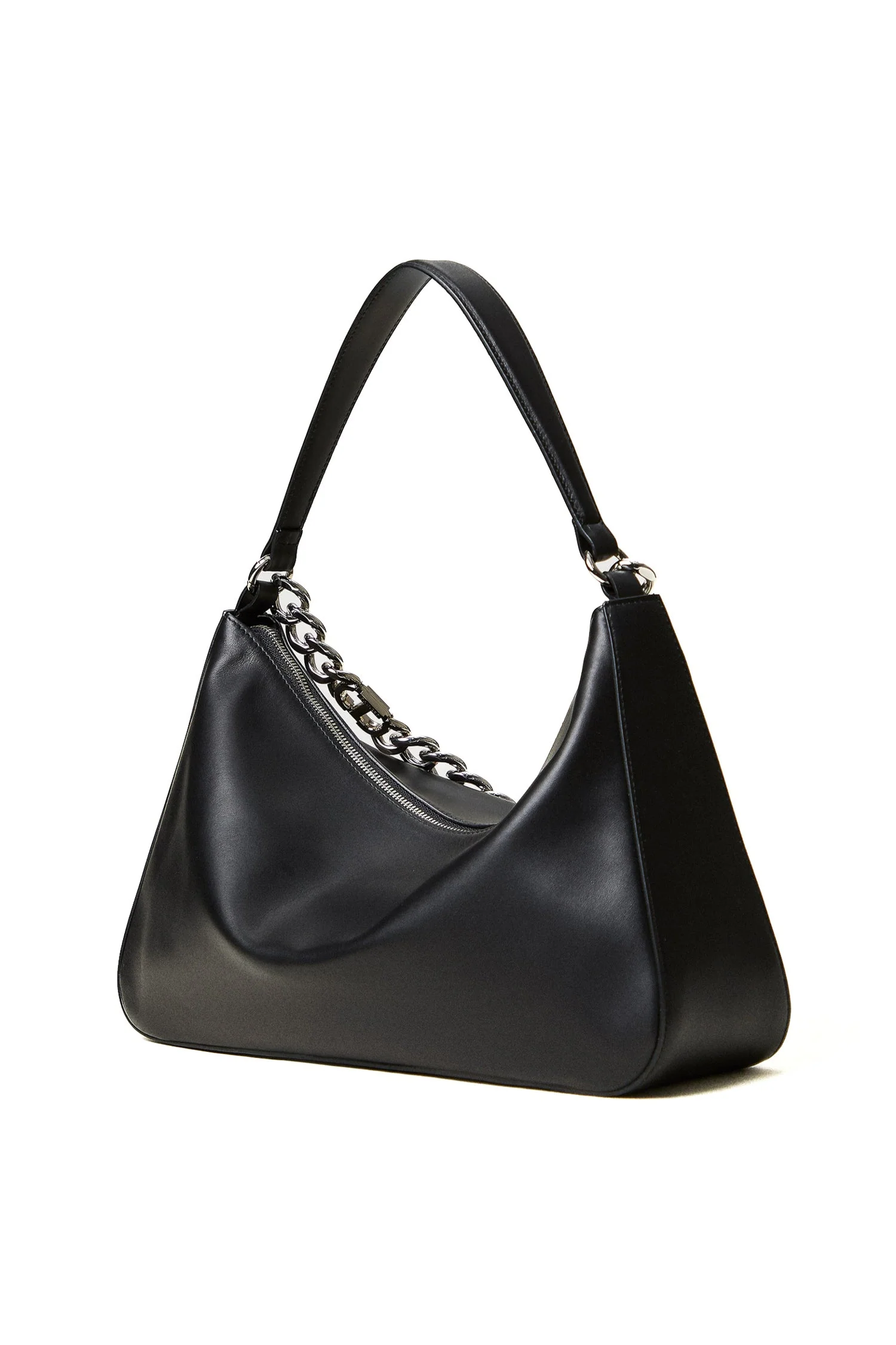 Borsa hobo ‘Liliane’ made in Italy, realizzata in pelle di vitello liscio pieno fiore con trattamento anti goccia e antigraffio. Il corpo è realizzato a colonna, con logo impresso a caldo, e foderato con un twill in misto cotone. Ha due manici staccabili, da indossare simultaneamente o separati per diverse interpretazioni di styling: uno in pelle sagomato e imbottito, l’altro è una catena in lega leggera in galvanica oro con l’Oval T inserito tra le maglie.