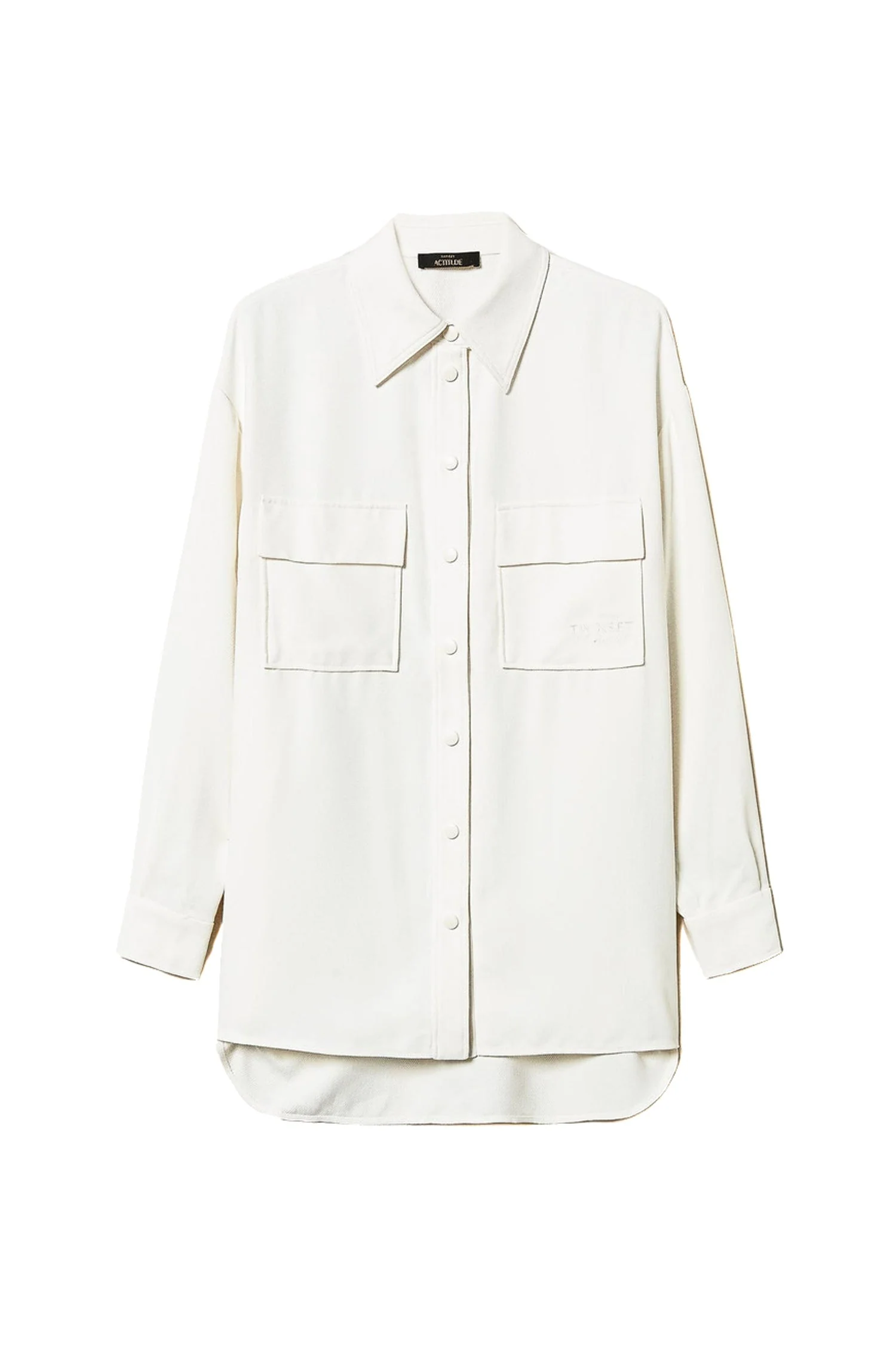 Camicia collezione Actitude in crêpe piquet con bottoni a pressione. Ha maniche lunghe ampie, spalle scese, carré sul retro, tasche con patta applicate davanti, fondo arrotondato e linea dritta.