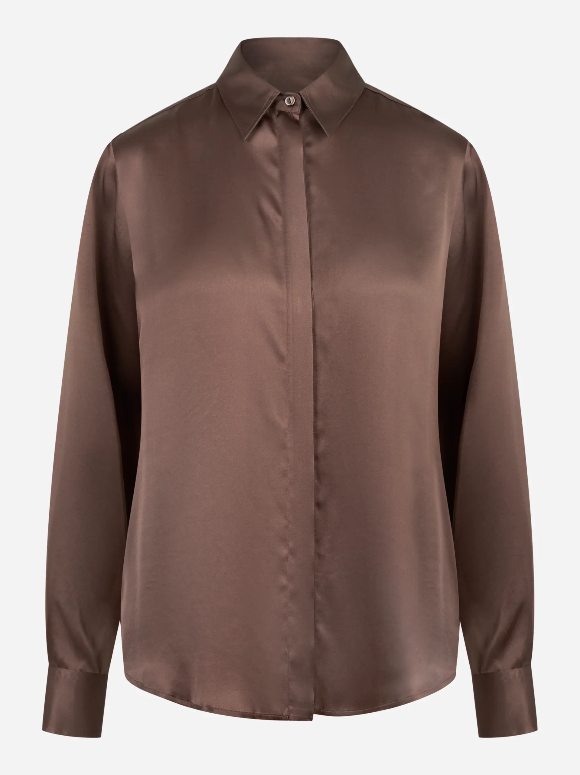 ITEM INFO Camicia in seta stretch colore marrone Colletto classico e cannoncino coperto Chiusura frontale con bottoni nascosti Senza tasche Vestibilità scivolata, maniche lunghe Polsini con bottone Composizione: 96% seta, 4% elastan