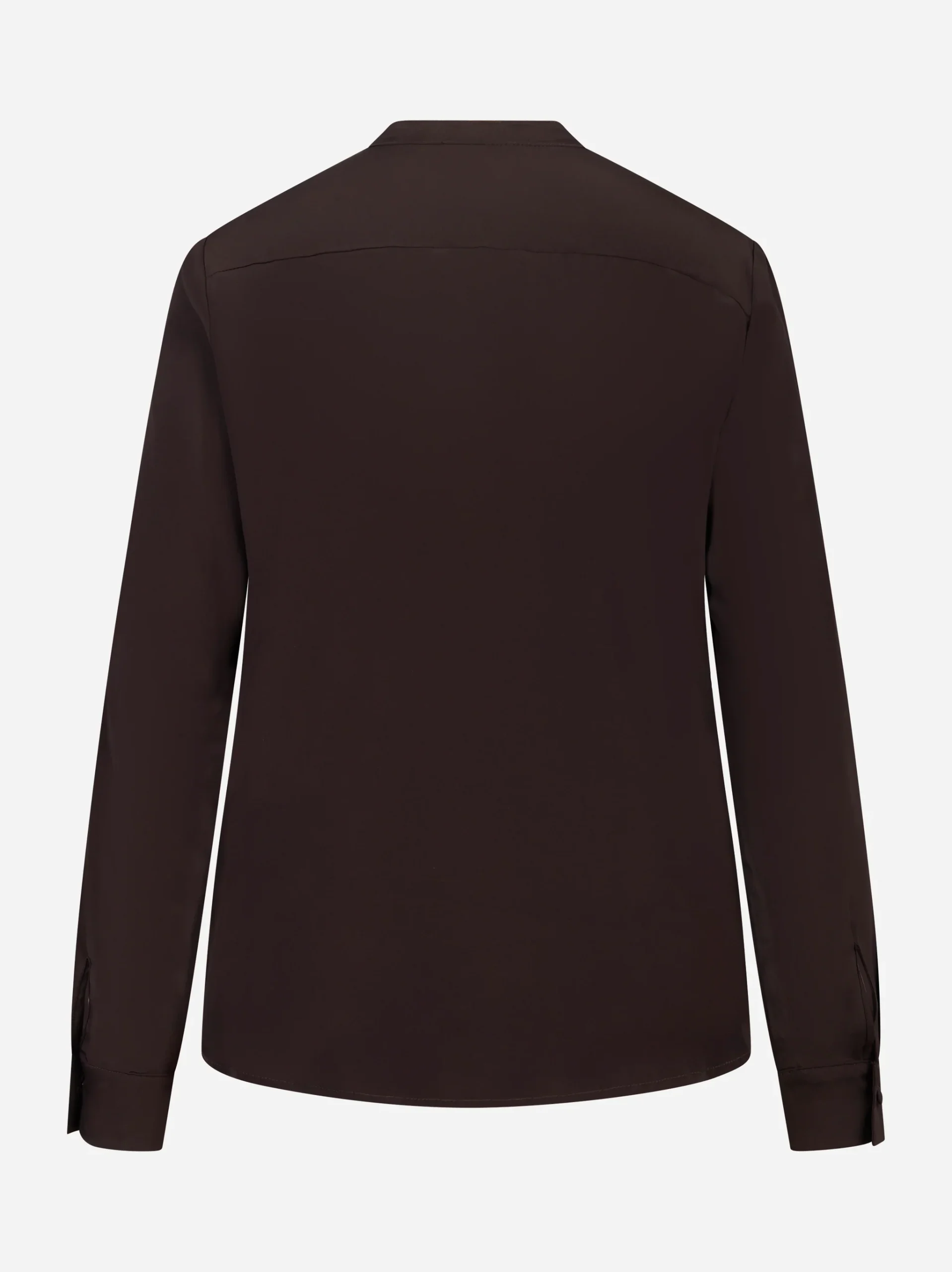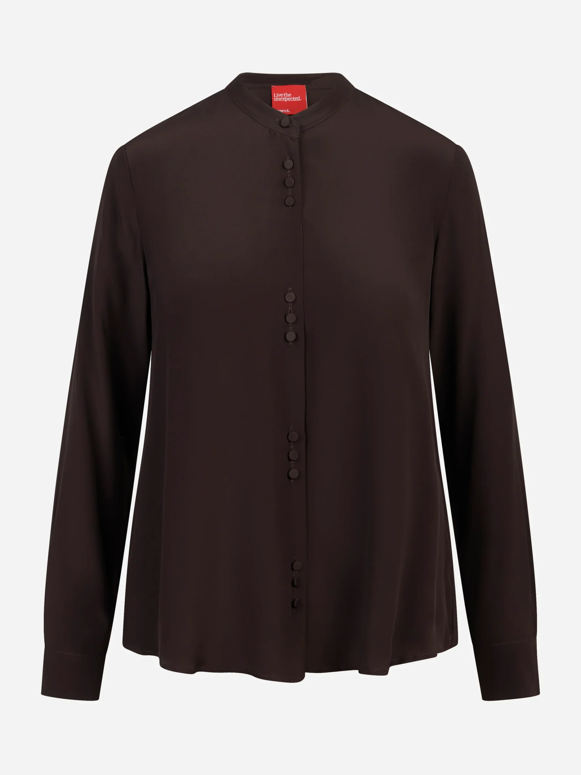 ITEM INFO Camicia coreana in misto seta color marrone, mano fluida Collo alla coreana e bottoni rivestiti tono su tono Chiusura frontale con abbottonatura Senza tasche Vestibilità morbida, maniche lunghe con polsino Fondo leggermente arrotondato Composizione: 30% seta, 70% acetato