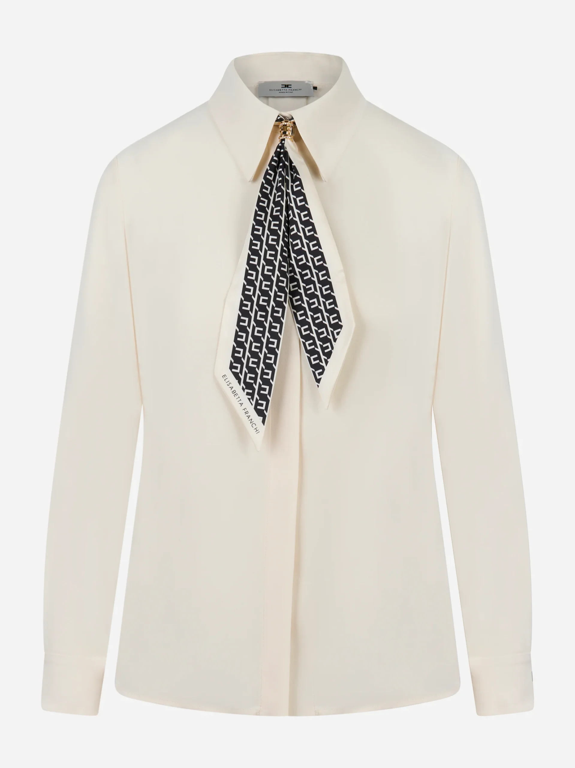 ITEM INFO Camicia in georgette di viscosa color avorio Colletto classico con foulard removibile stampato e logo Chiusura frontale nascosta Maniche lunghe con polsini abbottonati Linea morbida con piega centrale sul retro Dettaglio gioiello dorato al collo 100% viscosa. Made in Italy.