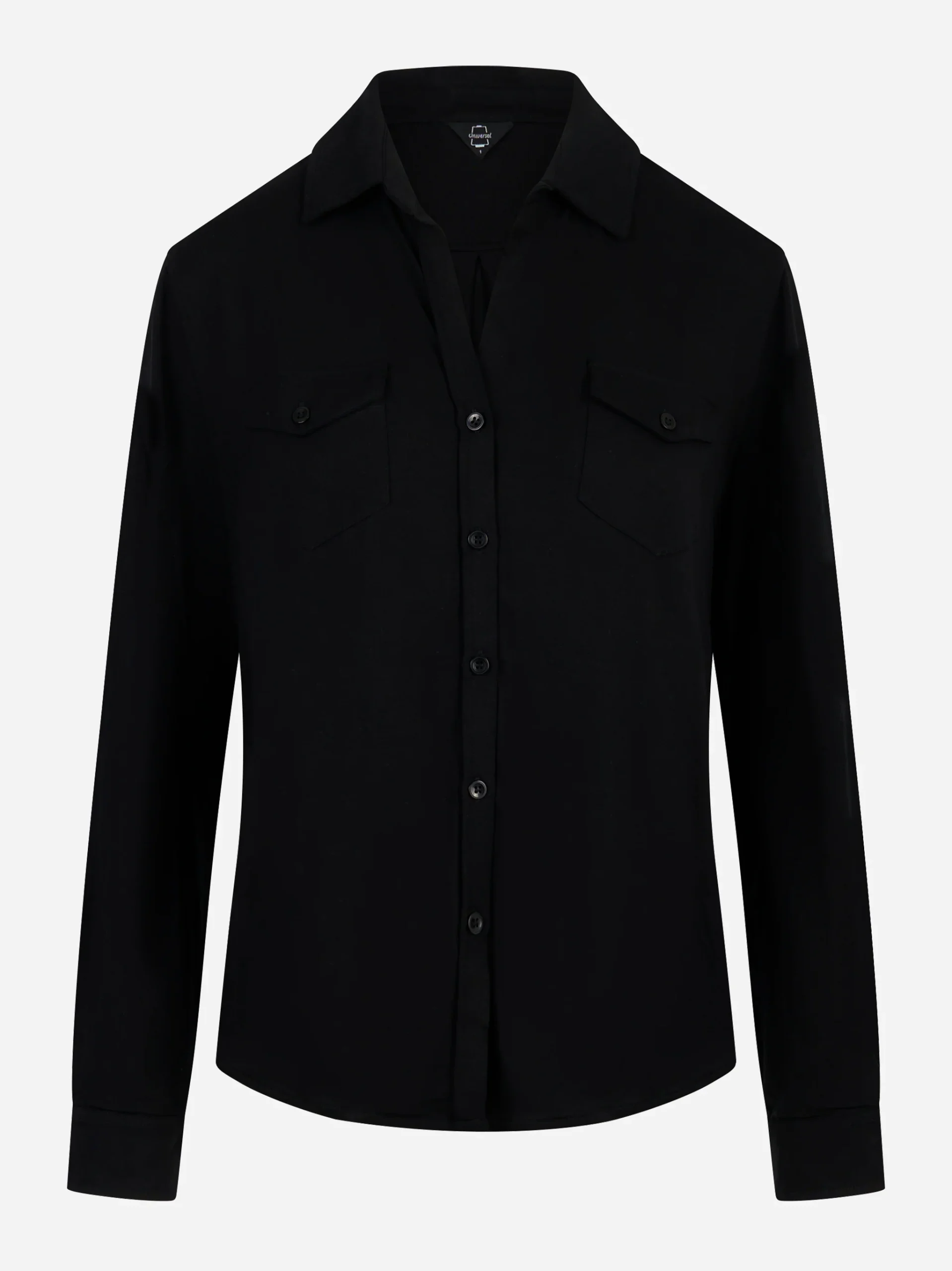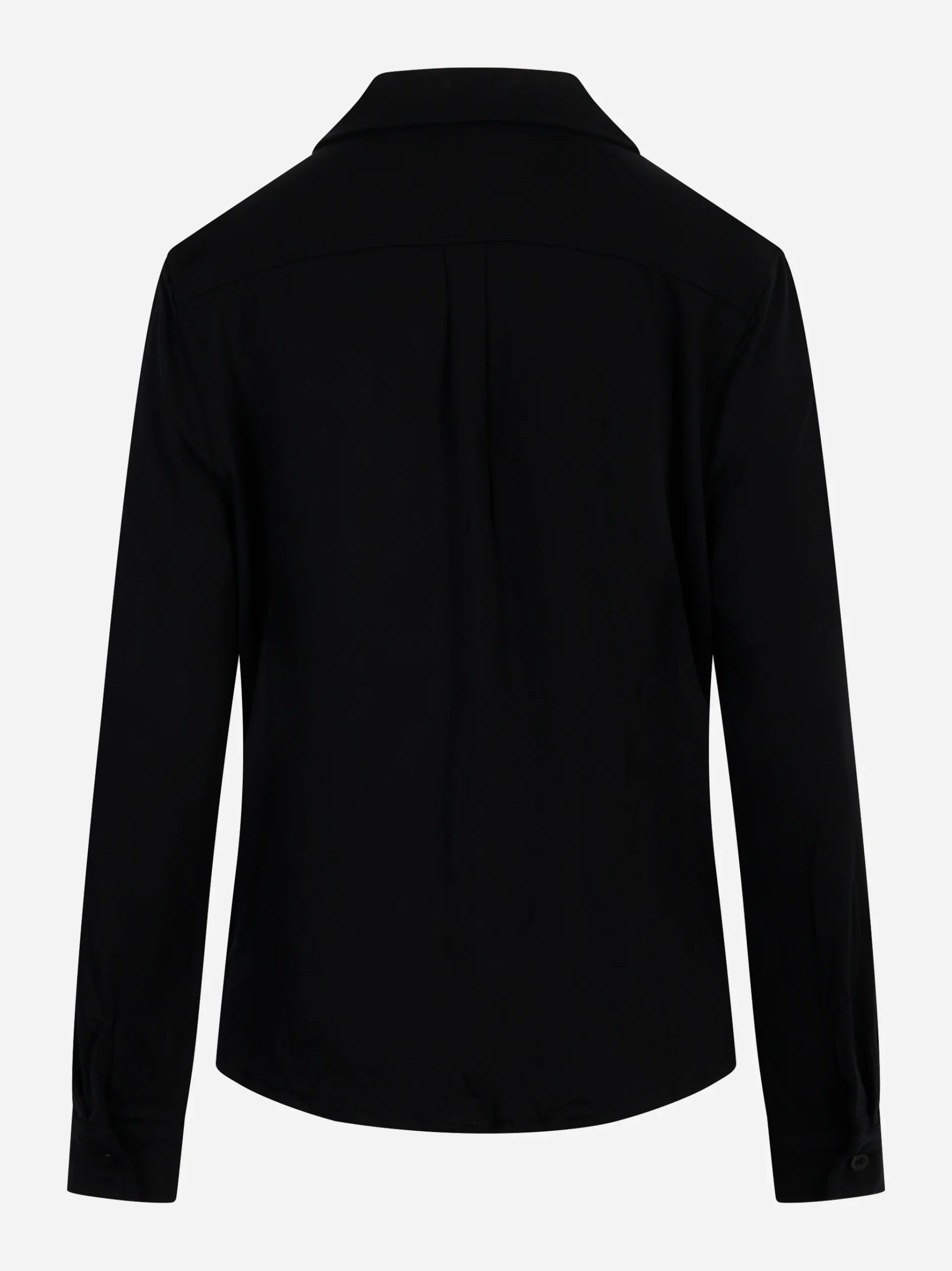 ITEM INFO Camicia in jersey di viscosa Nero Design essenziale con linee pulite Finitura a costine su collo, polsi e orlo Maniche lunghe e vestibilità regolare Texture morbida al tatto Ideale per la stagione autunno/inverno Composizione: 95% Viscosa, 5% Elastan Made in Italy
