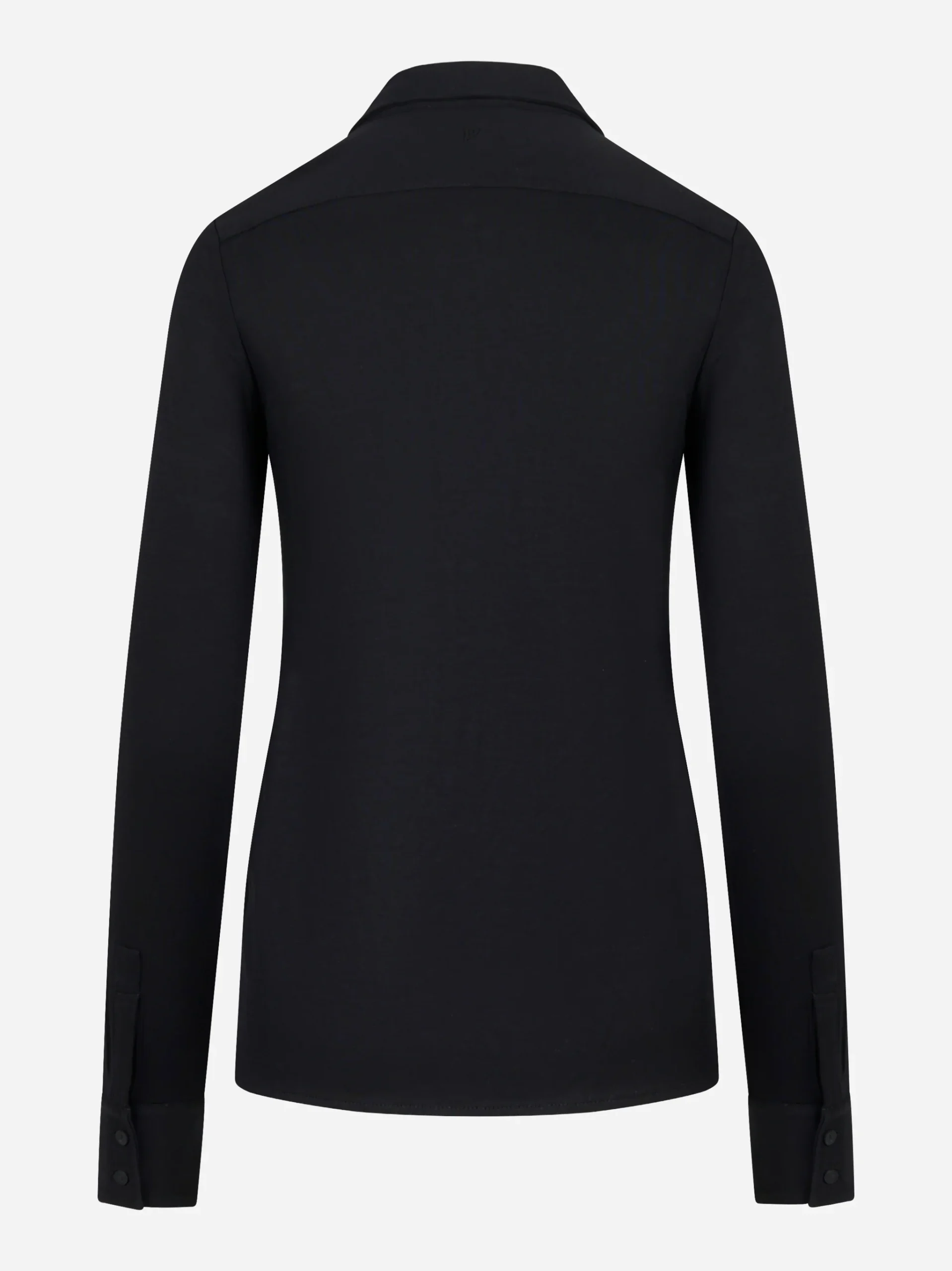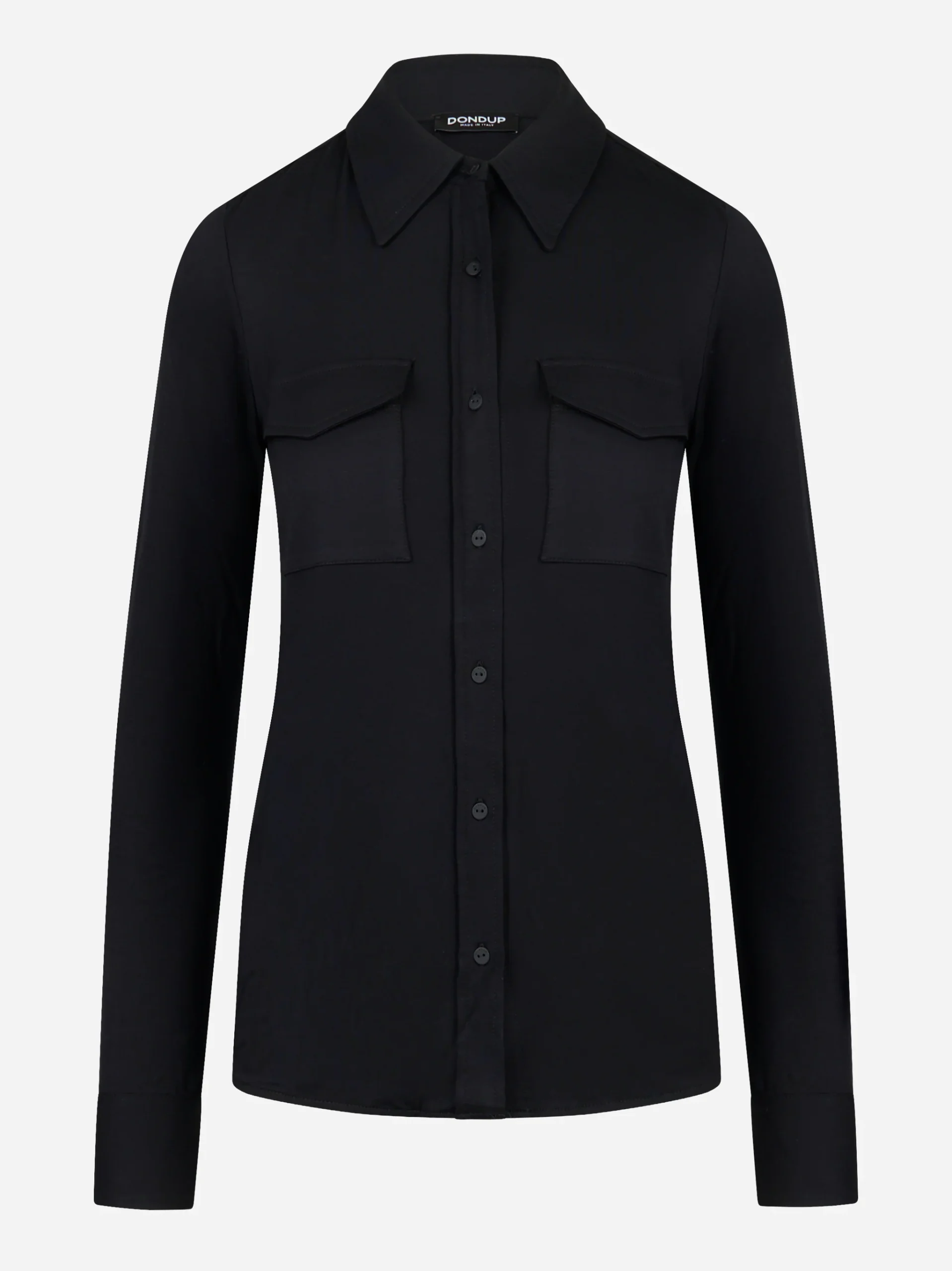 ITEM INFO Camicia in jersey di viscosa nera Revers classici a lancia Chiusura frontale con bottoni Tasche laterali con pattina Linea sartoriale Struttura elegante e contemporanea Capo versatile adatto a ogni occasione Composizione: 06% elastane, 94% viscosa Made in Italy