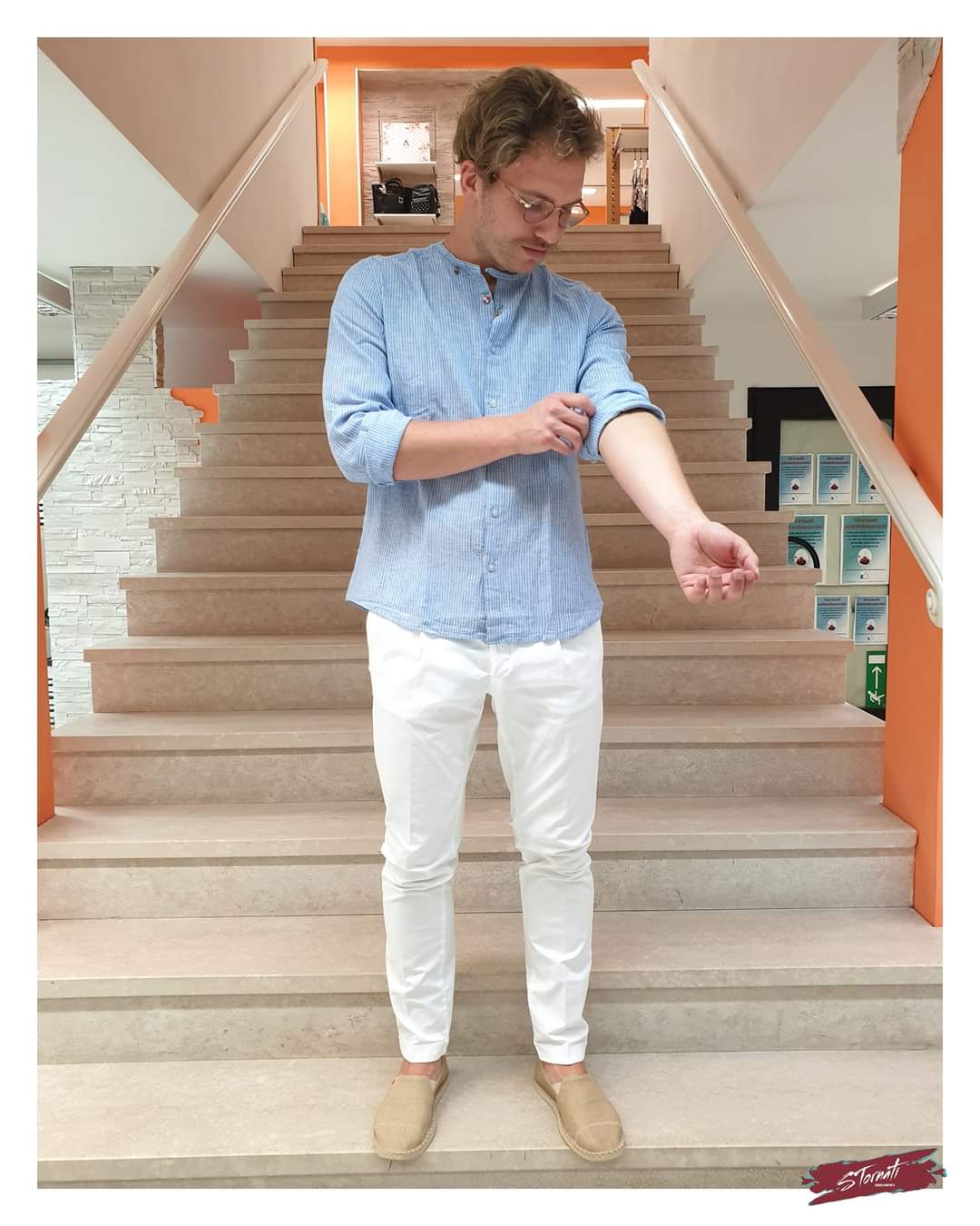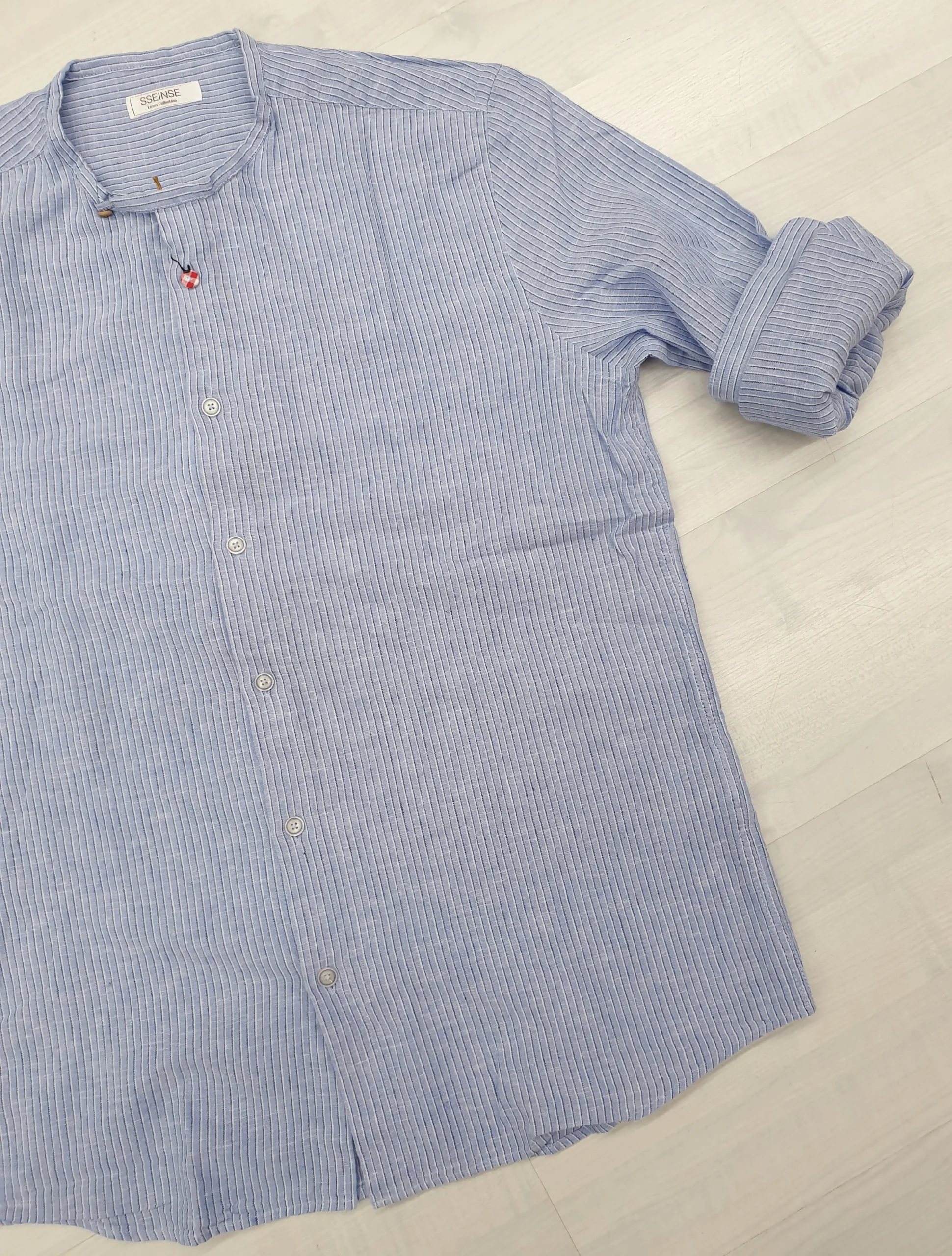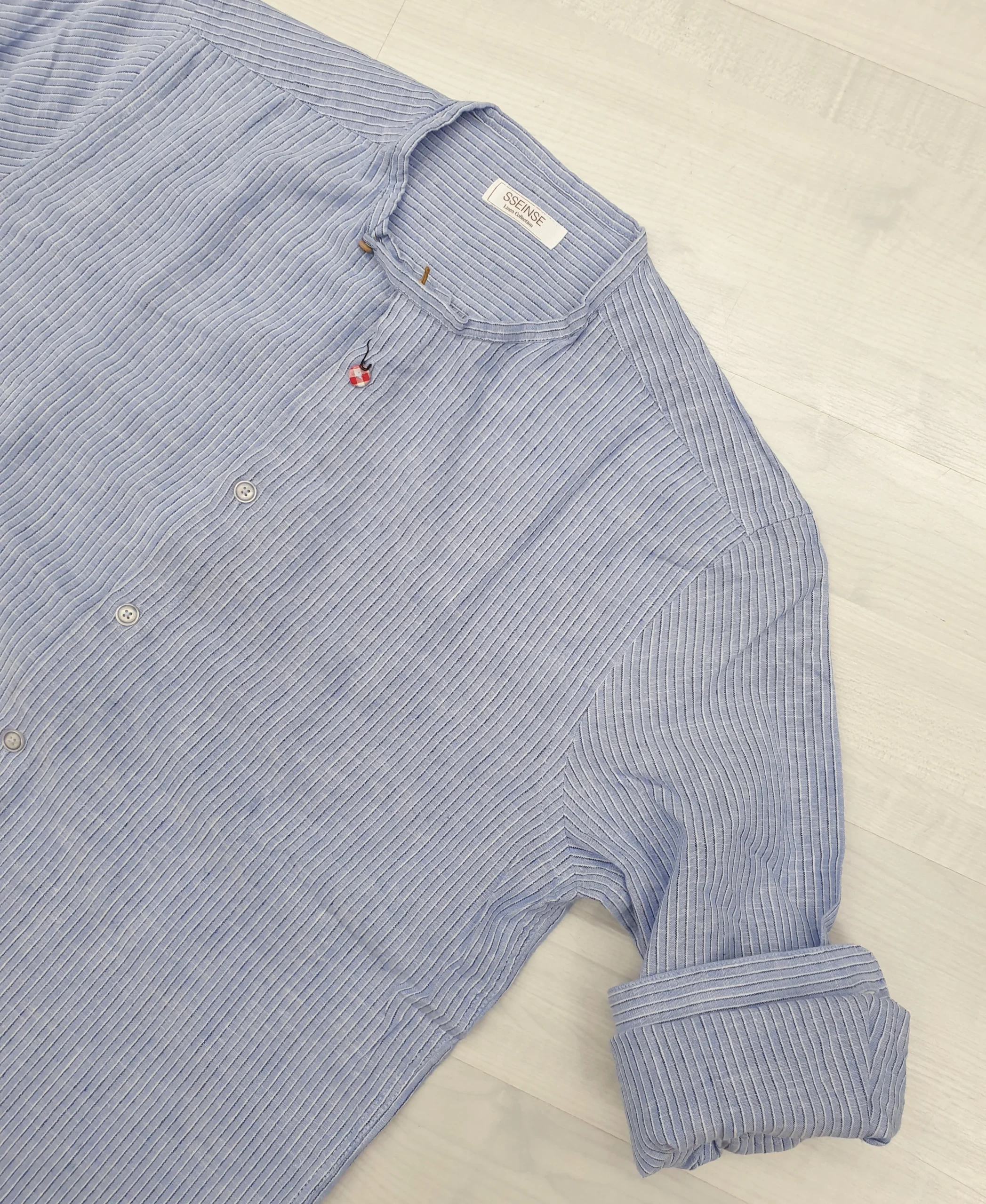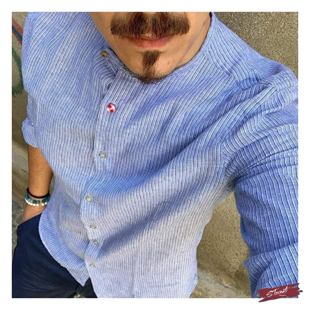 Camicia lino m/l girocollo azzurra righine blu e bianche. Modello slim fit con pinces retro, dettaglio bottoni a contrasto, vestibilità fluida.
