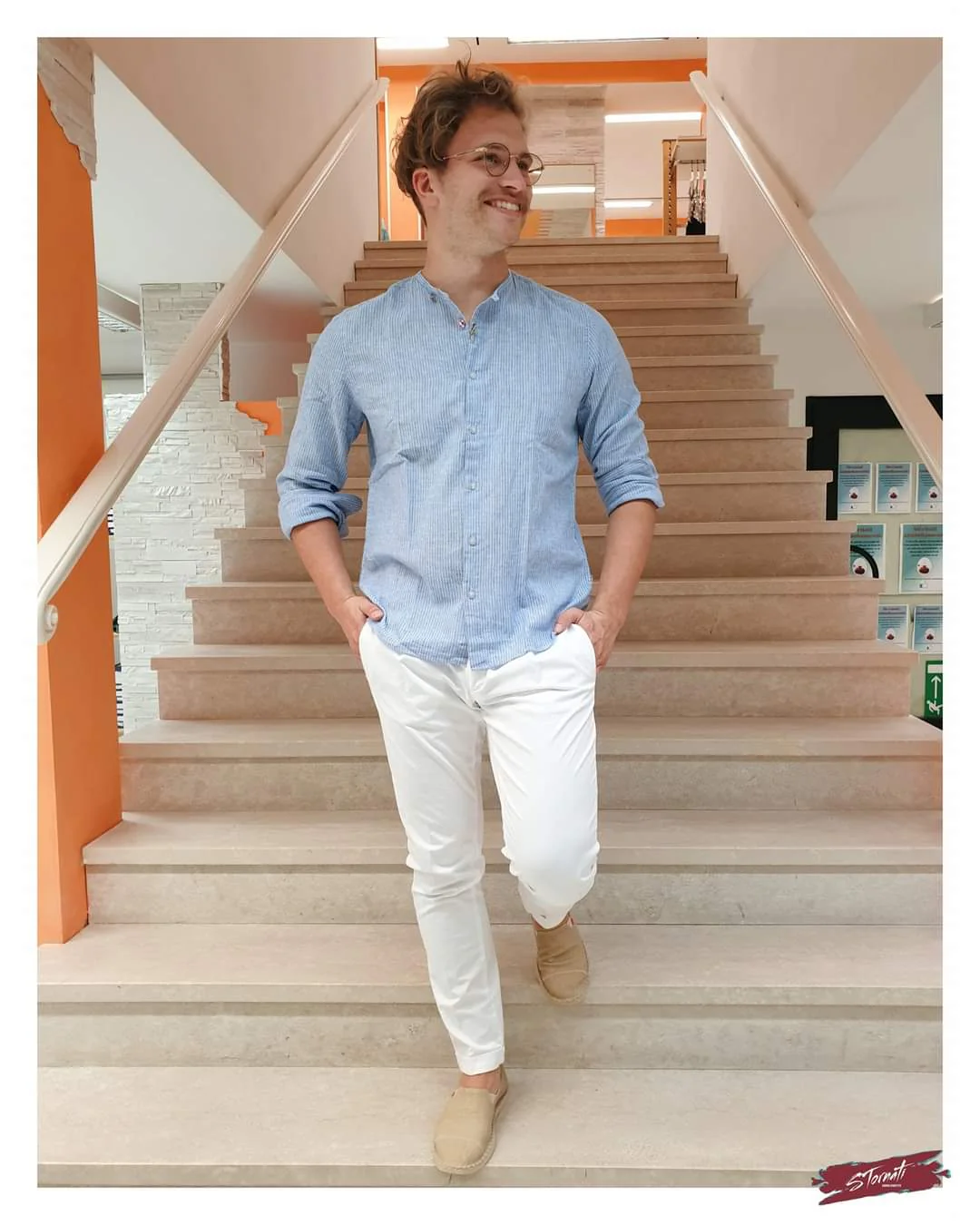 Camicia lino m/l girocollo azzurra righine blu e bianche. Modello slim fit con pinces retro, dettaglio bottoni a contrasto, vestibilità fluida. >> Il modello in foto indossa la tg. M Composizione: 60% Lino 40% Cotone