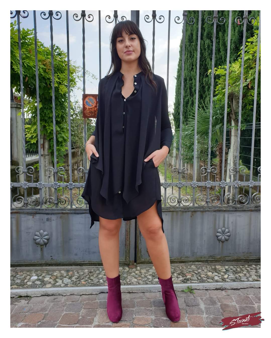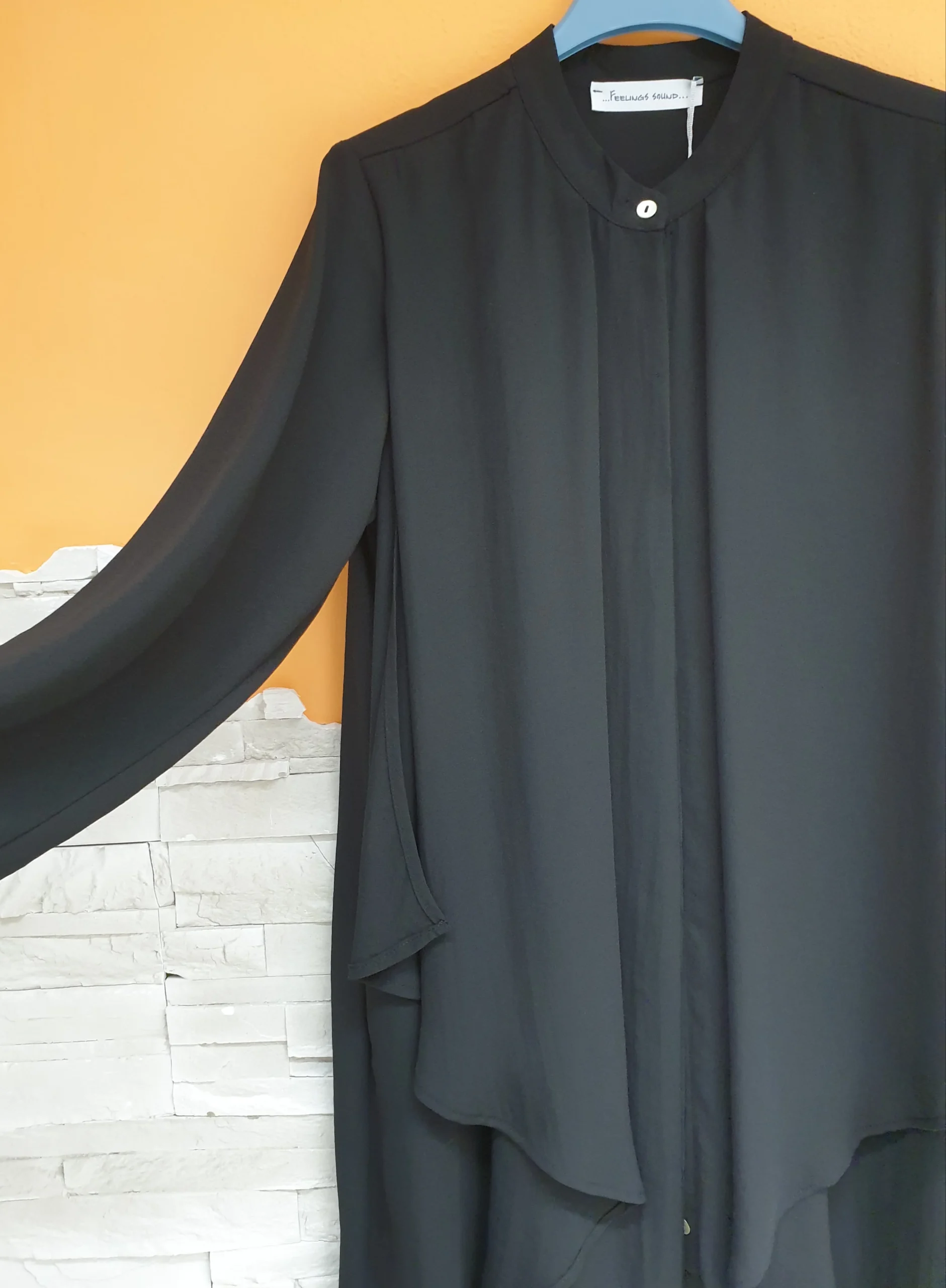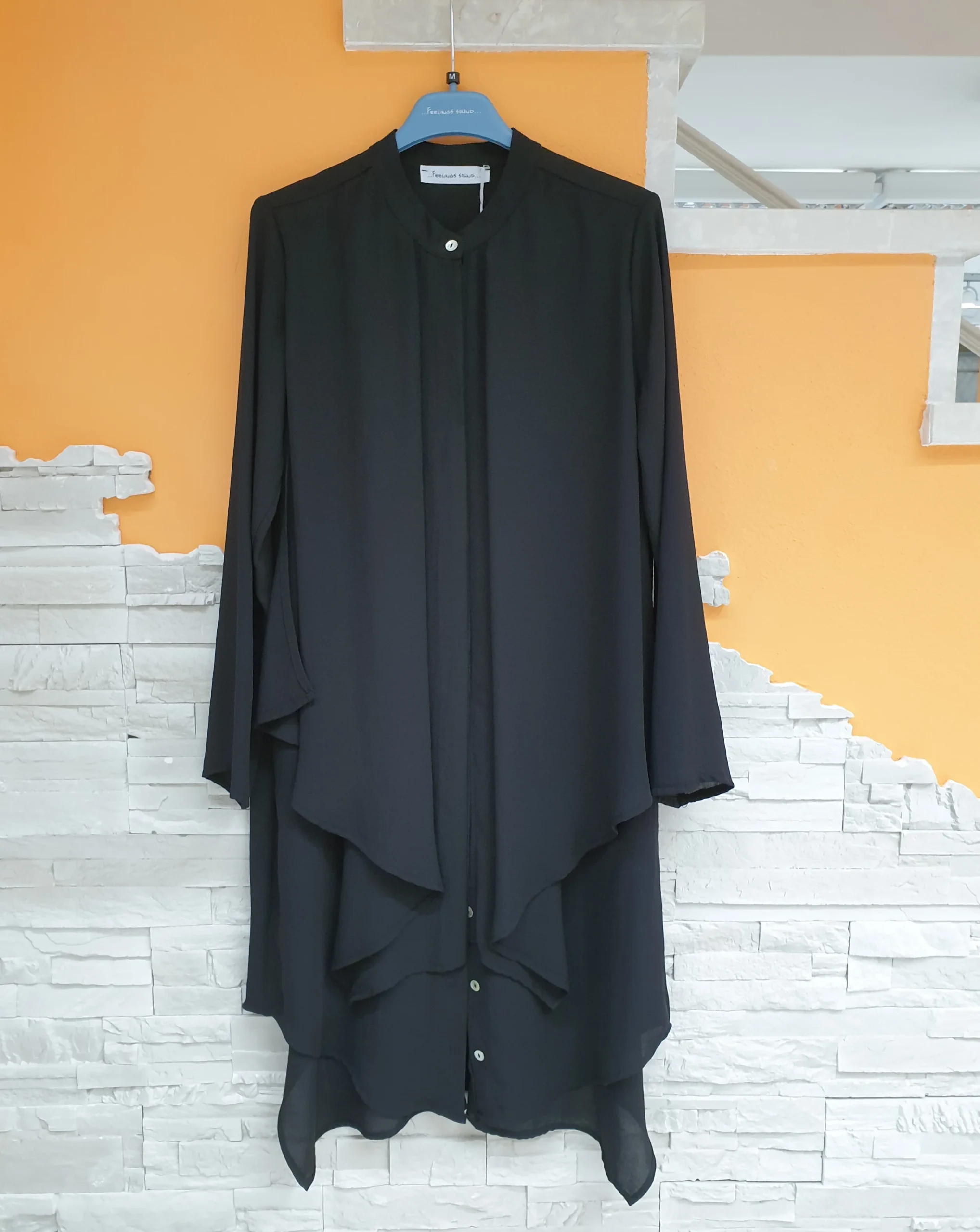 Camicione nero pannelli voile con bottoncini madreperlati. Collo a coreana, manica lunga e fondo stondato.
