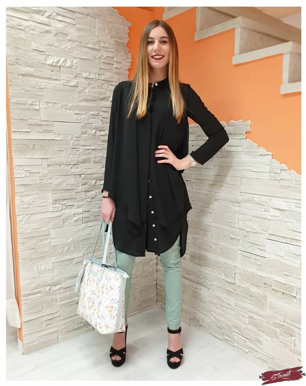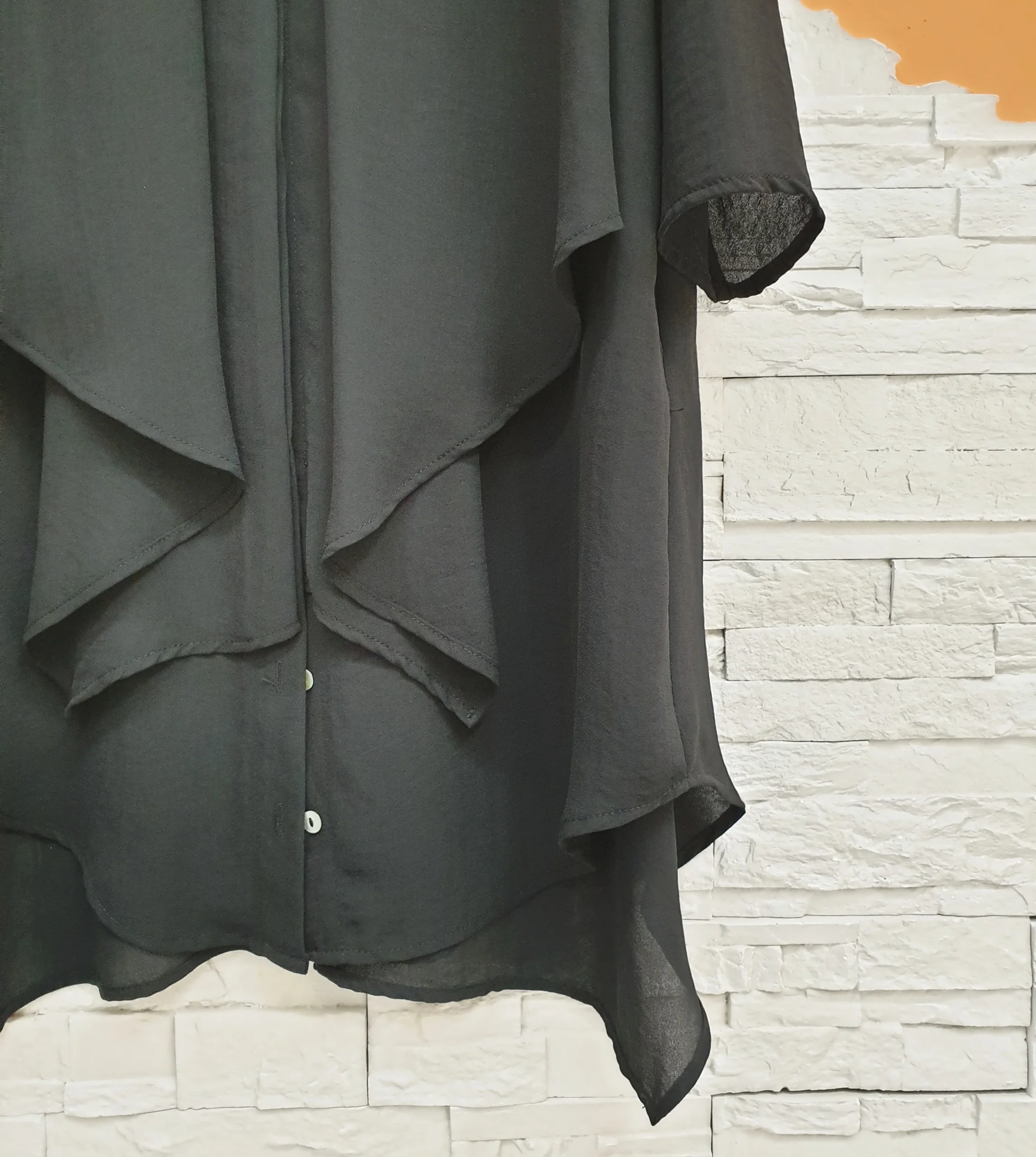 Camicione nero pannelli voile con bottoncini madreperlati. Collo a coreana, manica lunga e fondo stondato. Composizione: