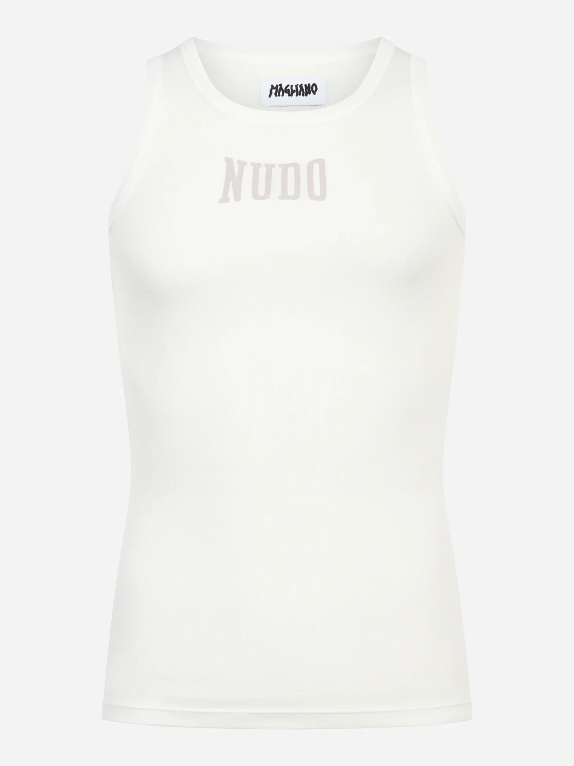 ITEM INFO Canotta in cotone stretch bianca Girocollo ampio Senza maniche Stampa logo a contrasto sul davanti Fondo dritto Tinta unita bianca Collezione Uomo Primavera Estate 2026 Composizione: 93% Cotone, 7% Elastane Made in Italy