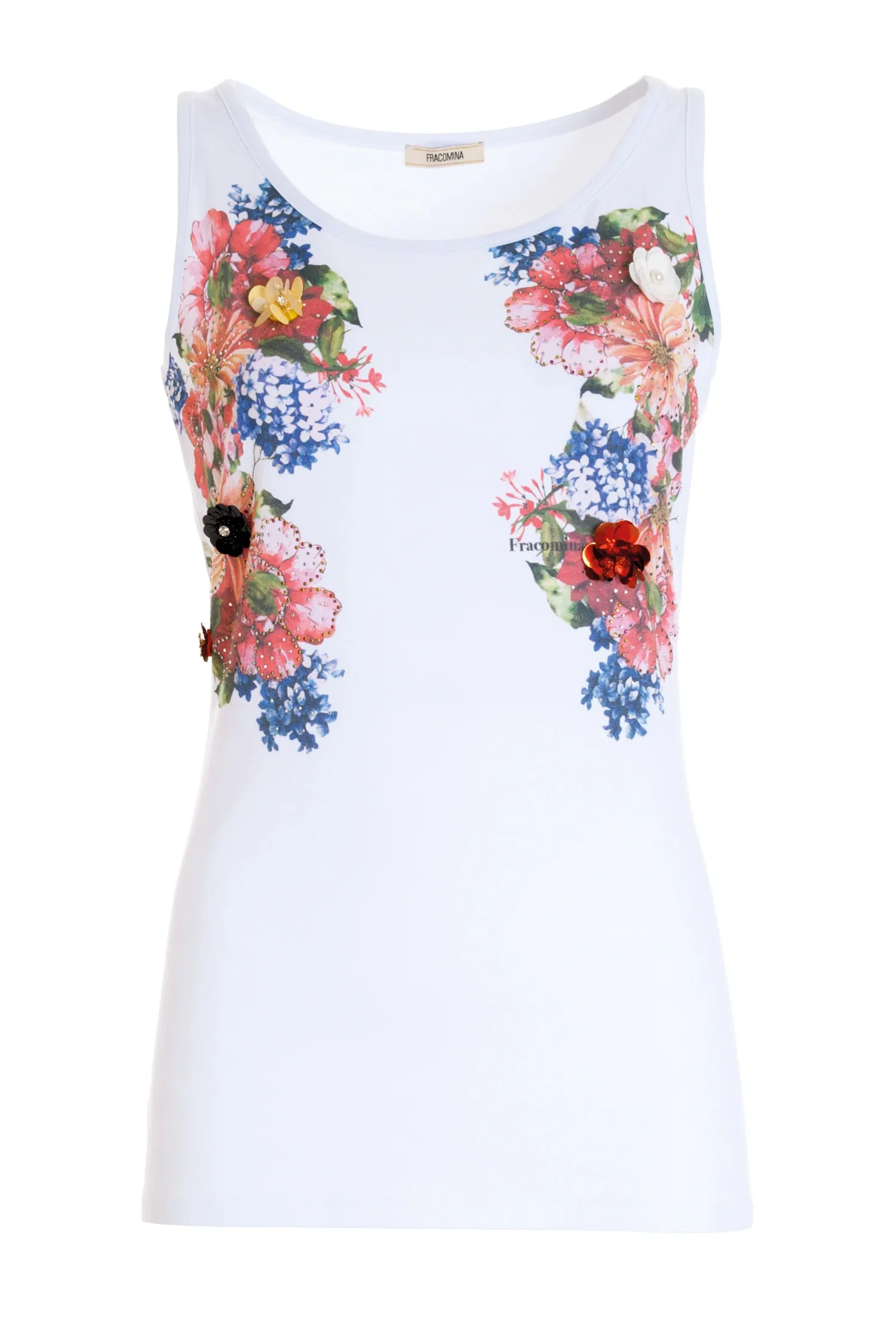 Codice Prodotto: FR22ST3001J401N5-278 Dettagli:Canotta slim in jersey con stampa floreale, girocollo, e con applicazioni 3D. COMPOSITION: COTTON 95% ELASTANE 5% Vestibilità:Regolare