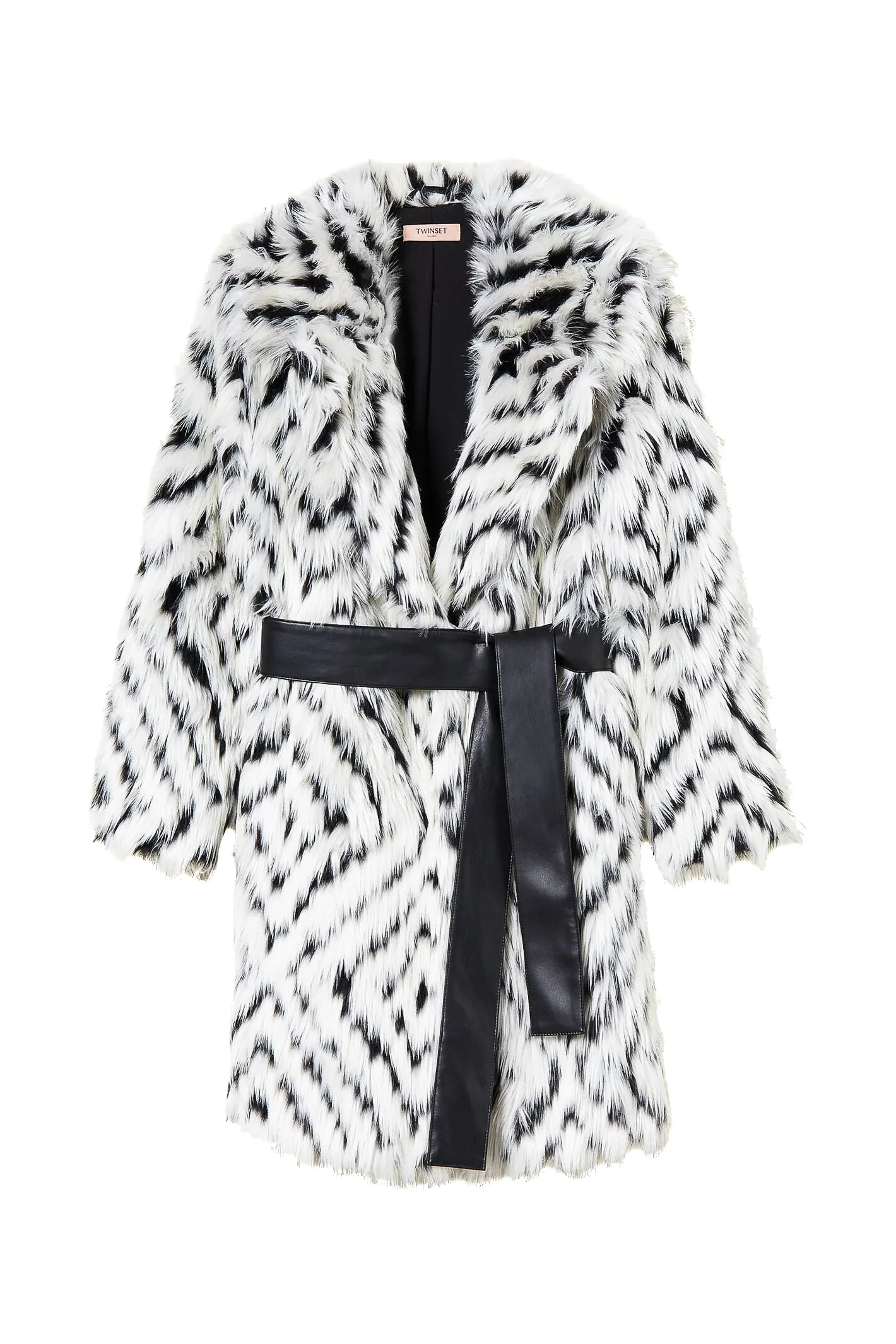 Cappotto bianco in faux fur a fantasia chevron con cintura abbinata