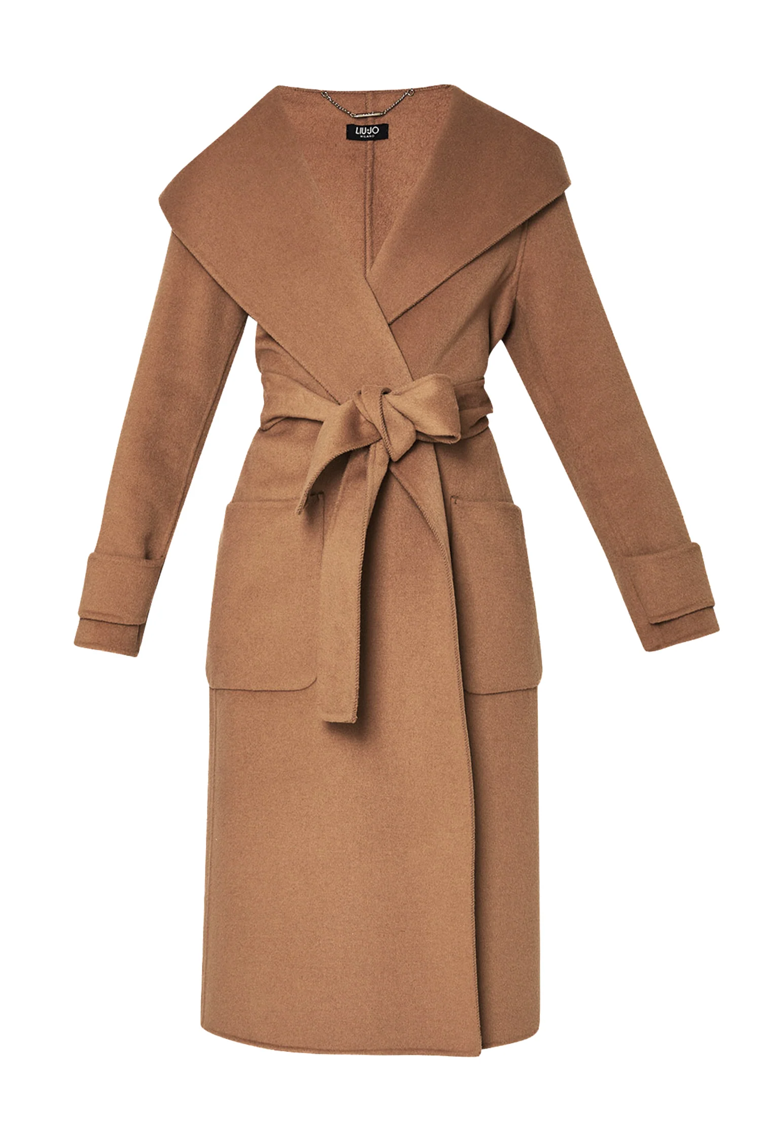 Cappotto cammello in misto lana con maxi revers e cappuccio