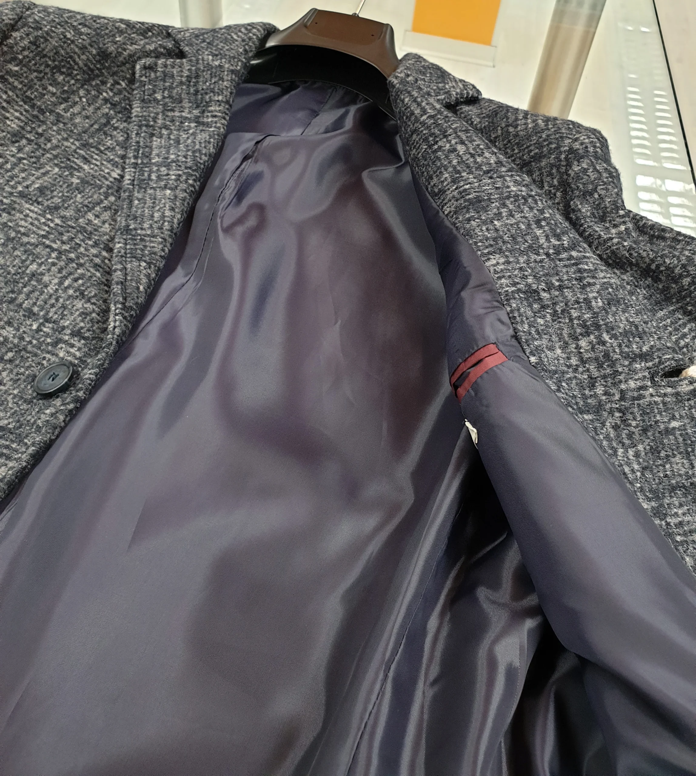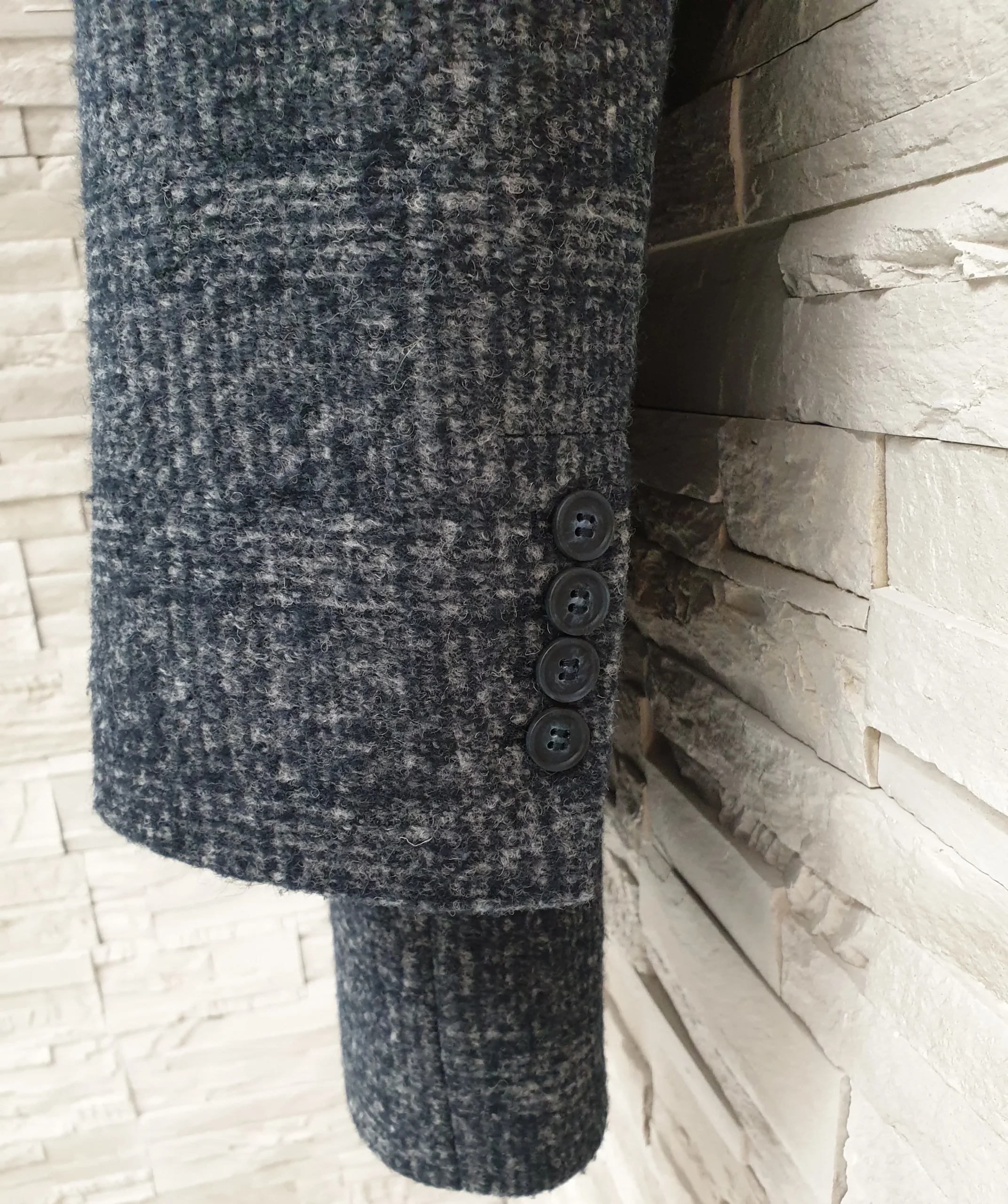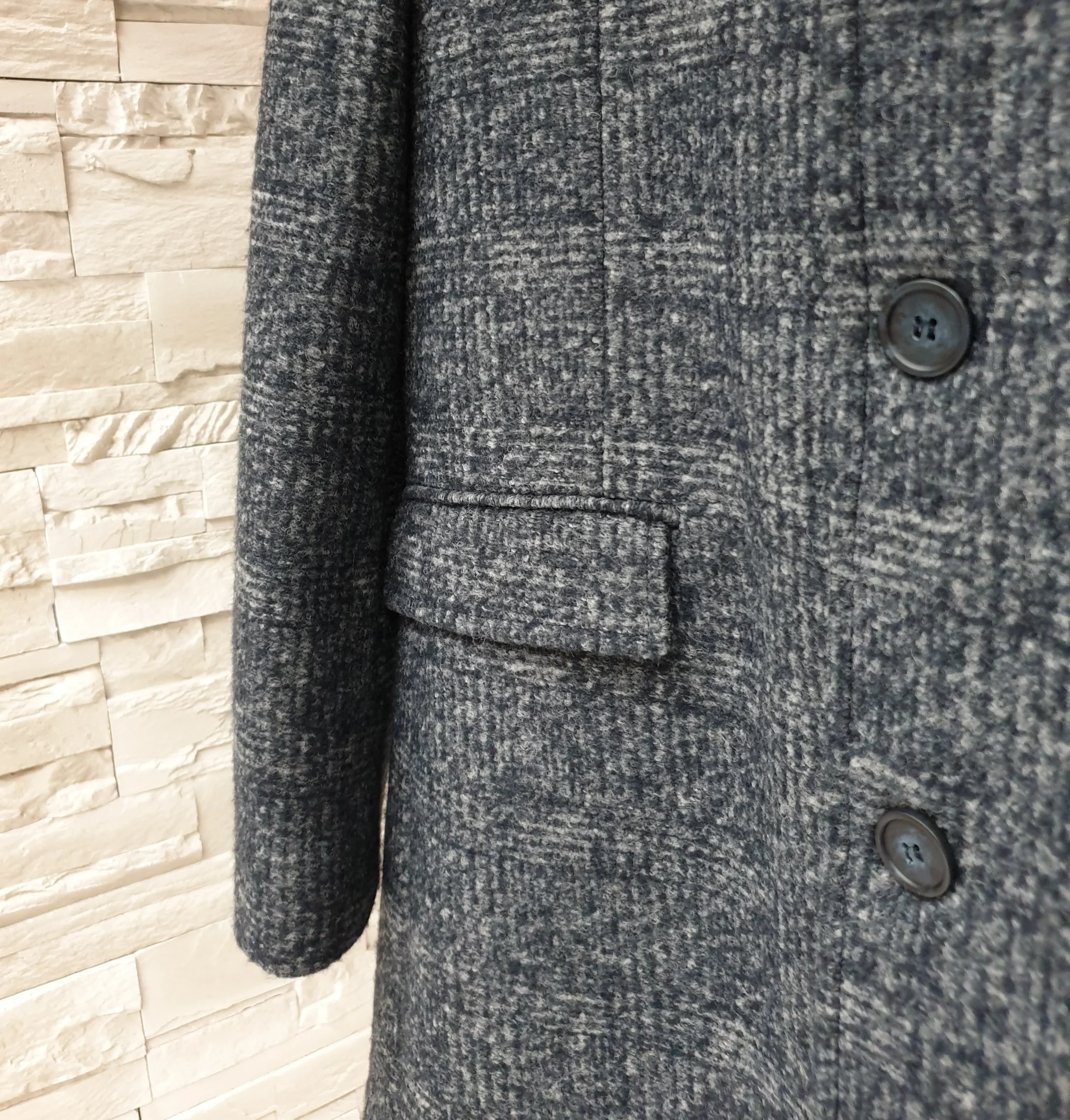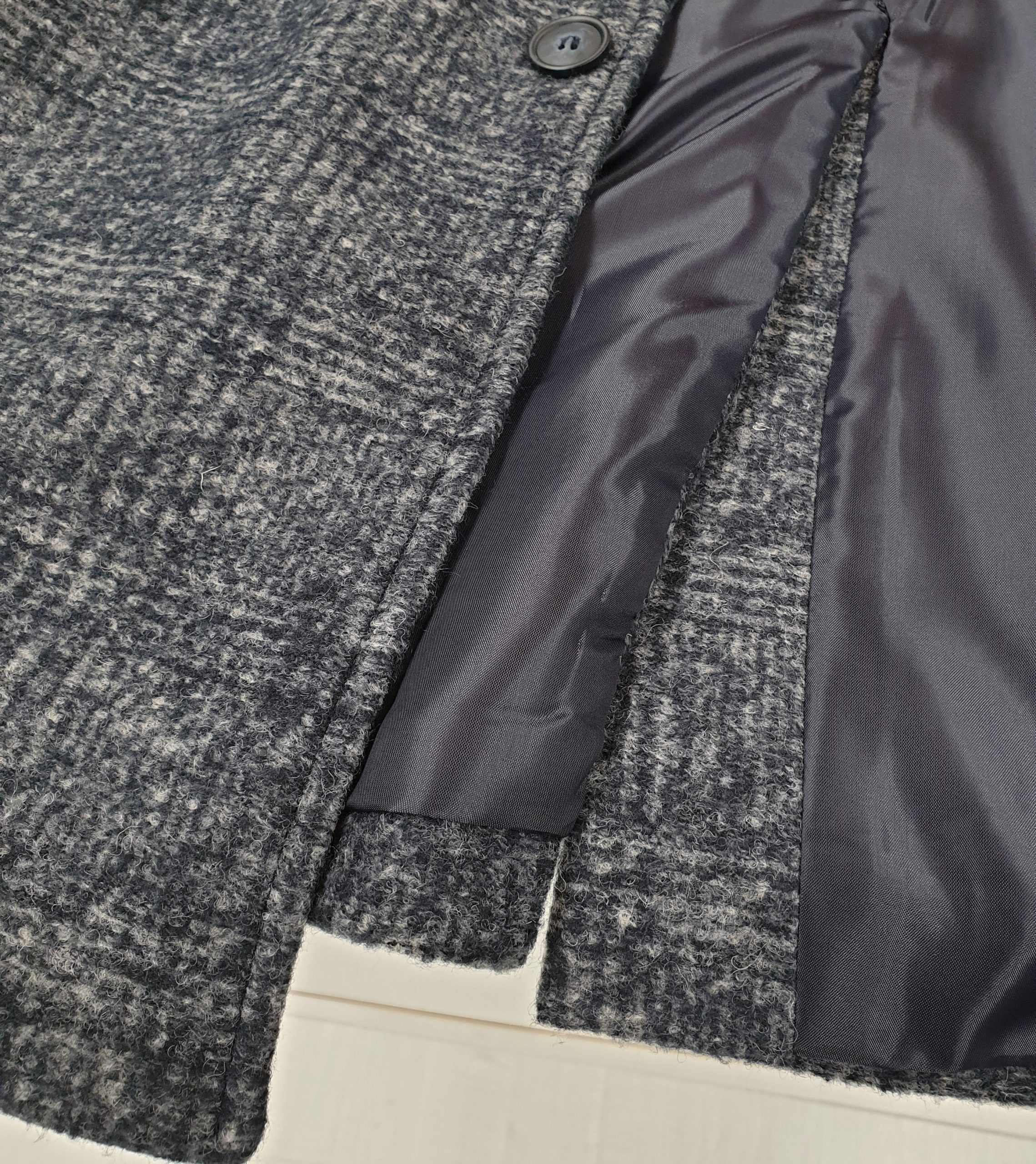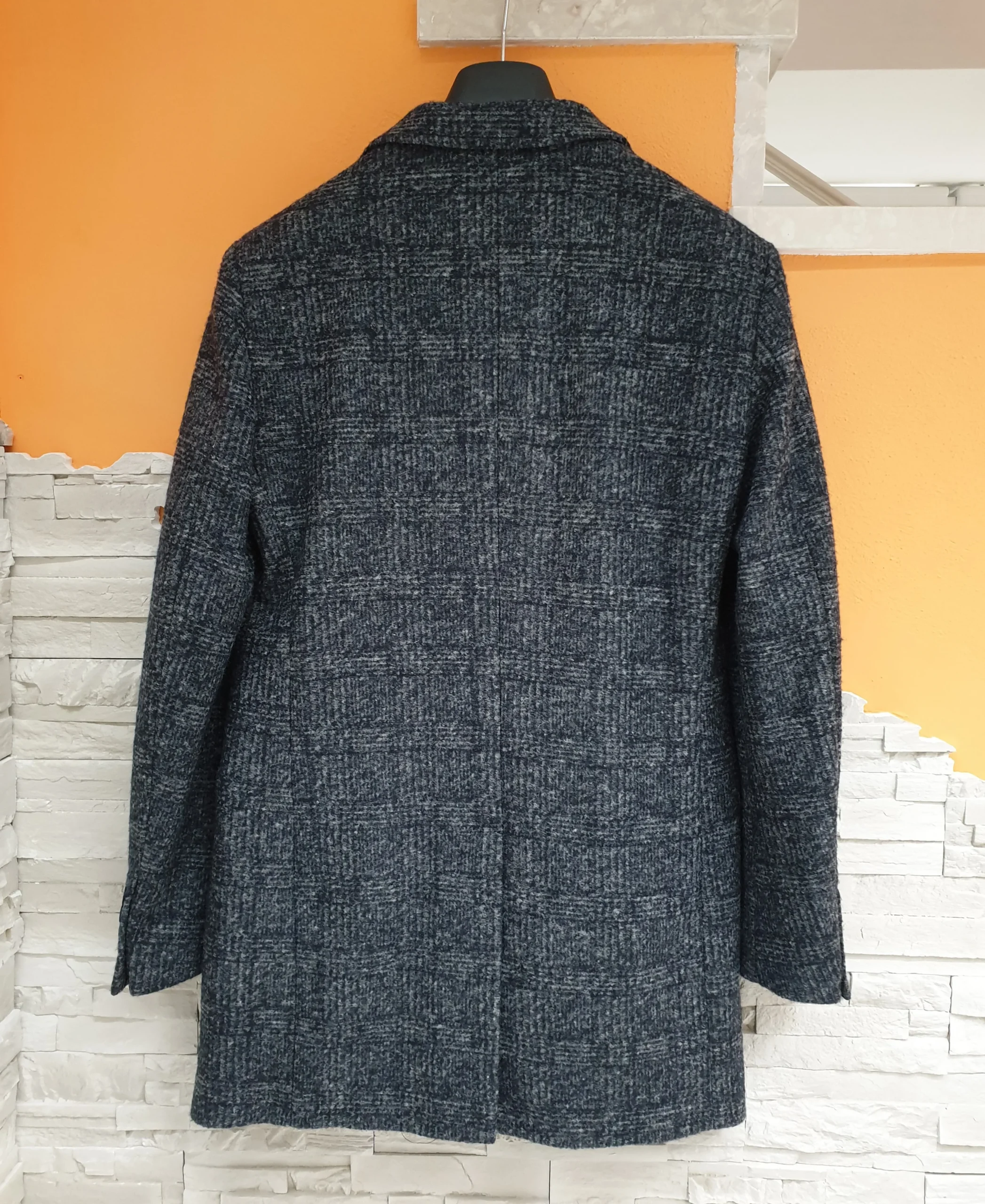 Cappotto check grigio/blu con tre bottoni, spacchetto retro, interno foderato.