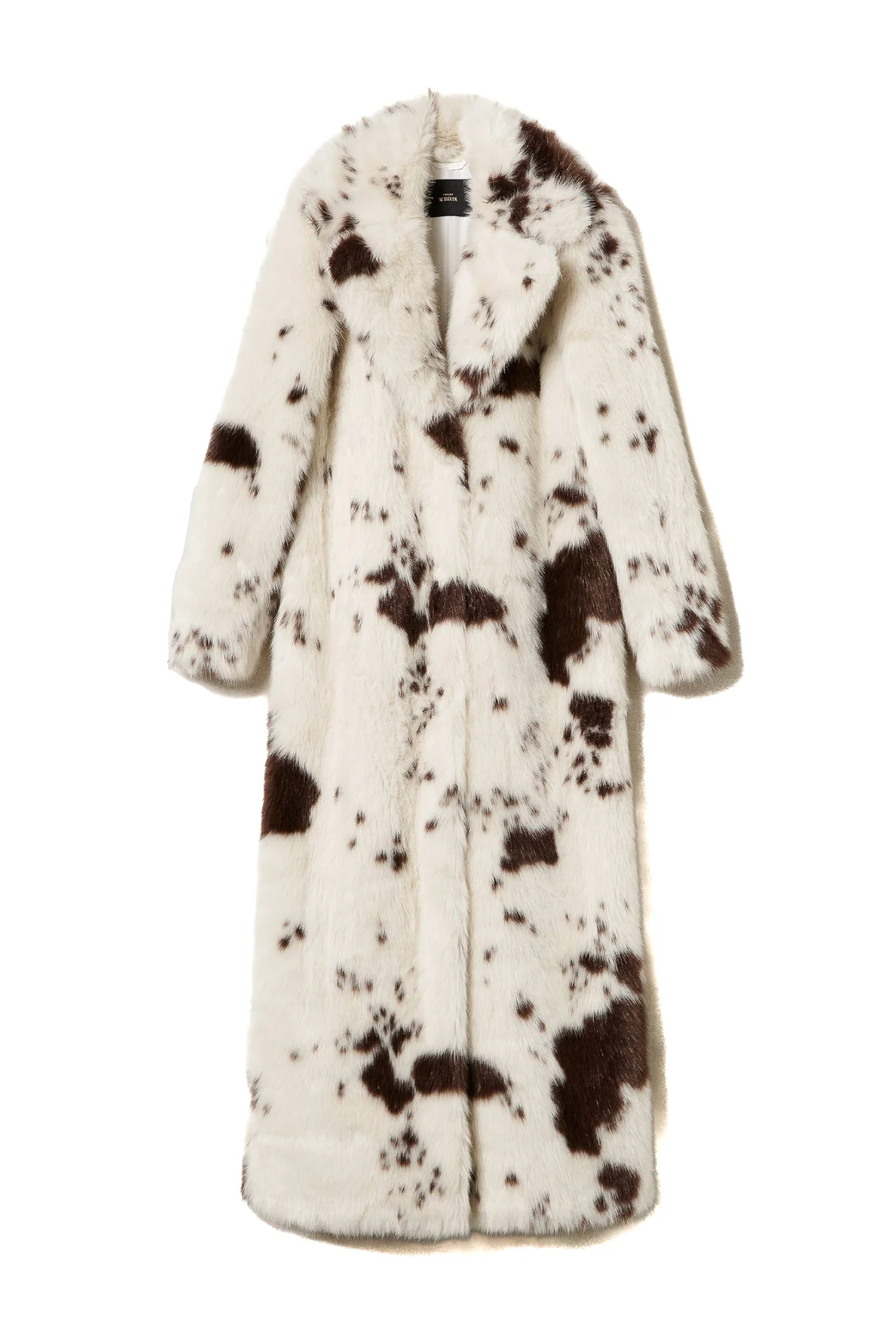 Cappotto lungo collezione Actitude in pelliccia sintetica con stampa animalier a macchie, revers ampi, chiusura monopetto con ganci nascosti, tasche laterali, spacco alto al centro dietro, linea dritta.