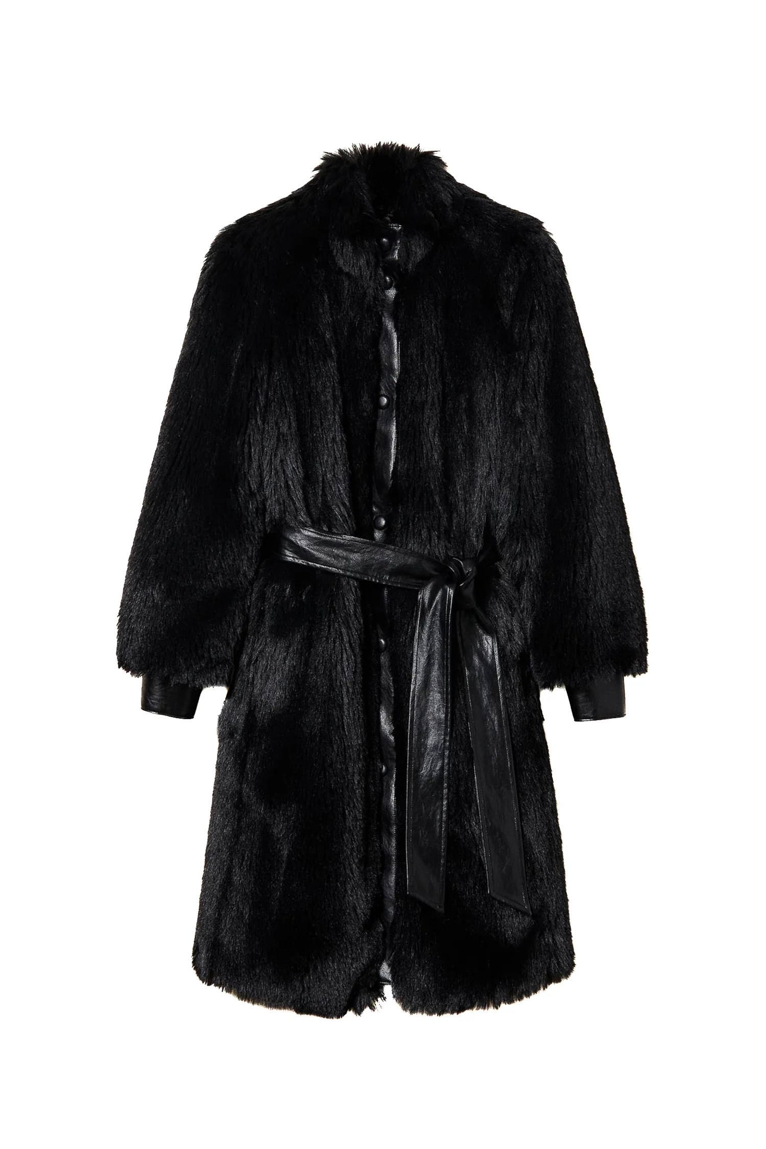 Dai carattere al tuo stile con il cappotto midi in pelliccia sintetica rifinito in similpelle in tinta. È costruito seguendo la confezione tipica dei pellicciai tradizionali con cuciture invisibili e una portata leggera. Ha collo montante, la chiusura con bottoni a pressione ricoperti, le tasche ai fianchi, maniche lunghe con polsini, foderato. Lo puoi regolare in vita con la cintura effetto pelle in coordinato. Morbido e avvolgente sarà il capo cult dei tuoi look day-to-night.