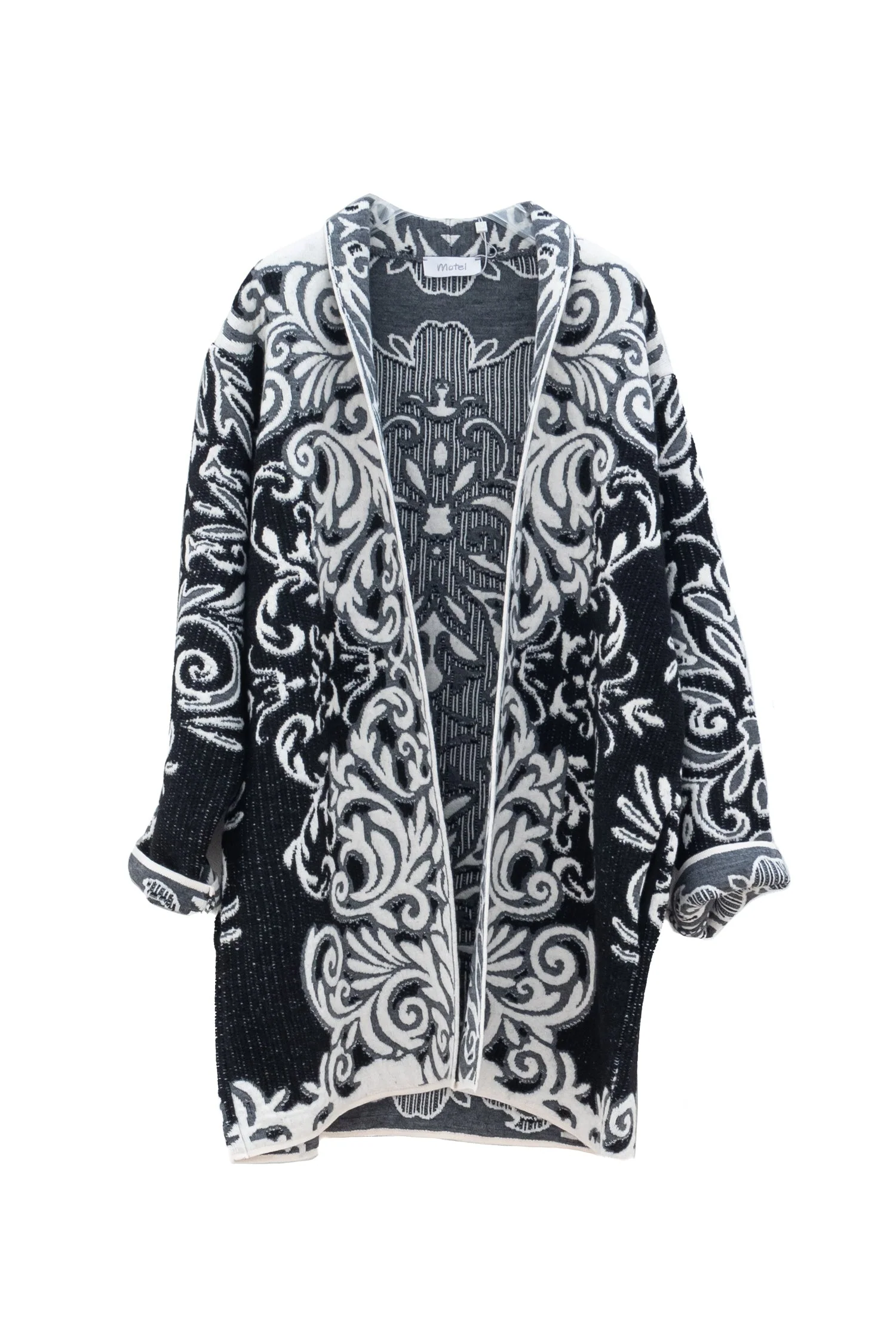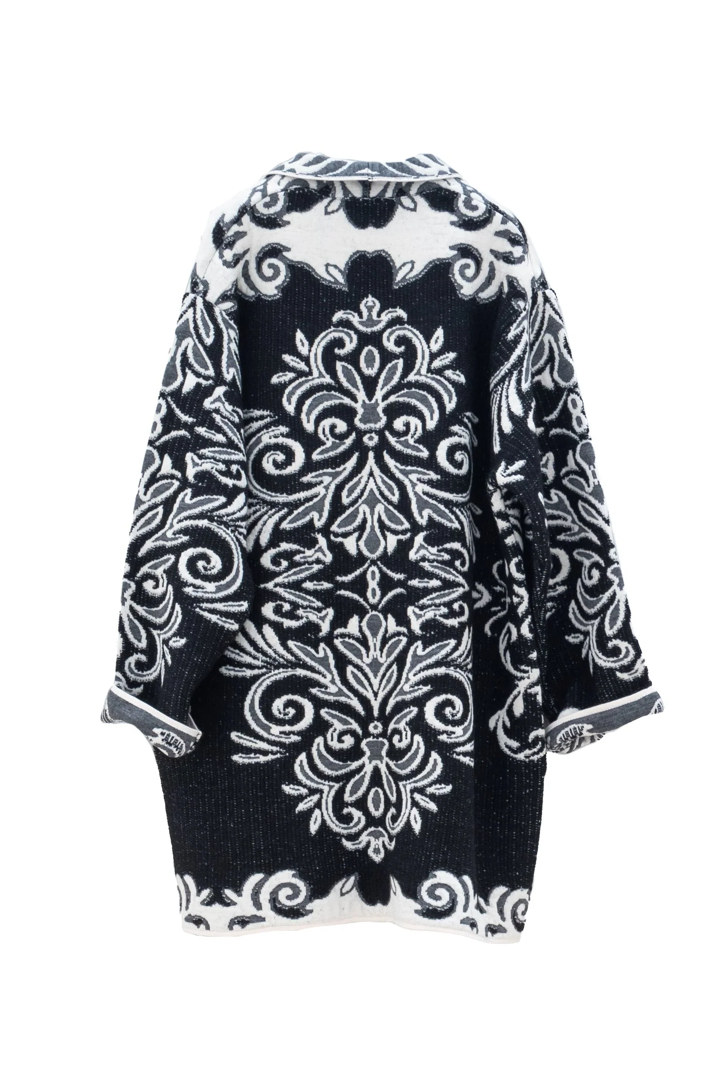 Scultoreo, grafico, scenografico. Questo cappotto lungo donna, realizzato in misto acrilica, viscosa, lana e alpaca, si distingue per il suo motivo barocco in bianco e nero, che avvolge la silhouette con ricami ornamentali e simmetrie floreali dal forte impatto visivo. Il colore nero fa da base a un pattern che richiama l’estetica teatrale e decorativa, perfetto per chi ama distinguersi con eleganza.