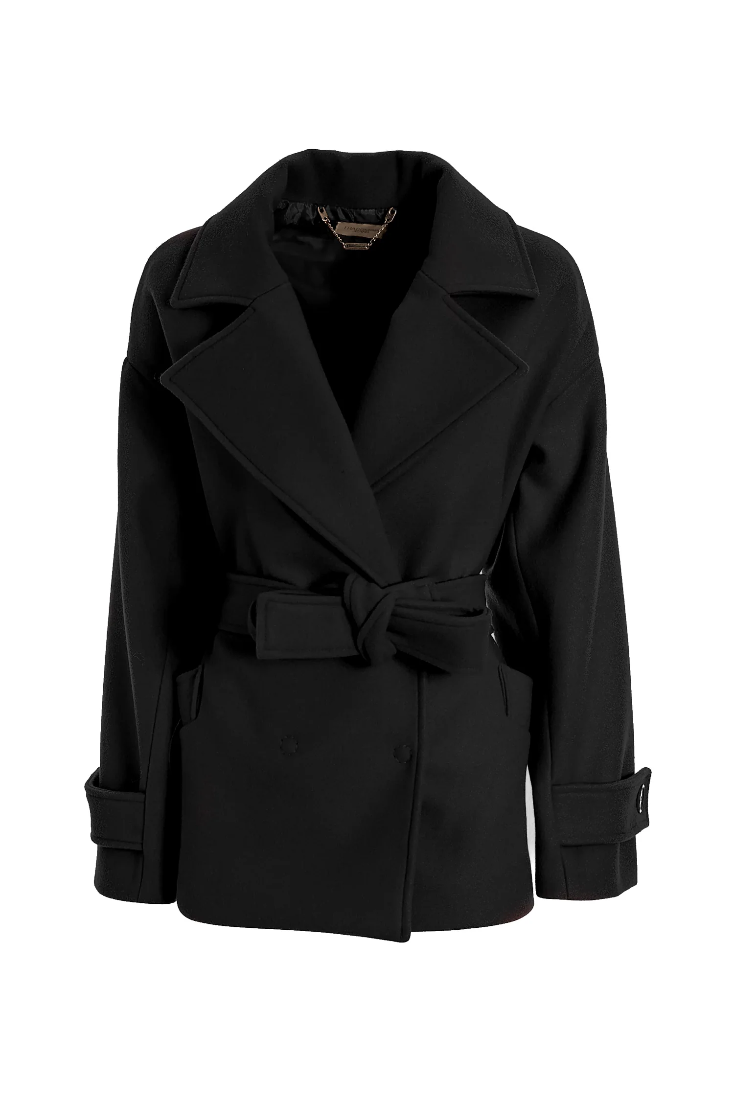 Cappotto regular in panno, doppio petto, revers grande, cintura applicata, tasche sul davanti, e con manica lunga.