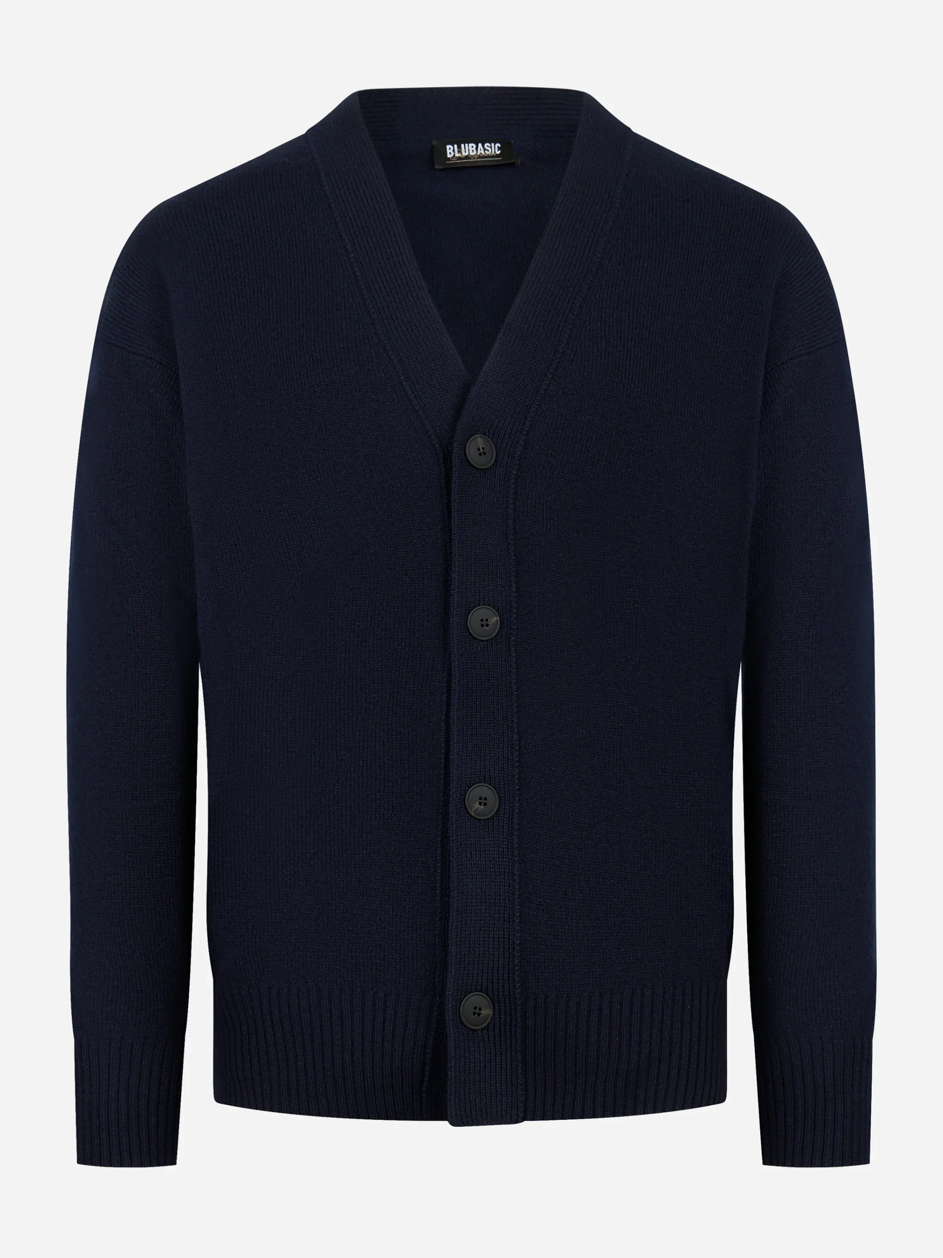 ITEM INFO Cardigan con scollo a V e chiusura a bottoni Maglia a costa compatta effetto geelong Spalla confortevole e linea regolare Bordi a costine su fondo e polsi Manica lunga, peso medio Tono blu facile da abbinare Essenziale del guardaroba maschile firmato BLUBASIC Composizione: 100% lana vergine