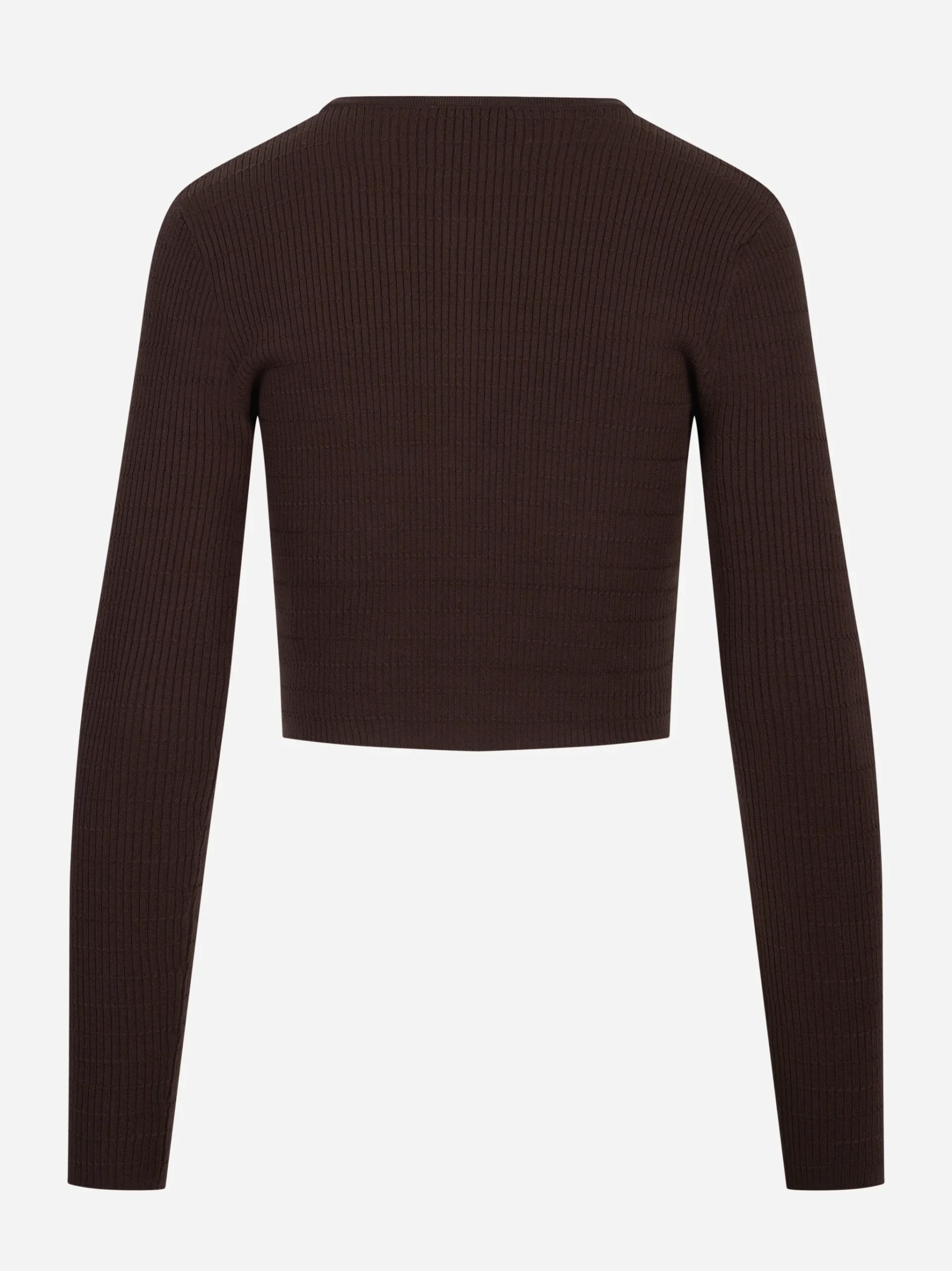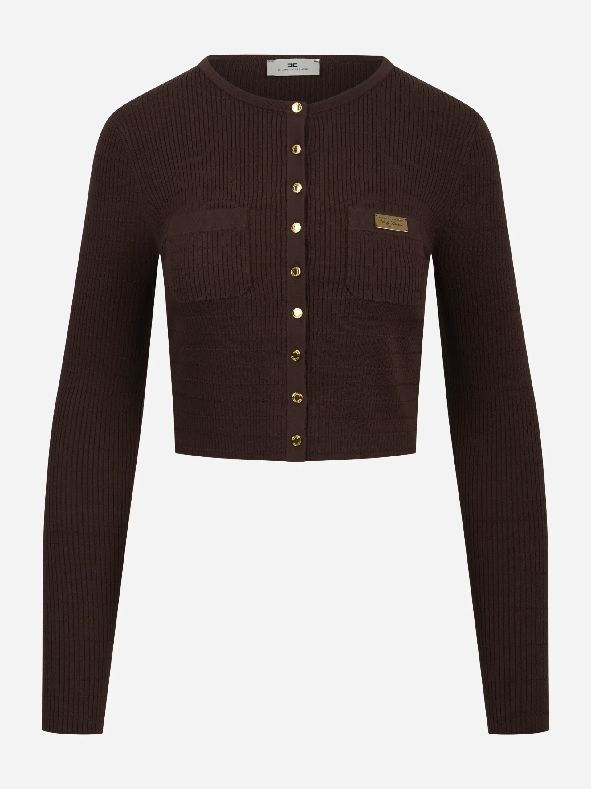 ITEM INFO Cardigan in maglia marrone a micro trecce Linea cropped con scollo tondo Lavorazione a costine/micro trecce effetto texture Abbottonatura frontale con bottoni dorati Taschini applicati sul petto con placchetta logo Perfetto da abbinare a look ton-sur-ton Composizione: 64% lyocell, 20% poliammide, 16% seta. Made in Italy