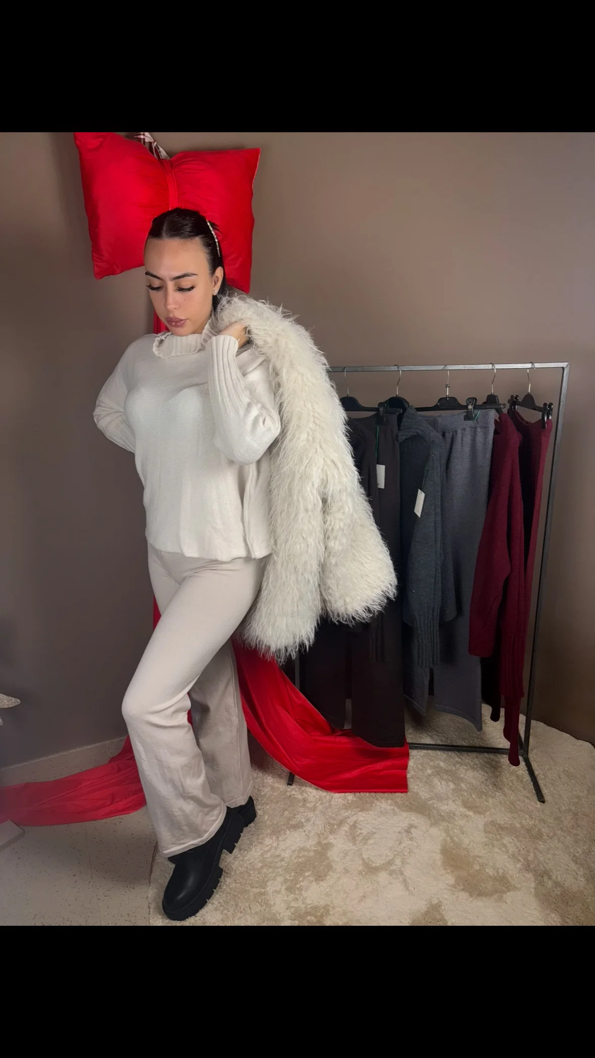 Coordinato composto da maglione mezzo collo vestibilitร over e pantalone gamba dritta , taglia unica.
