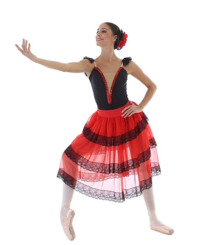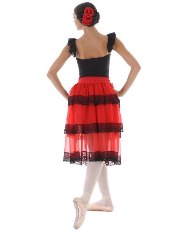 Body con gonna a balze ideale per il tuo Don Chisciotte! Body realizzato in lycra, scollo a cuore con veletta carne, spalline carne con rouge di pizzo, passamaneria sullo scollo. Schiena con taglio dritto. Gonna separata composta da tre balze in scintilla decorate con pizzo, montata su fascia.